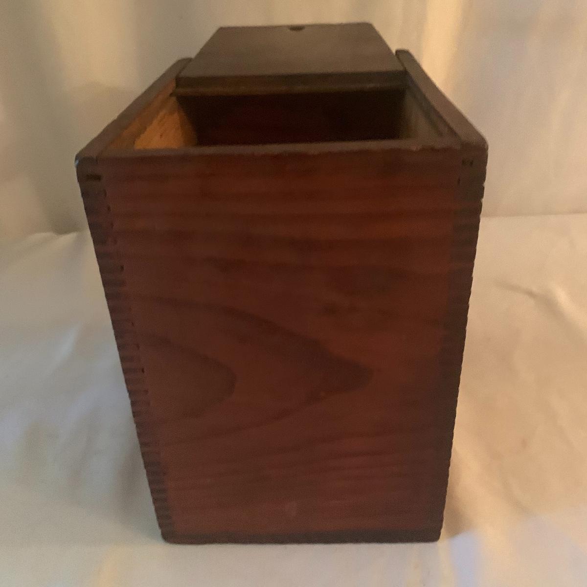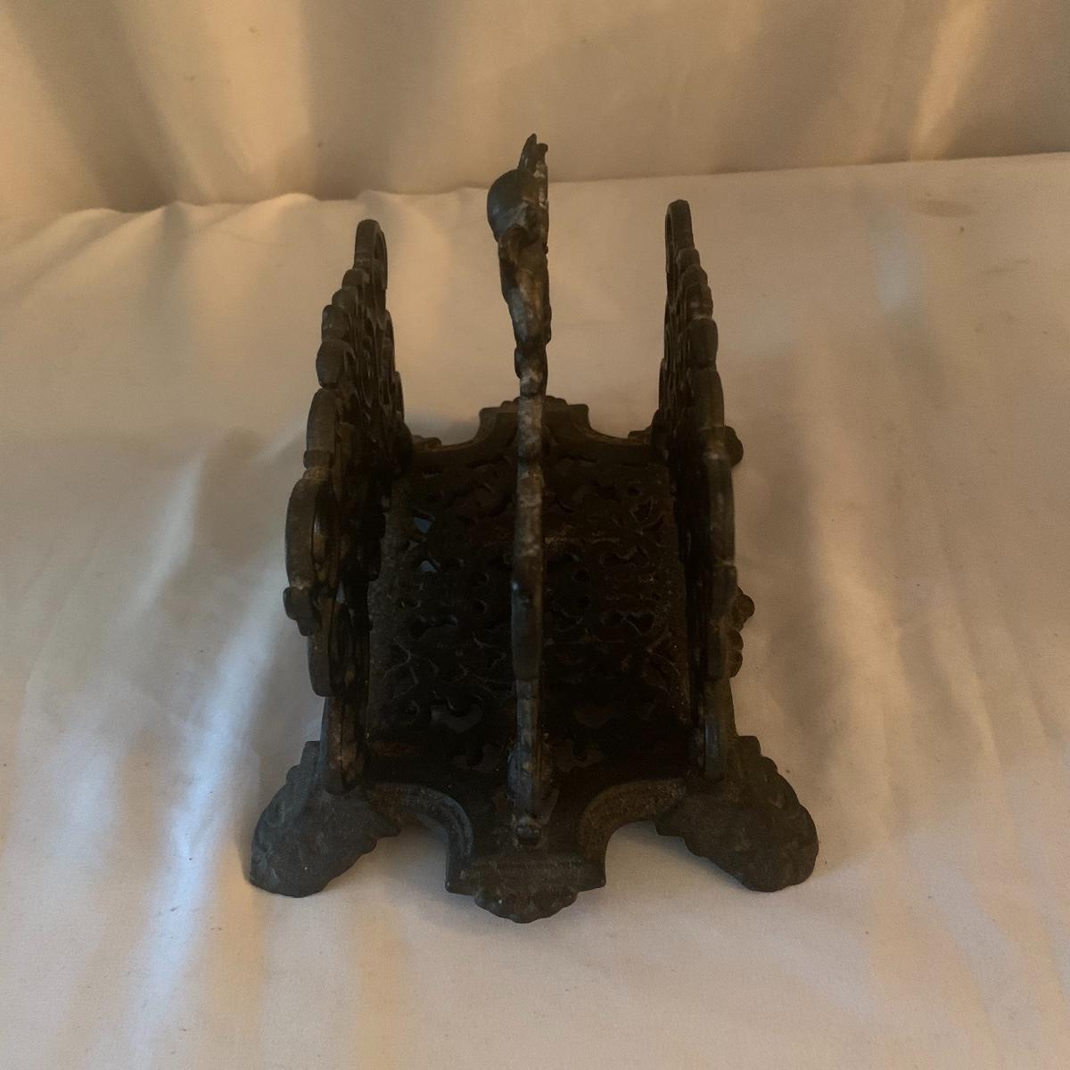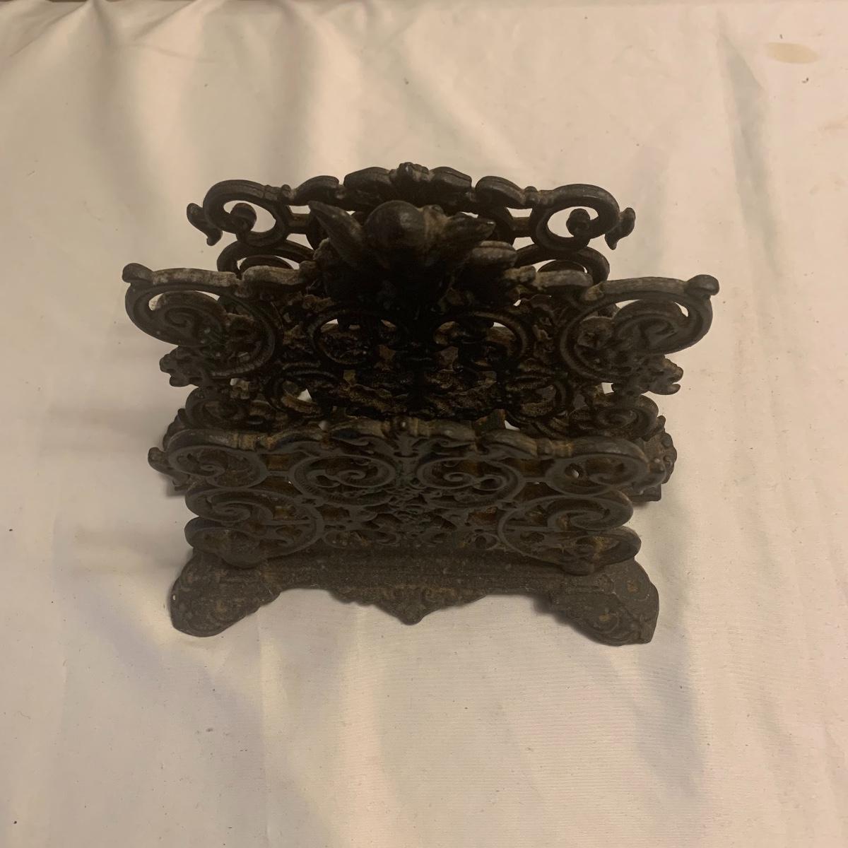 Vintage wooden recipe box measuring 8” wide X 5” deep X 8” tall in good condition. Also included is this iron napkin holder featuring a cherub and intricate designs. Both are in good condition.