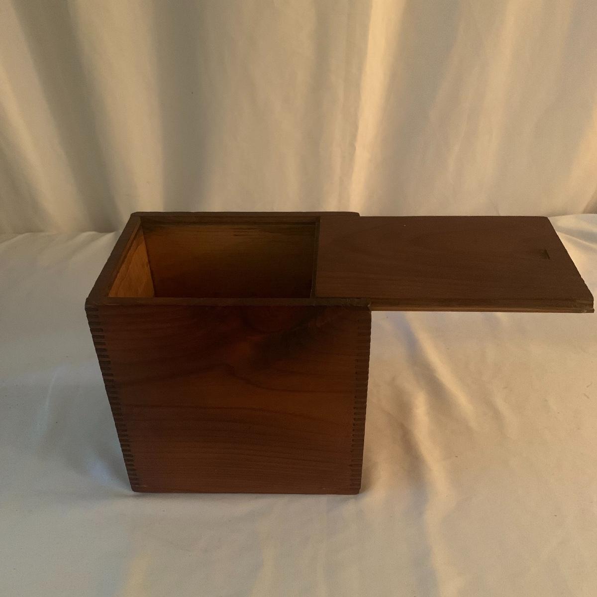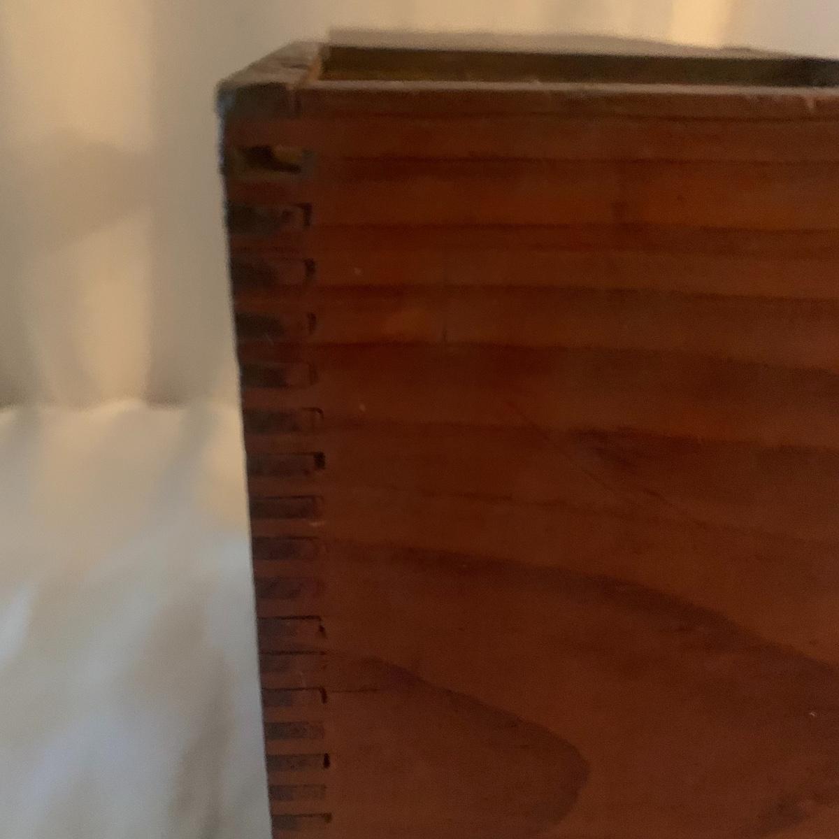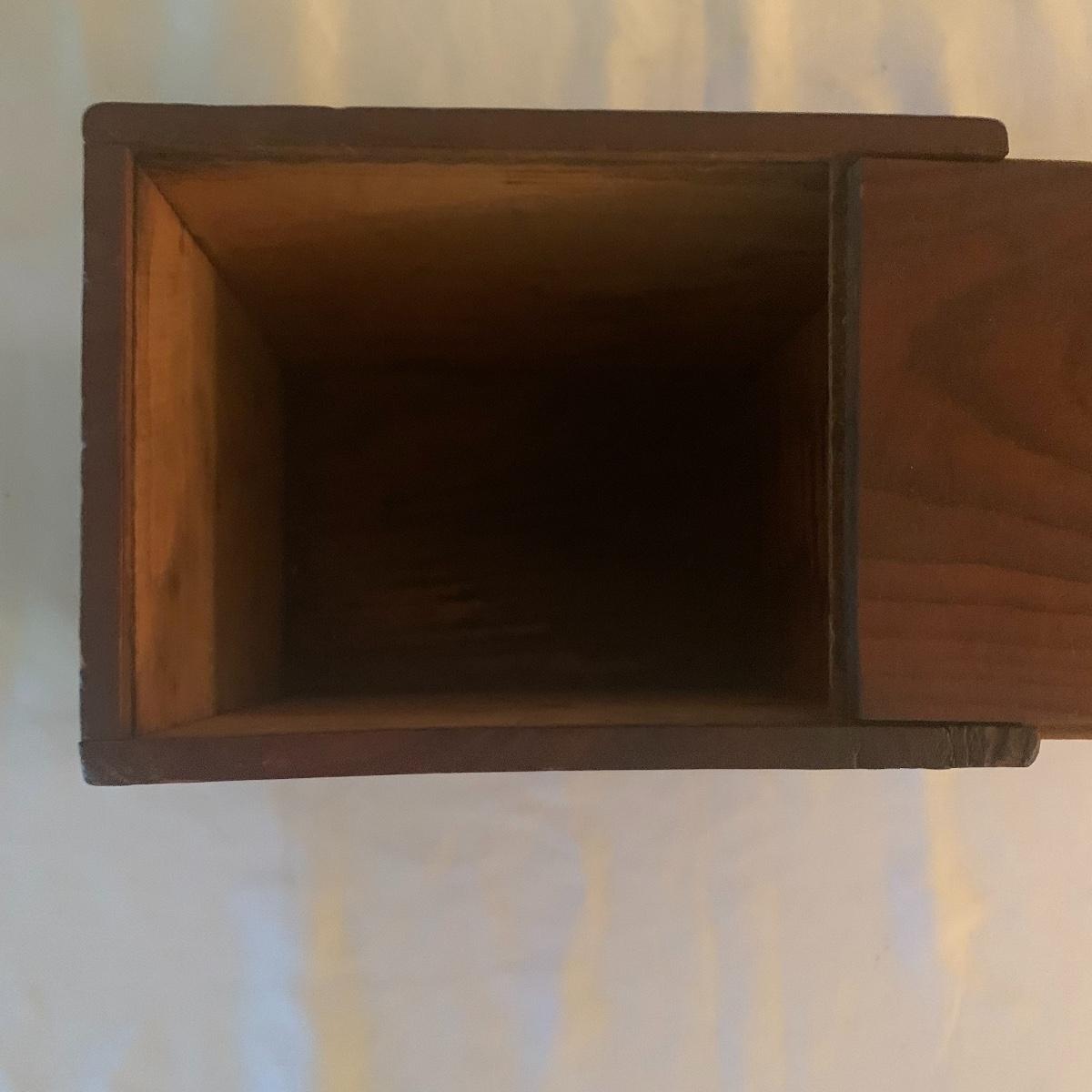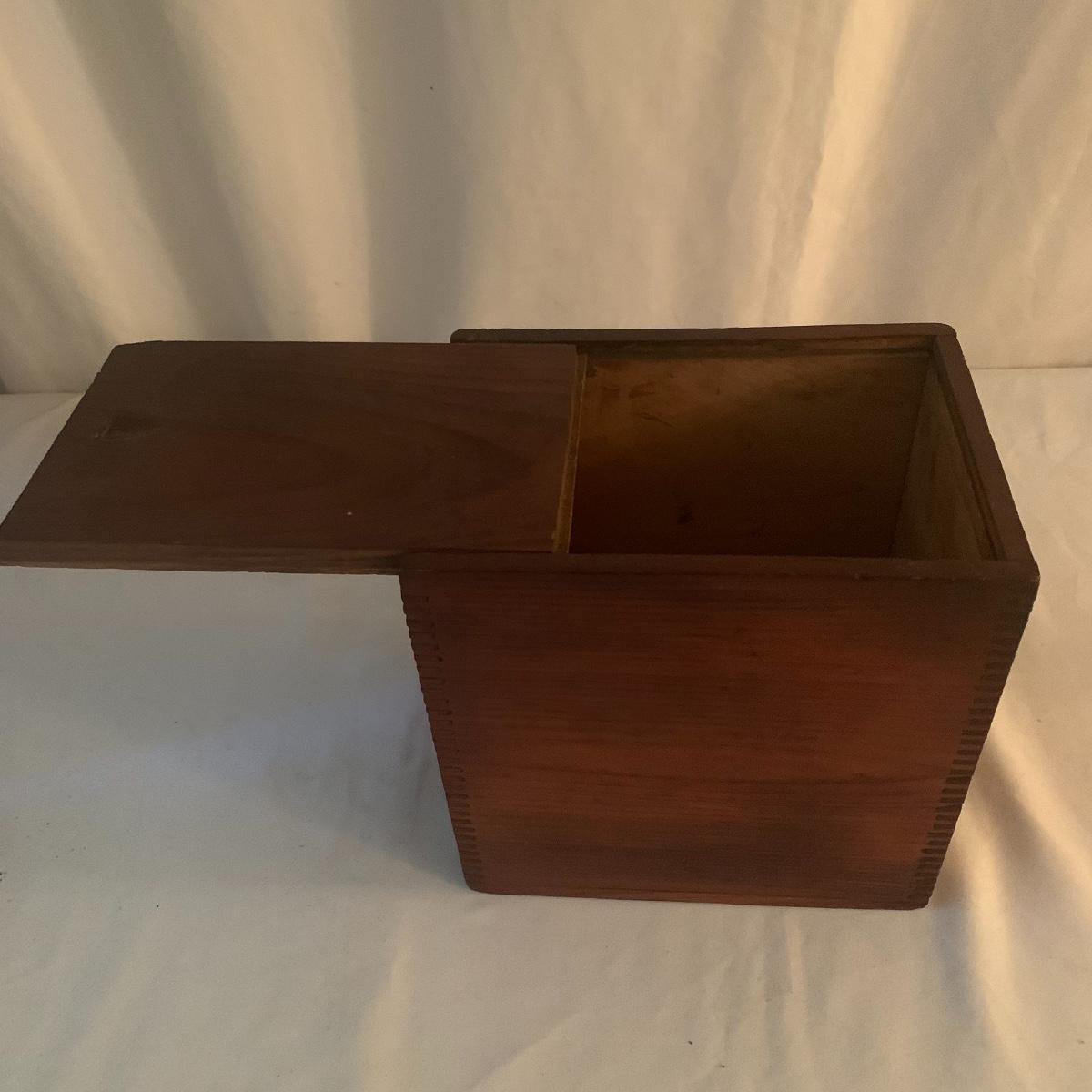 Vintage wooden recipe box measuring 8” wide X 5” deep X 8” tall in good condition. Also included is this iron napkin holder featuring a cherub and intricate designs. Both are in good condition.