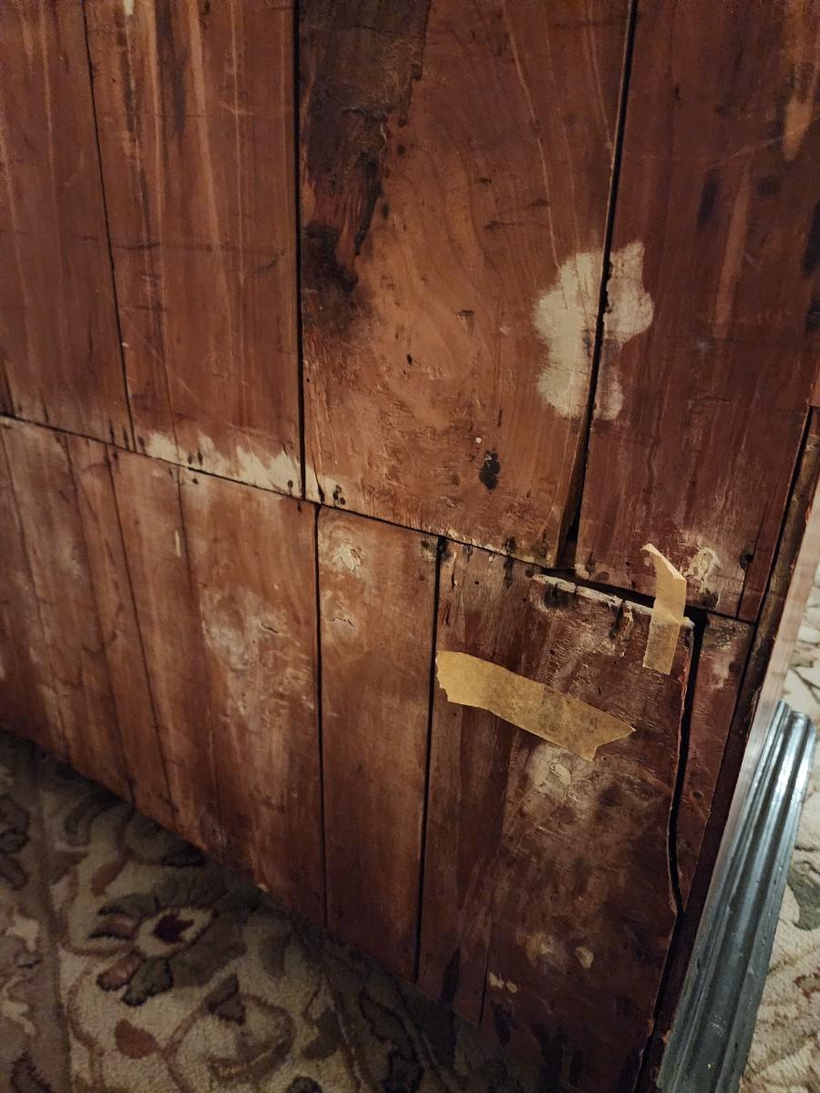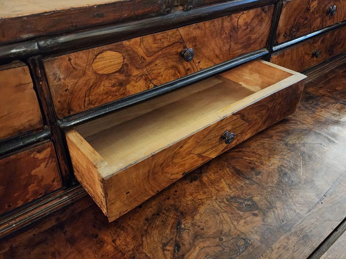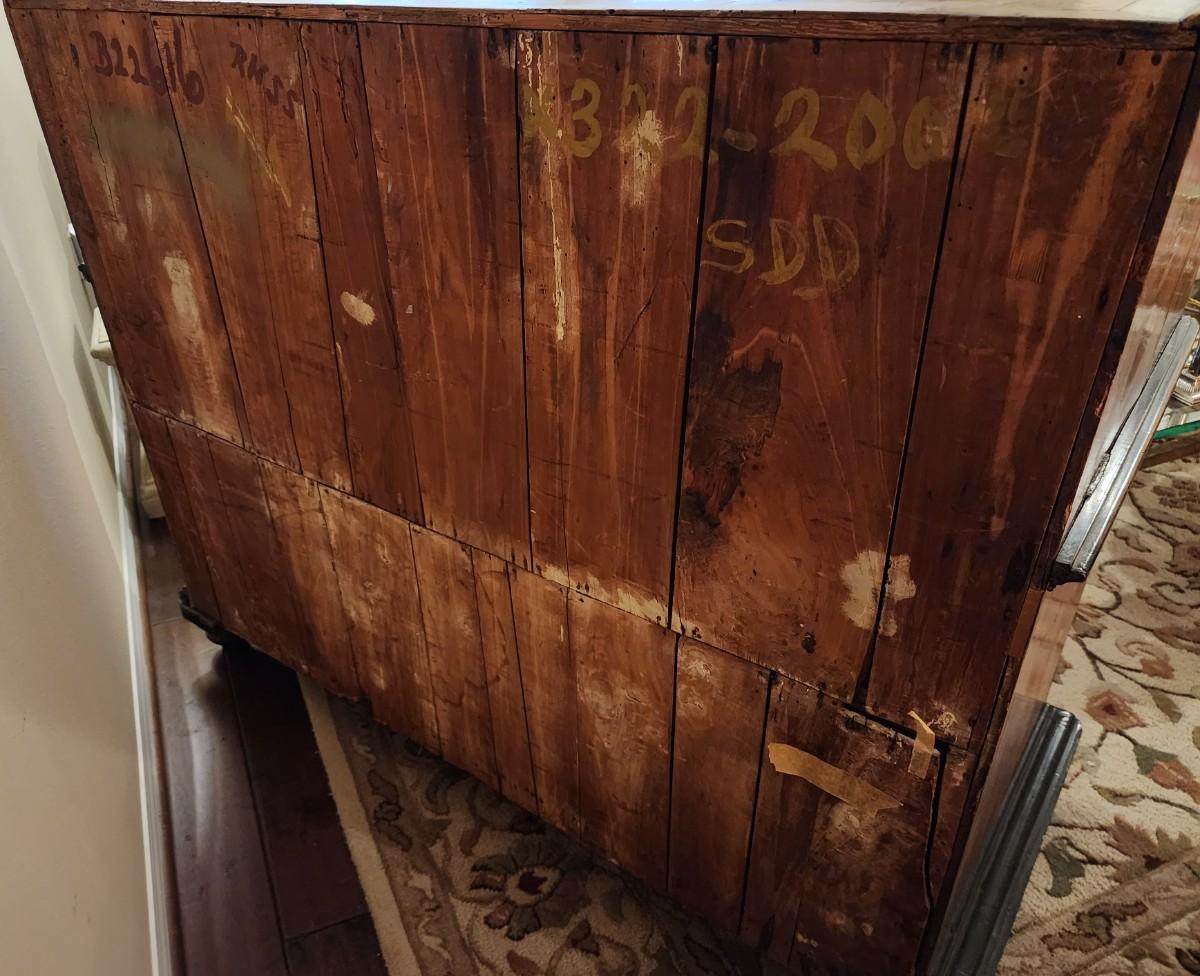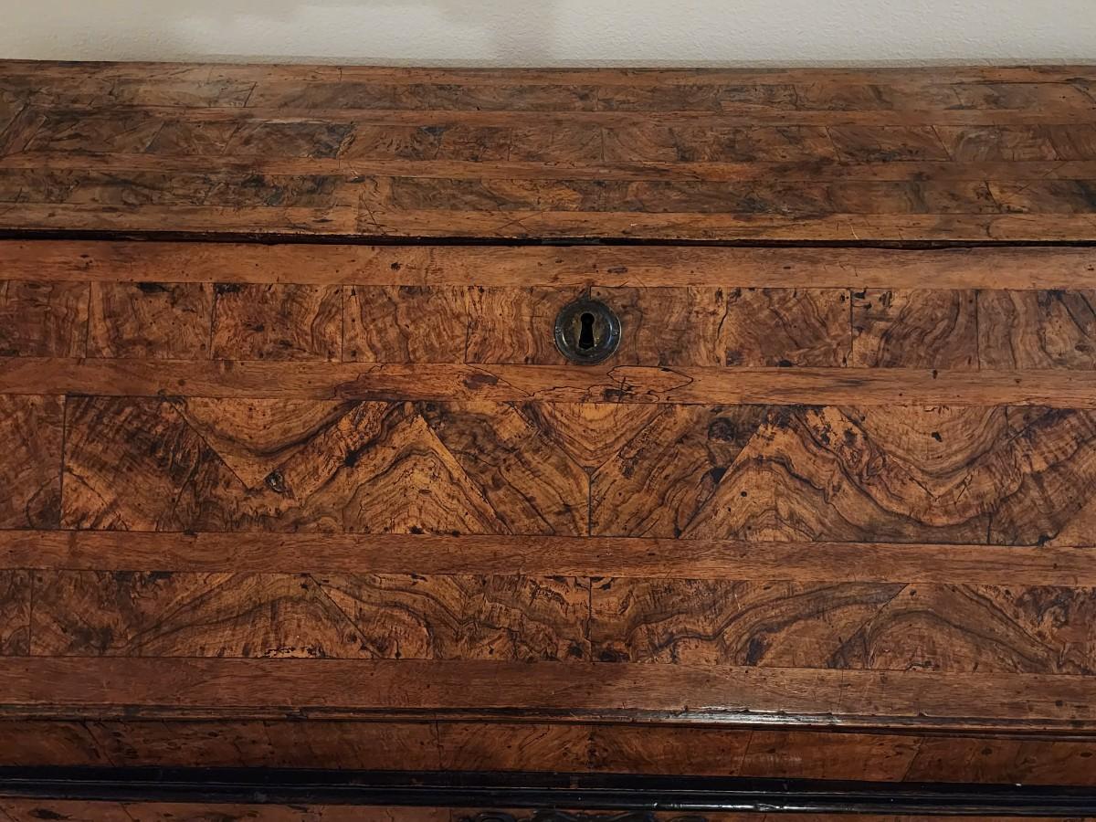 Solid metal hardware, pull out arms to lower door front. Vintage item, appears to be made with reclaimed wood. Very pretty burl inlay design. Drawers are rough hewn dove tail. All drawers are lined inside with fabric and braided trim. 9 smaller drawers inside. Condition is good vintage reclaimed. See photos. Please ask any questions before bidding.