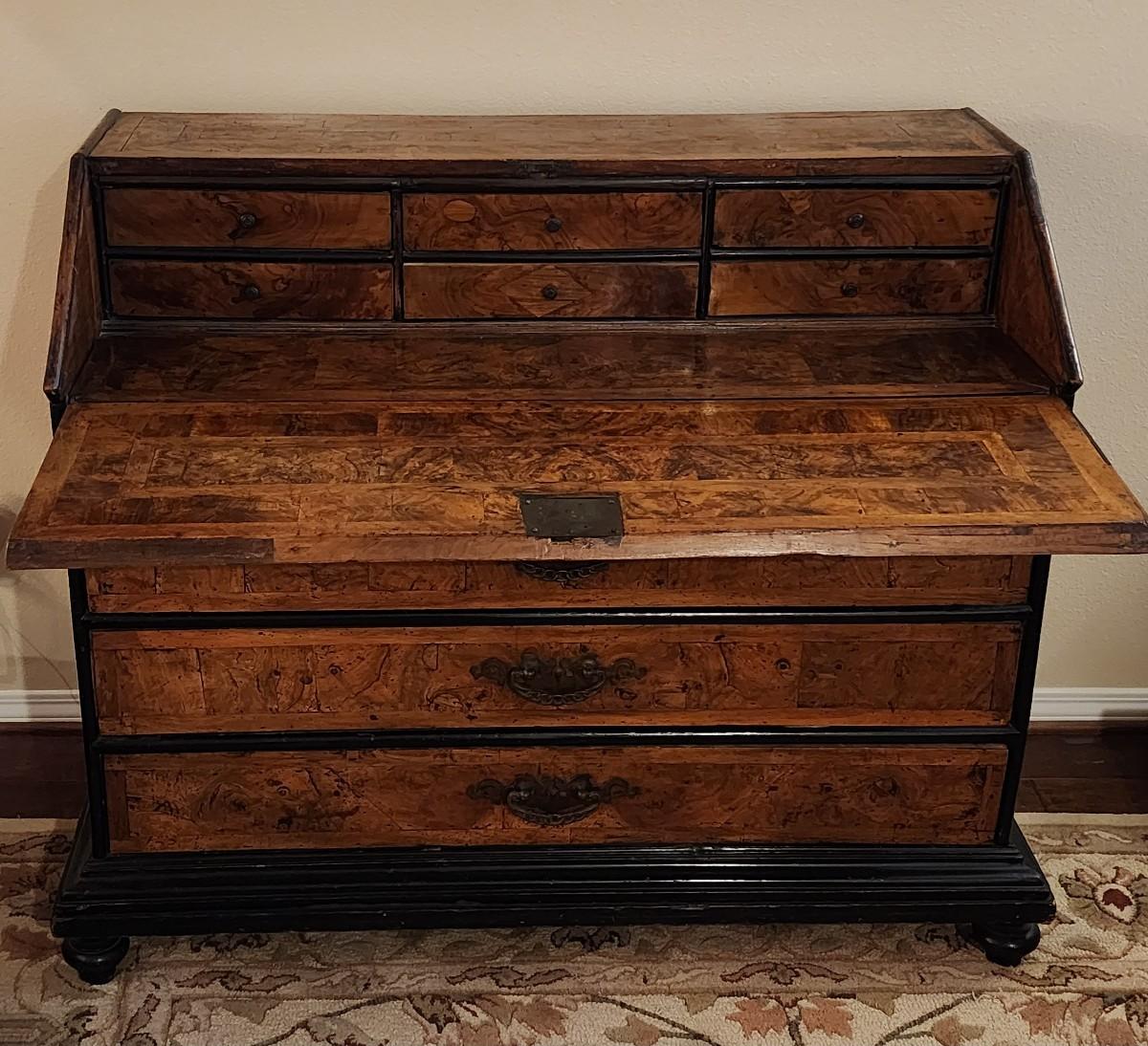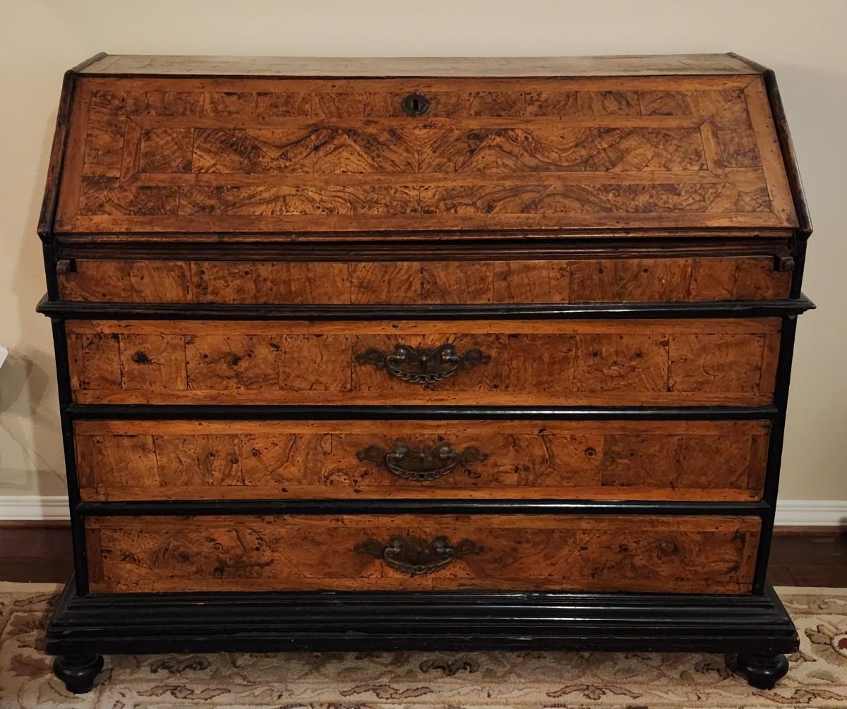Vintage Reclaimed Wood Burl Veneer Secretary Desk.