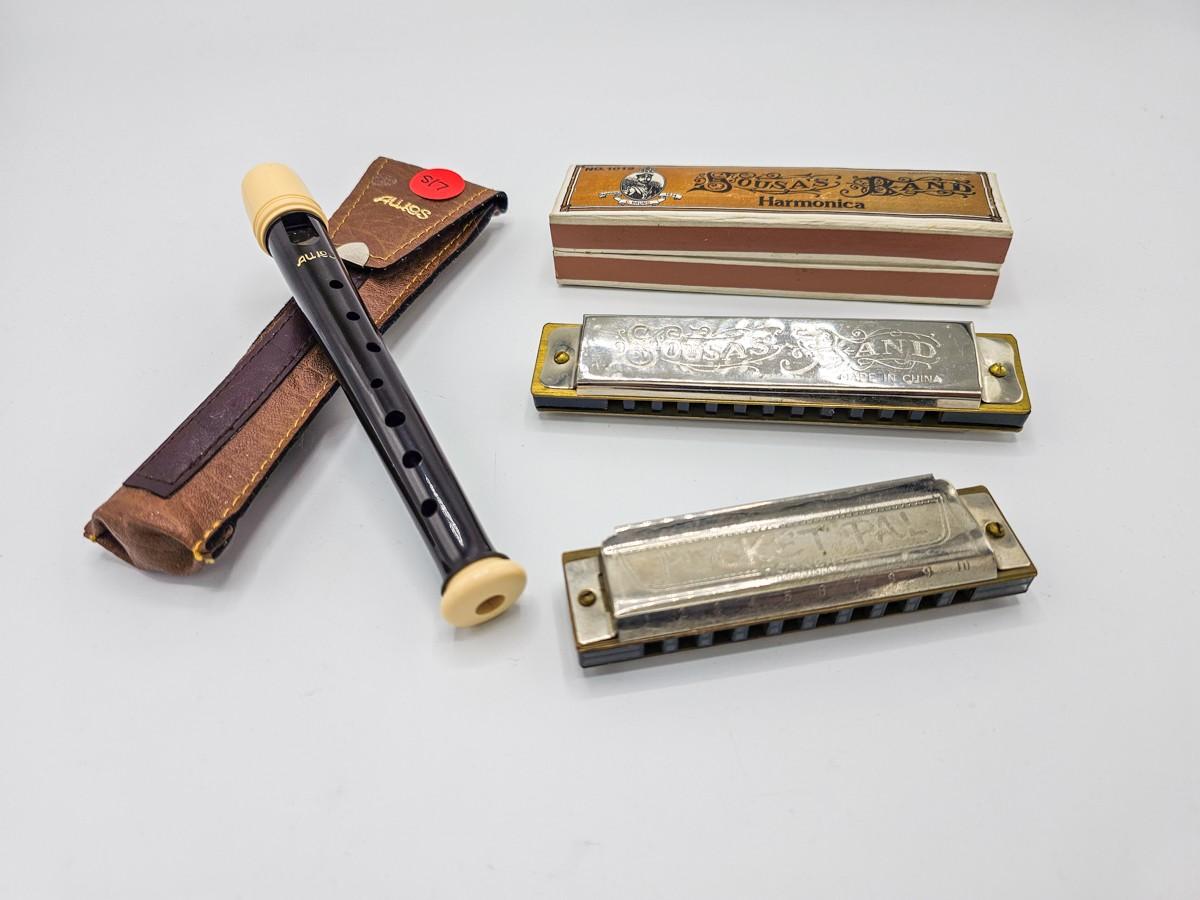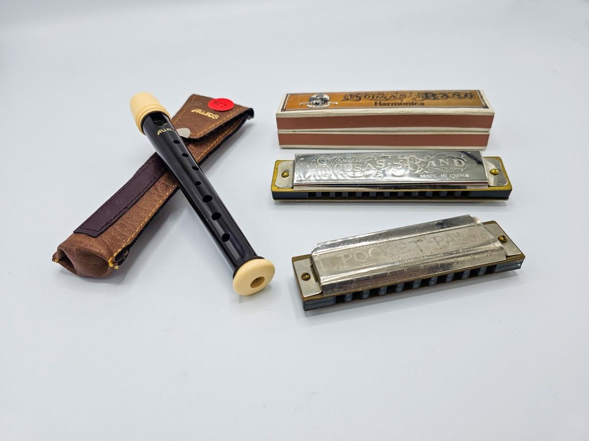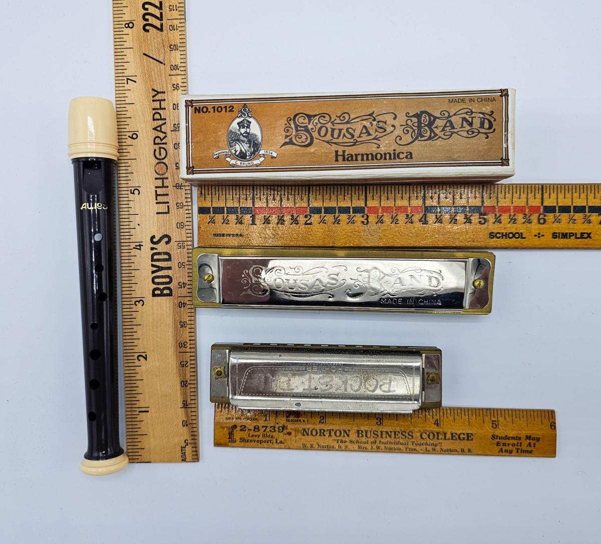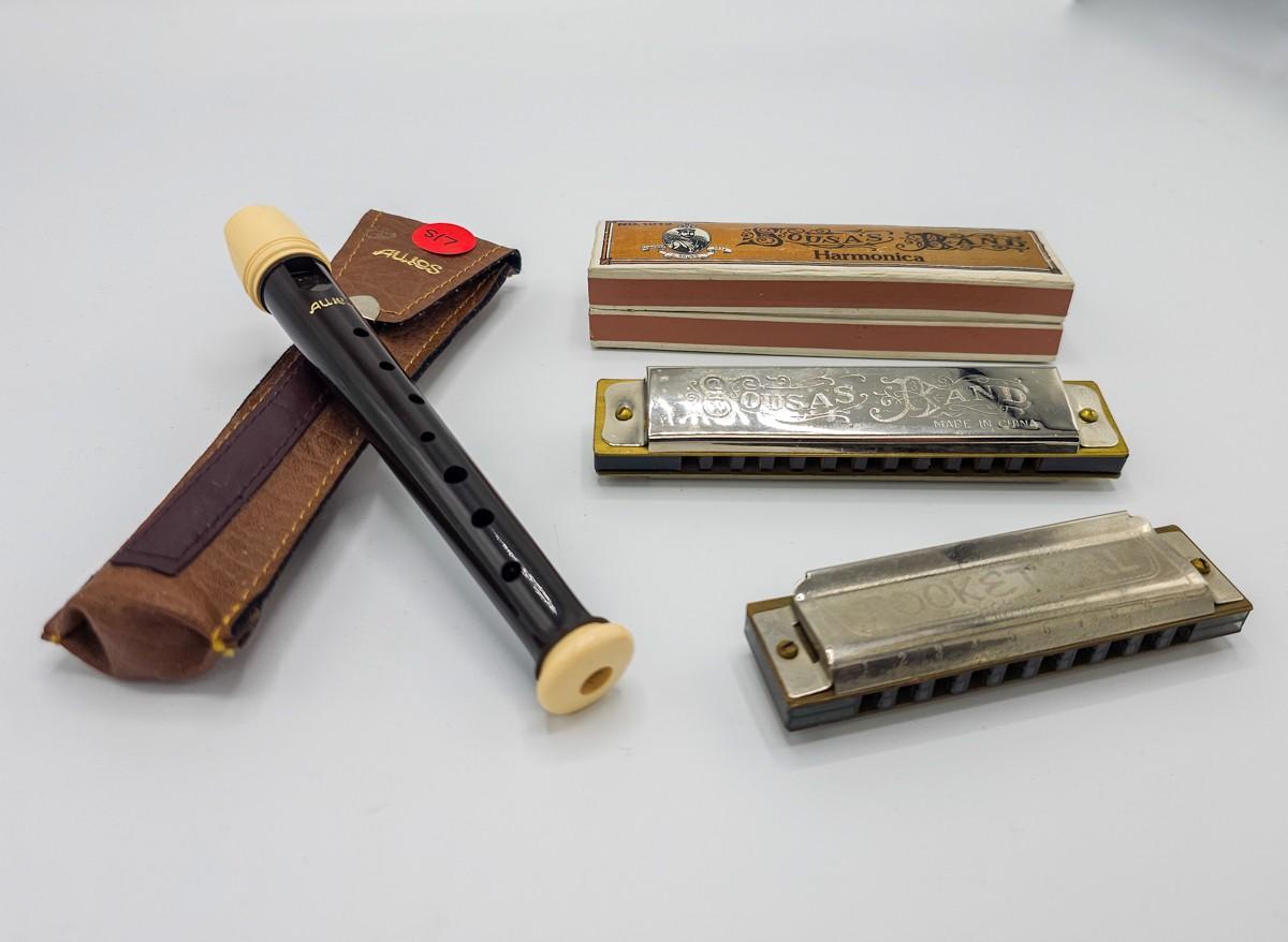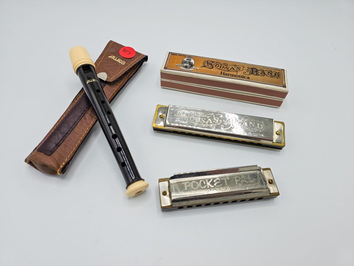 Vintage Aulos Japan 501S-E recorder, Sousa's Band 1012 harmonica, and Pocket Pal harmonica.