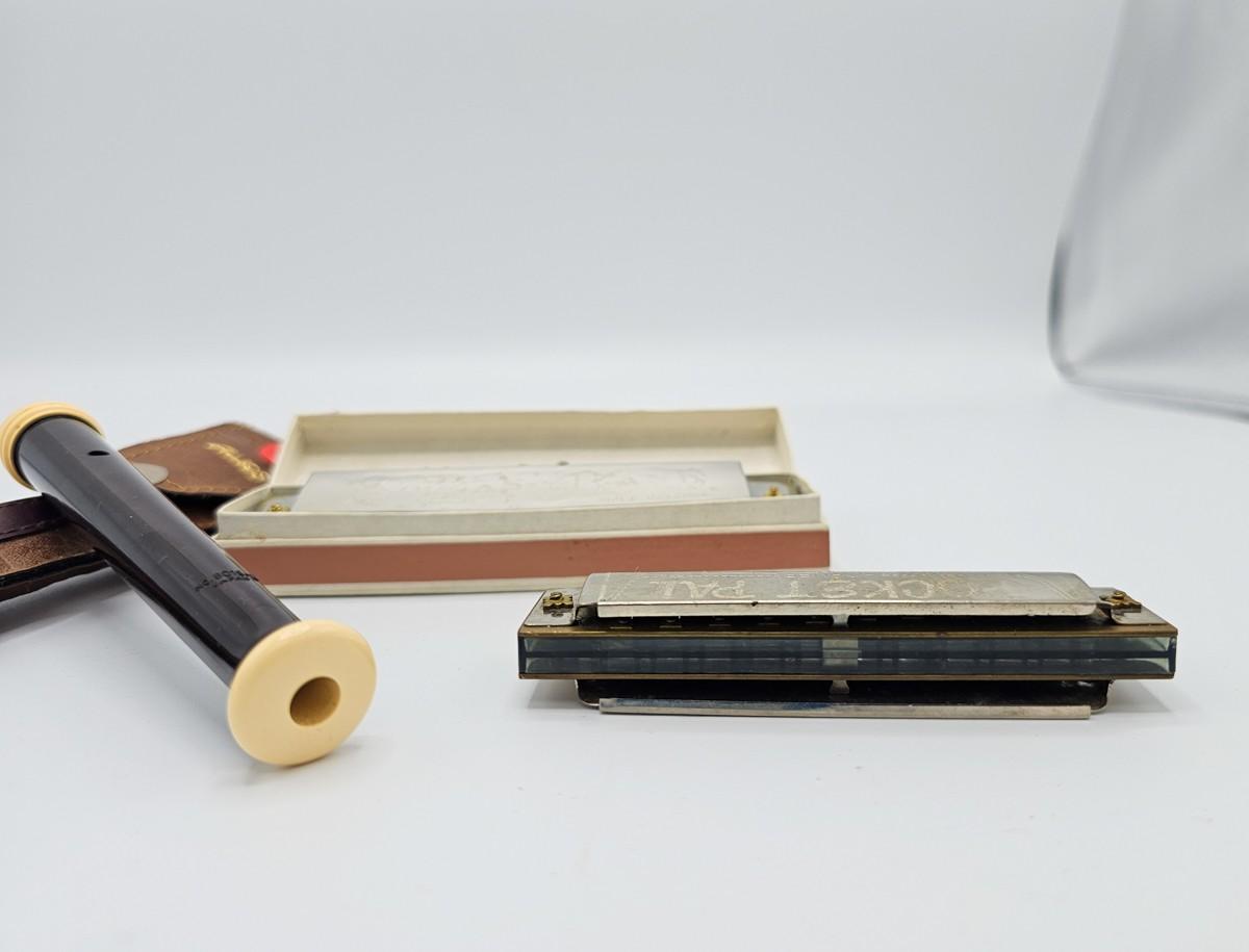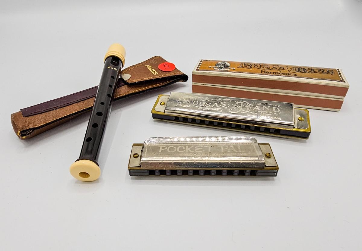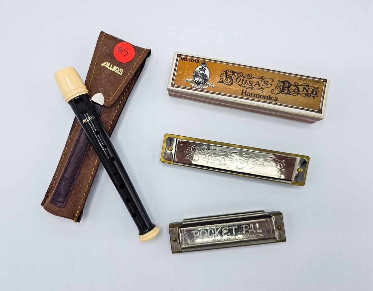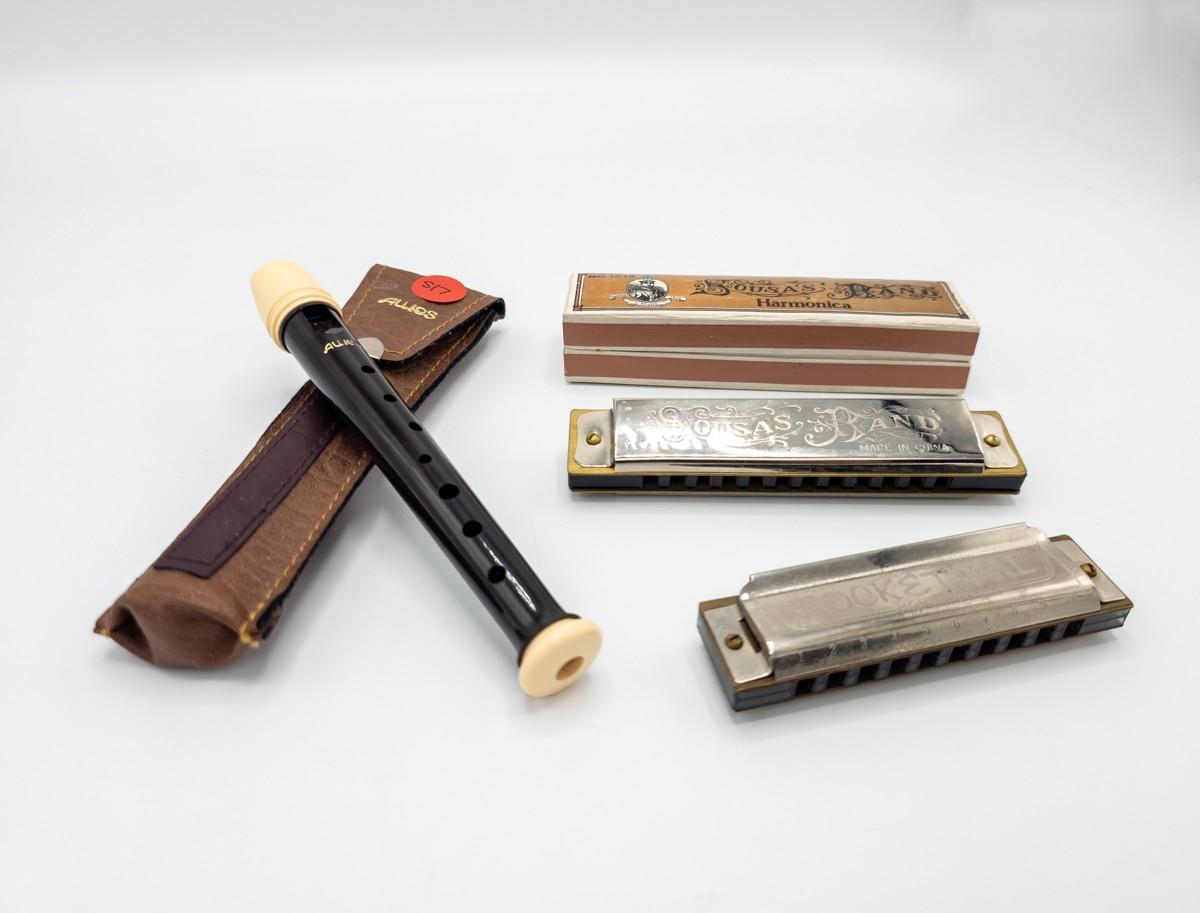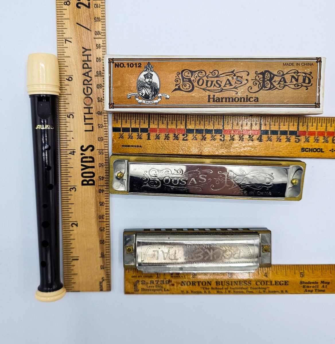 Vintage Aulos Japan 501S-E recorder, Sousa's Band 1012 harmonica, and Pocket Pal harmonica.