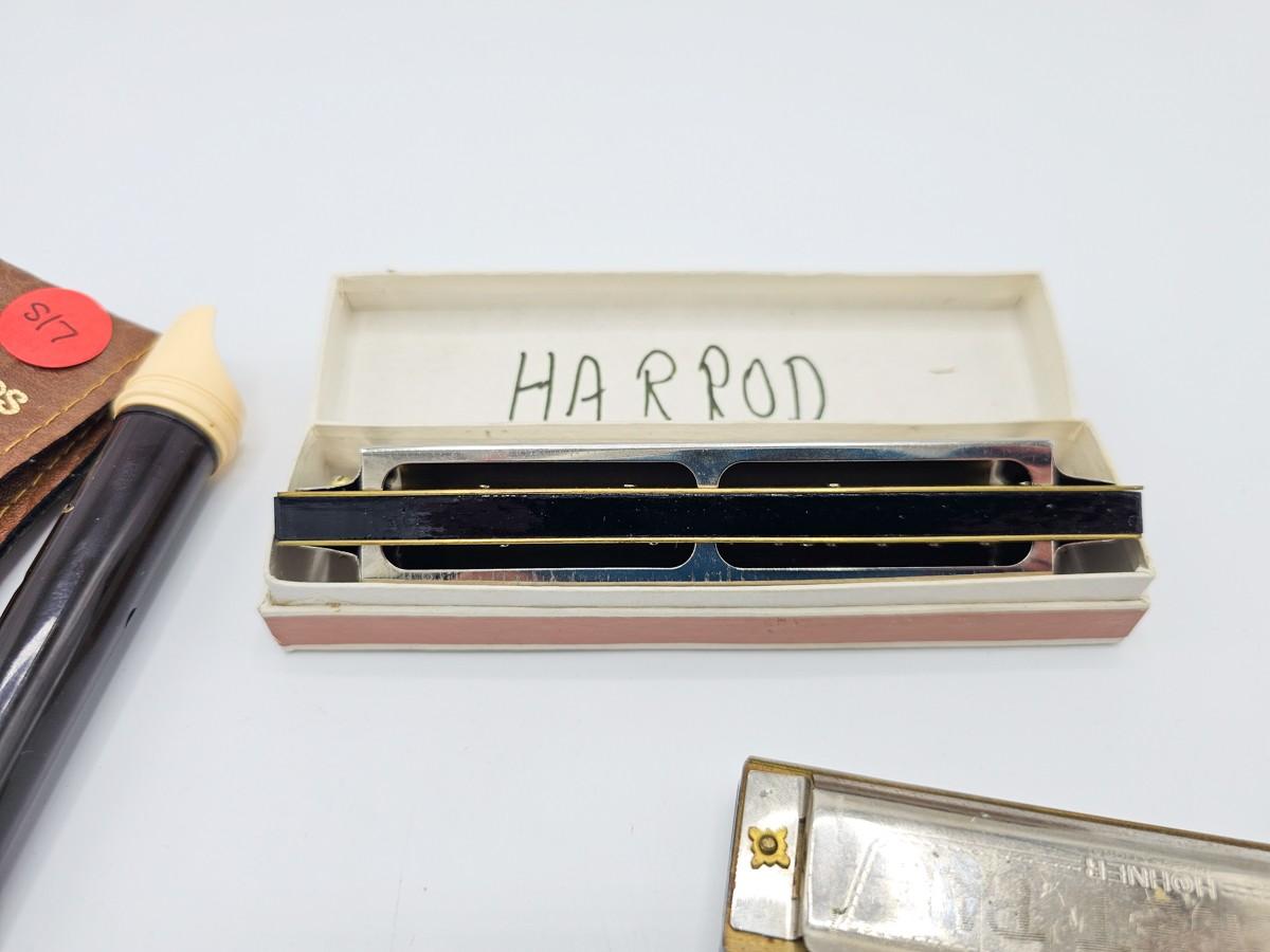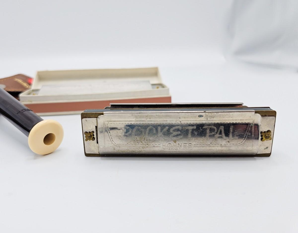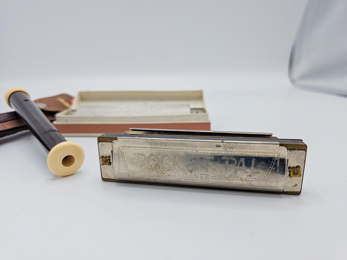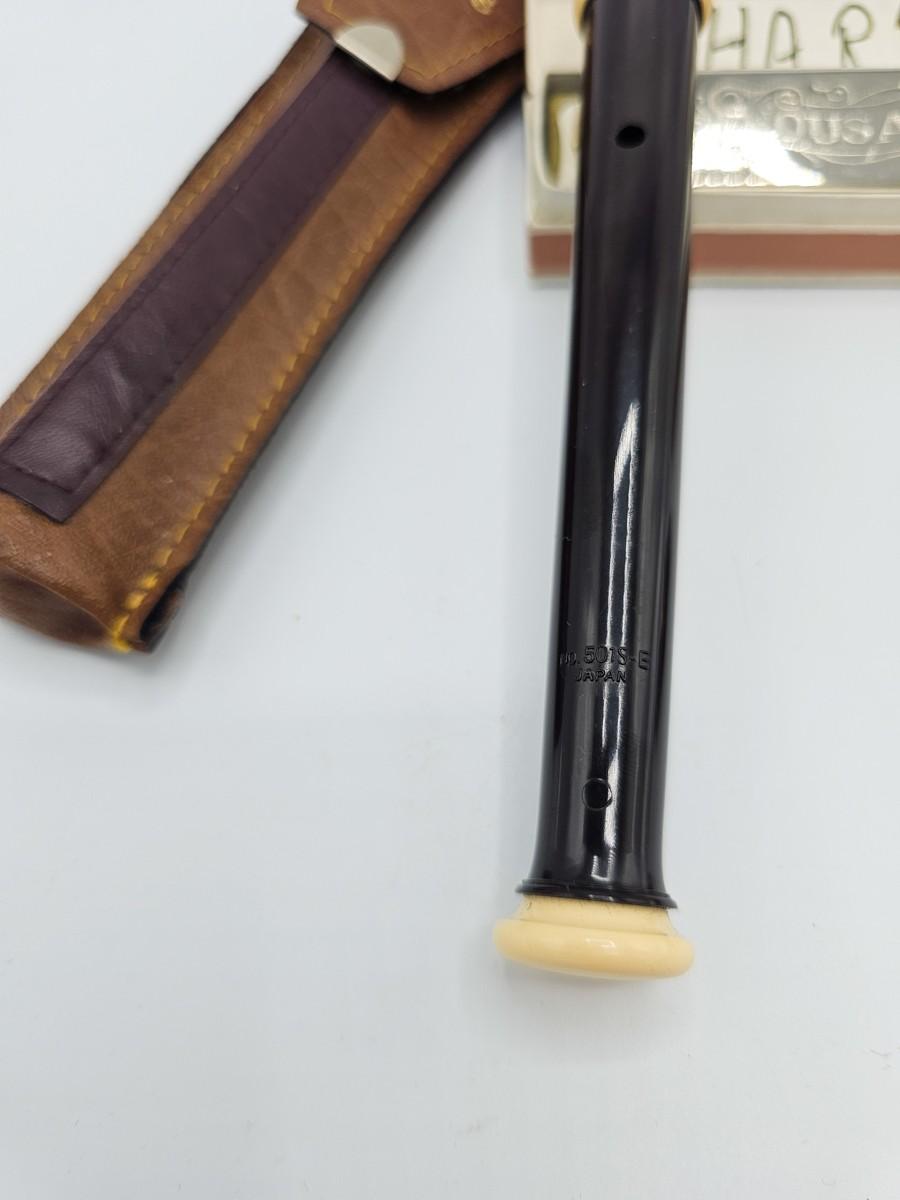 Vintage Aulos Japan 501S-E recorder, Sousa's Band 1012 harmonica, and Pocket Pal harmonica.