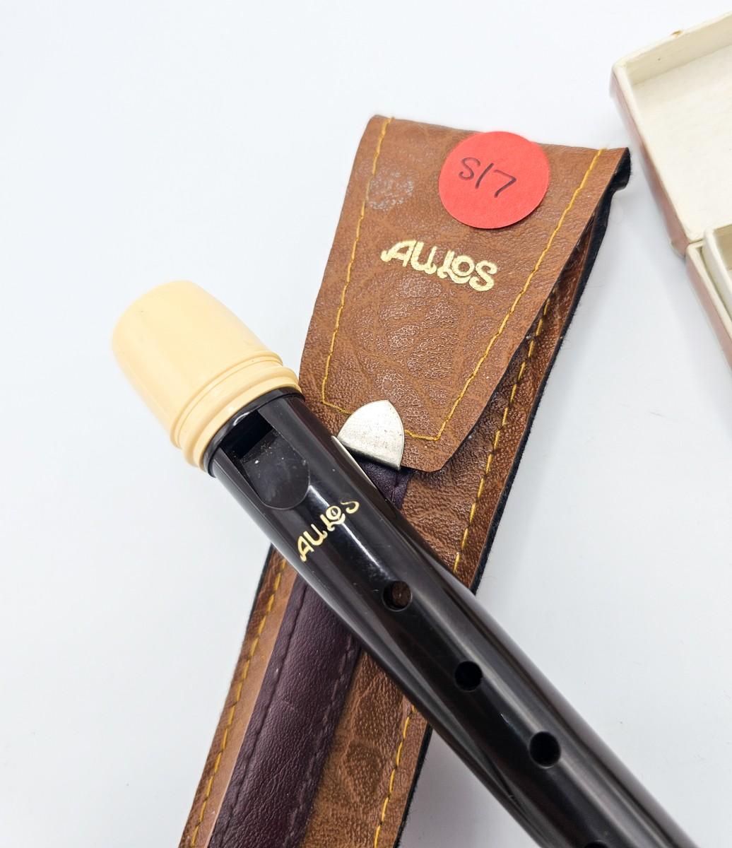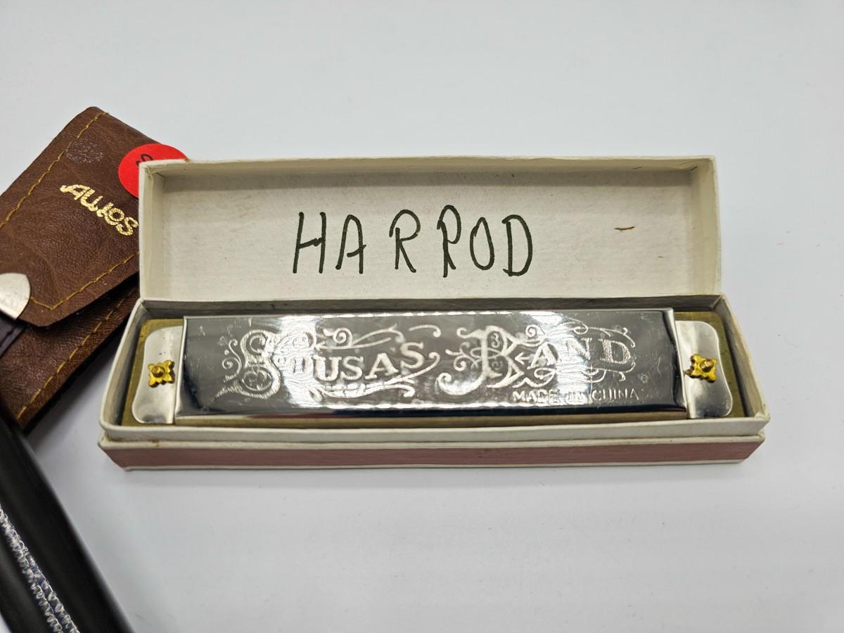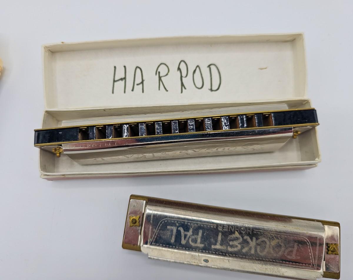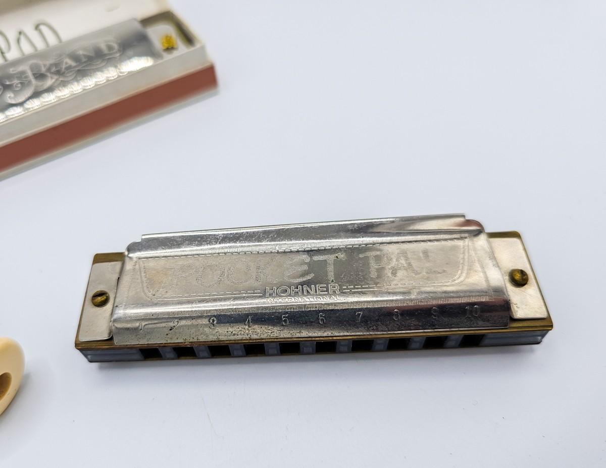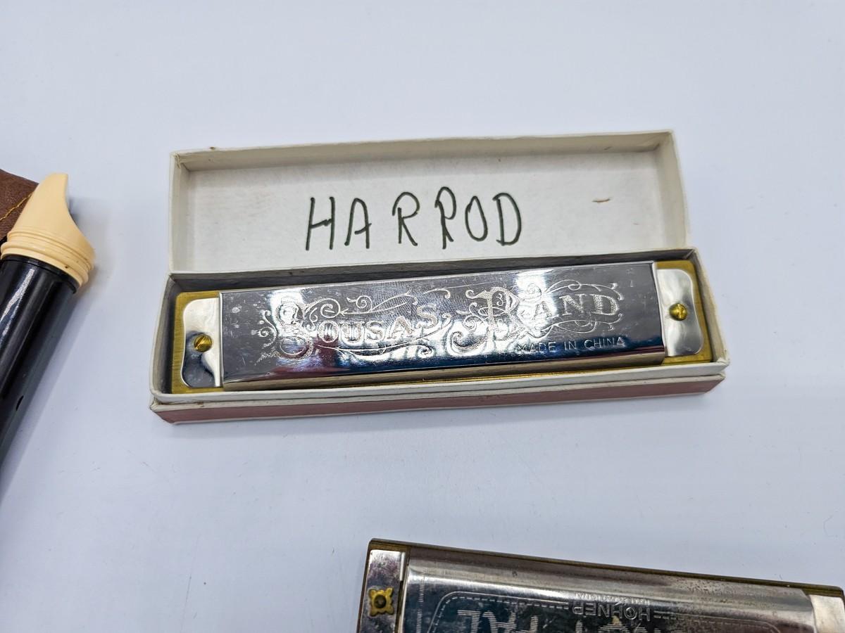 Vintage Aulos Japan 501S-E recorder, Sousa's Band 1012 harmonica, and Pocket Pal harmonica.
