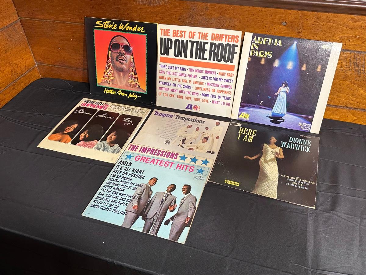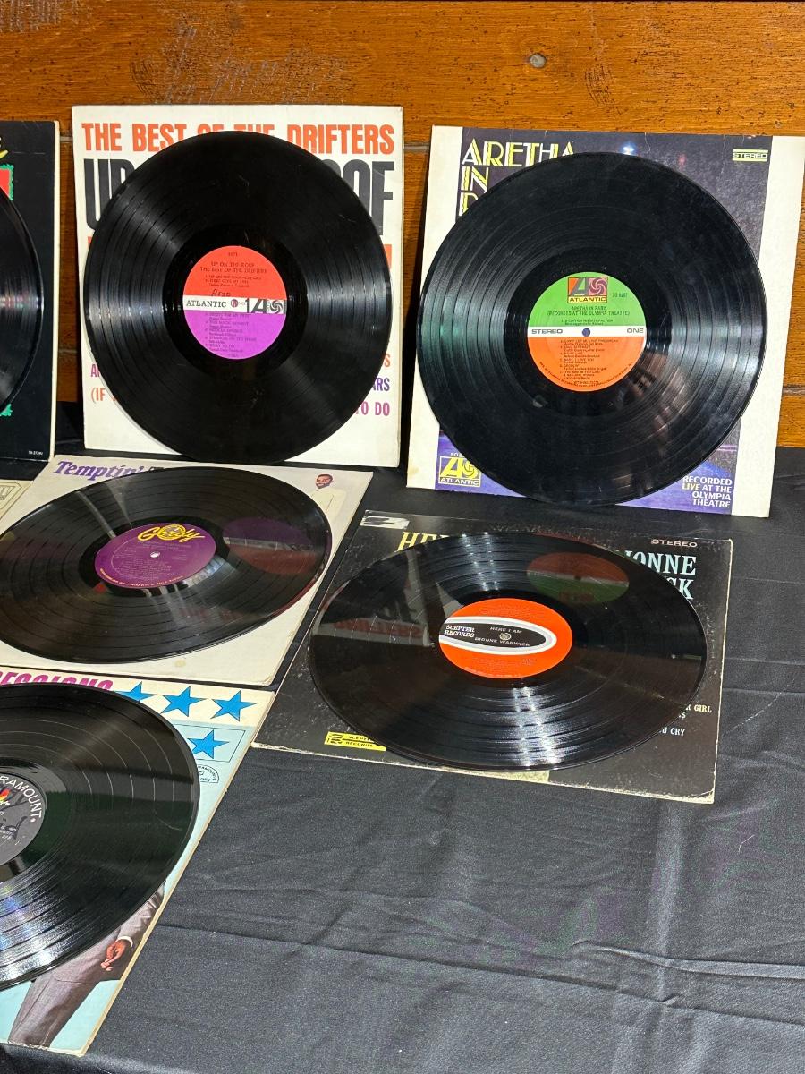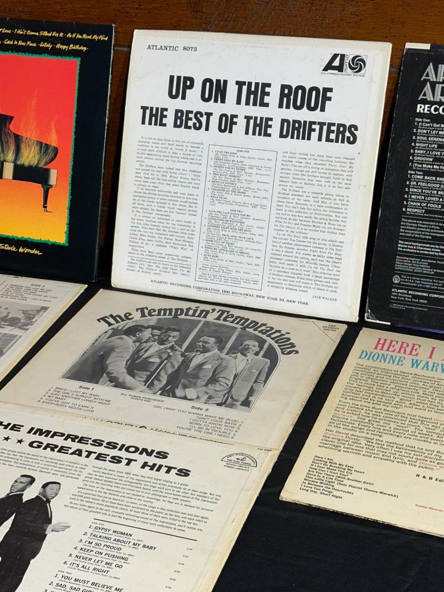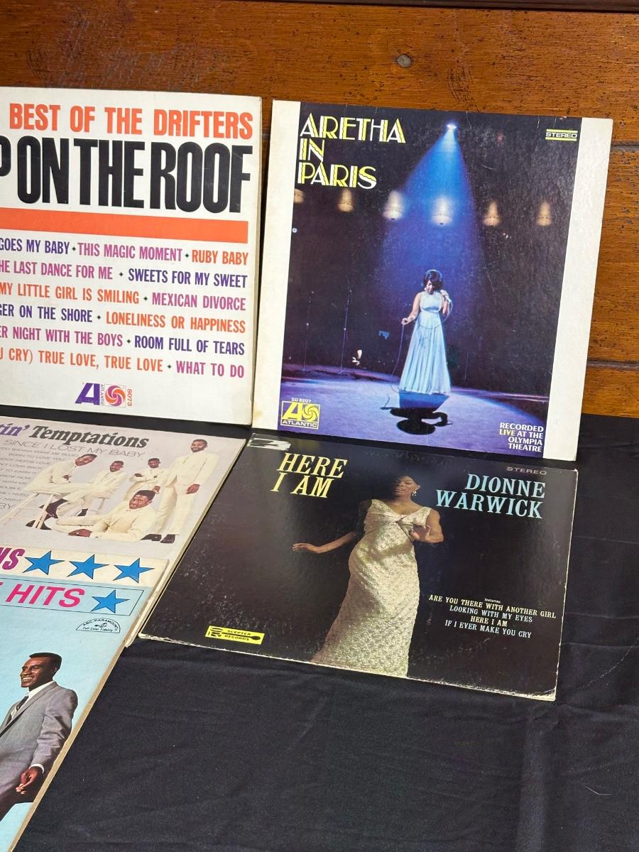 Vintage records including Aretha in Paris, Stevie Wonder, The Supremes, The Impressions, Dionne Warwick, The Temptin’ Temptations and The Drifters.