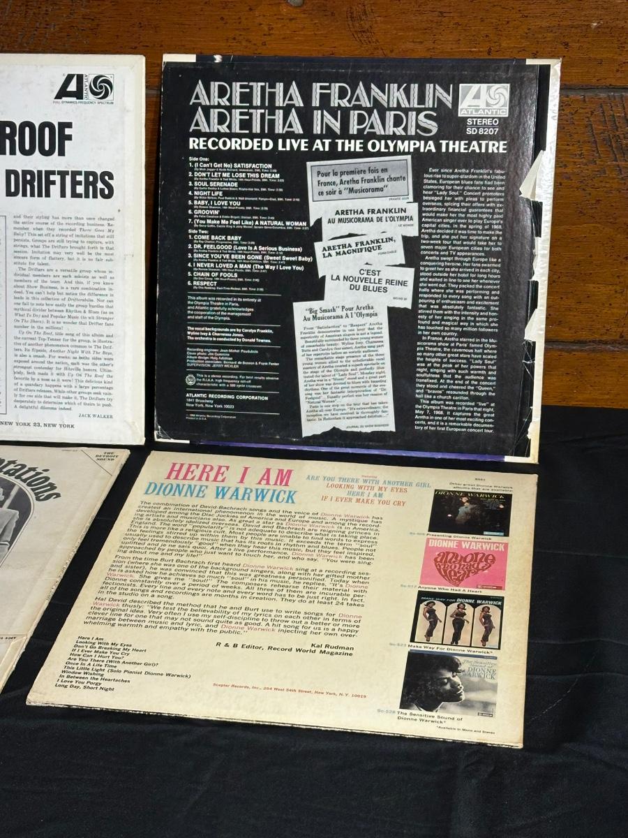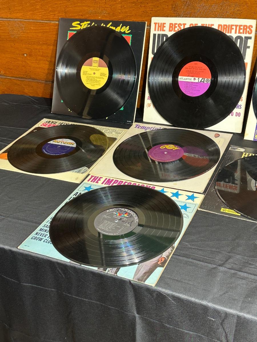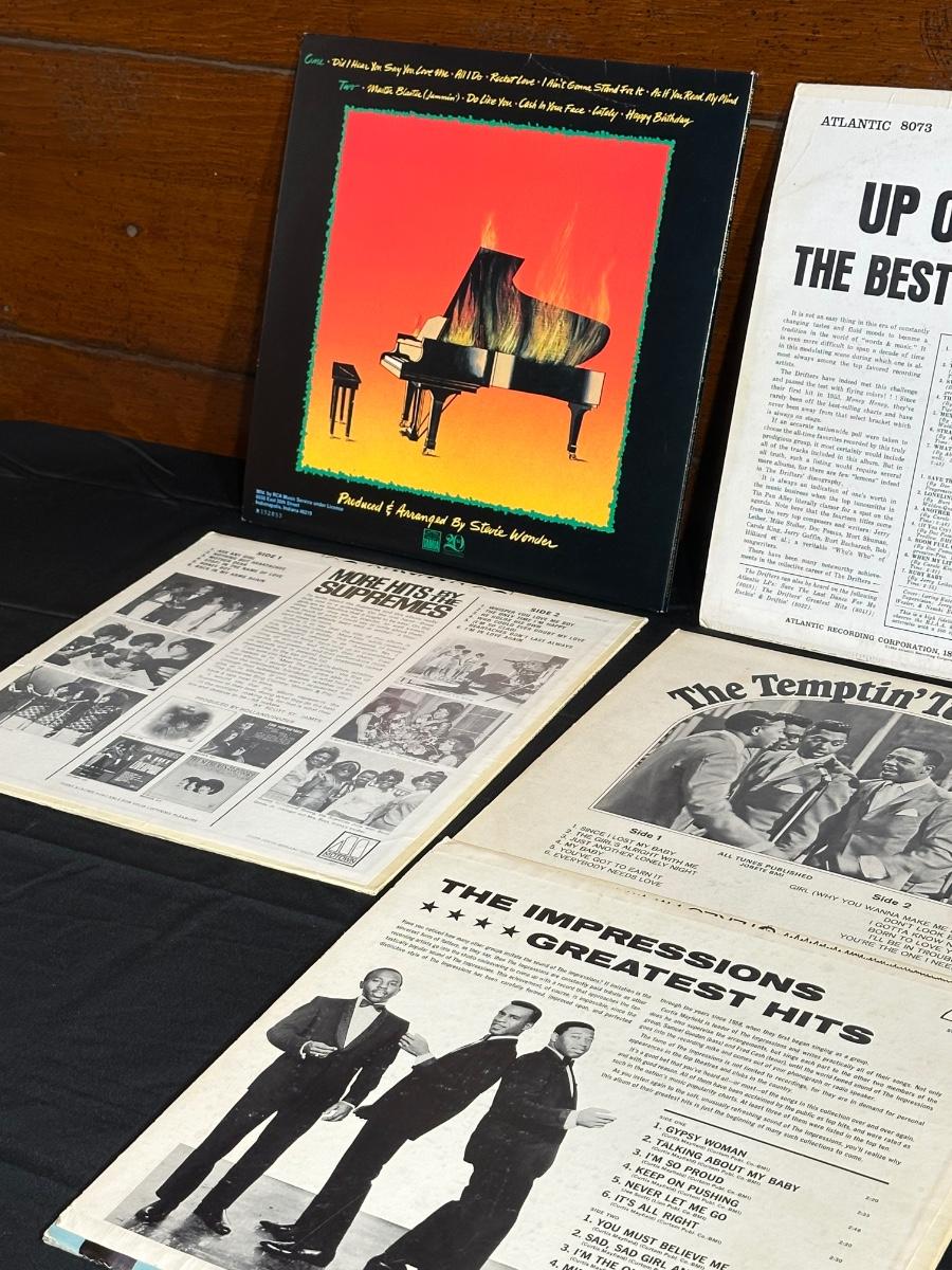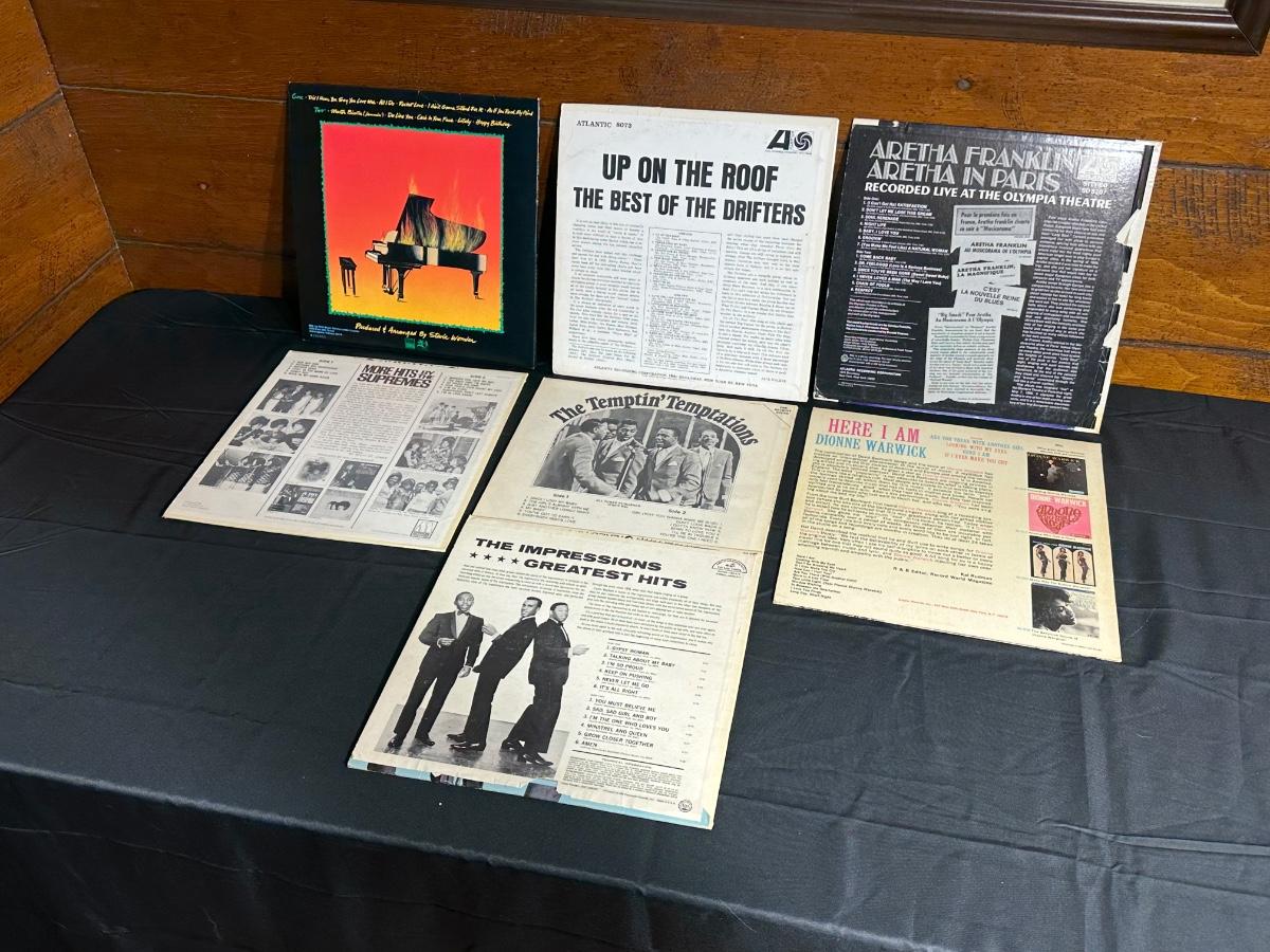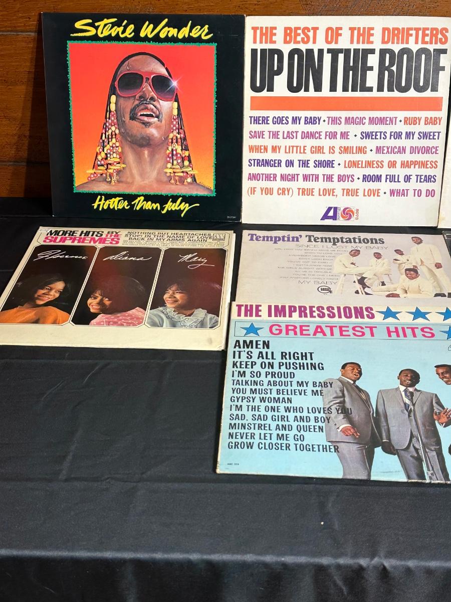 Vintage records including Aretha in Paris, Stevie Wonder, The Supremes, The Impressions, Dionne Warwick, The Temptin’ Temptations and The Drifters.