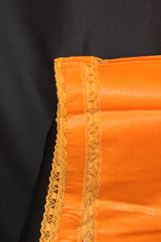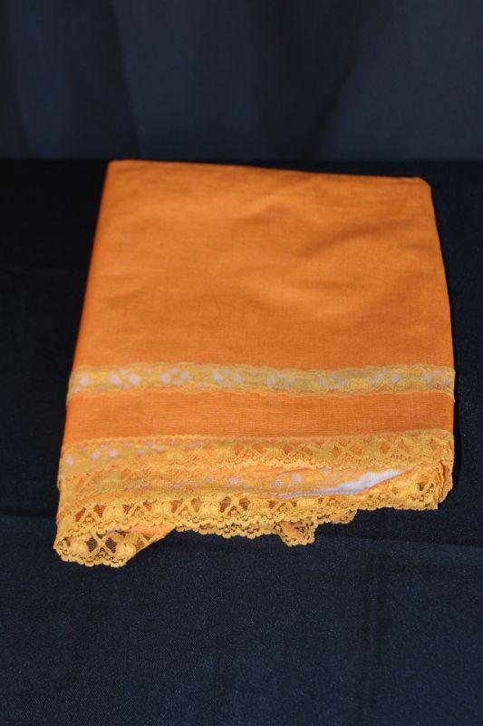 Vintage orange tablecloth. Vinyl with lace trim. Rectangle.