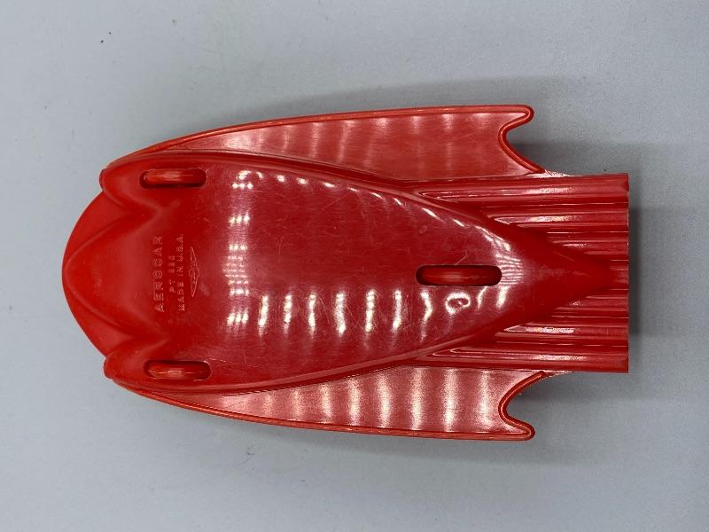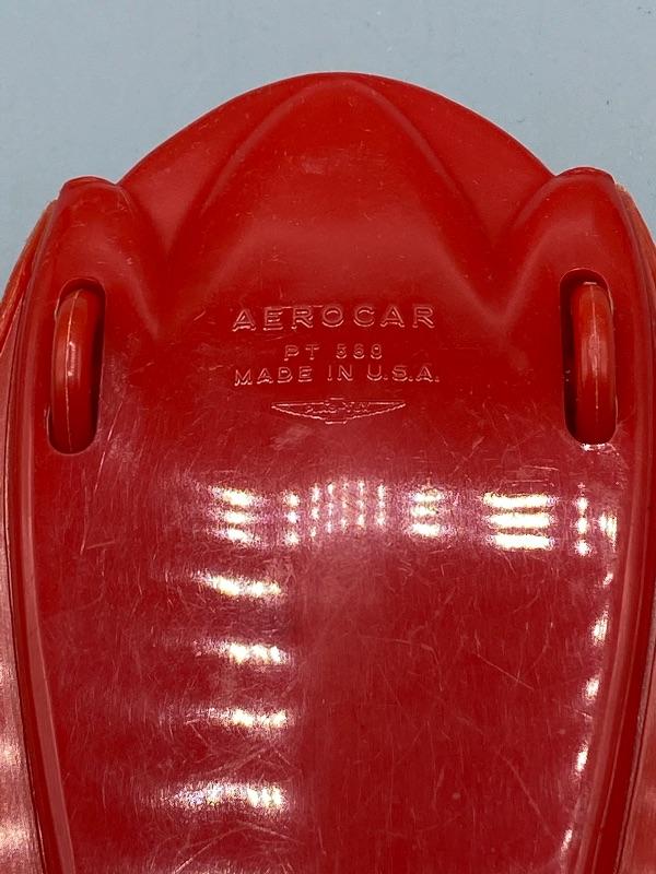Vintage kids plastic toy car, AEROCAR, is a futuristic red spaceship style of a car. Maybe from the 1950s? Looks like it might be missing the front headlights and there is a spot where a hood ornament might have once been. Cooling looking collector car, displays nice, needs to be cleaned a little.
