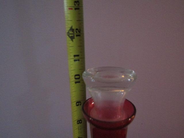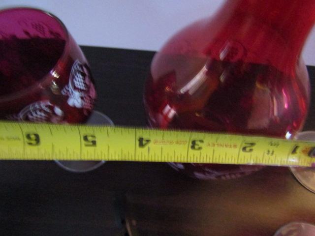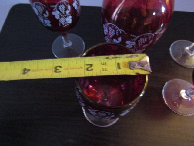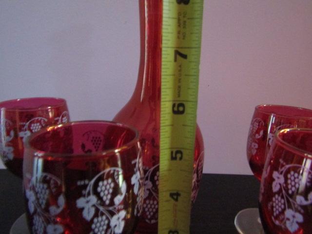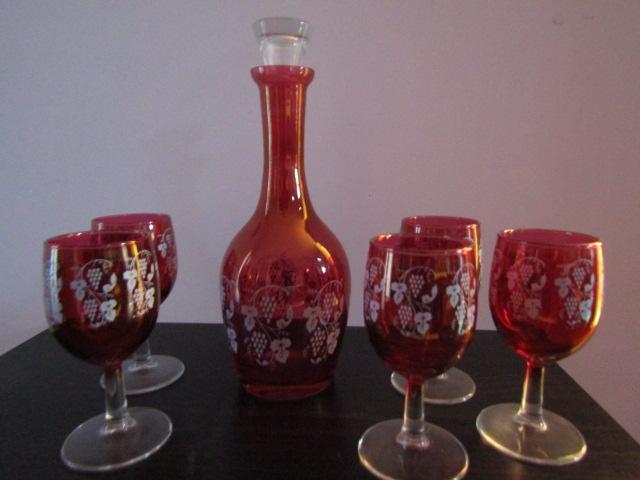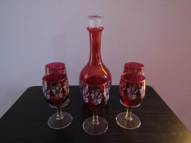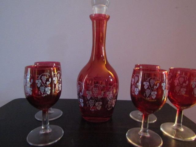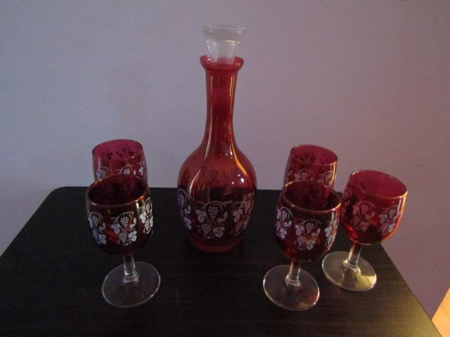 Vintage Red and White Etched Glass Decanter and Glass Set Grapevine Design