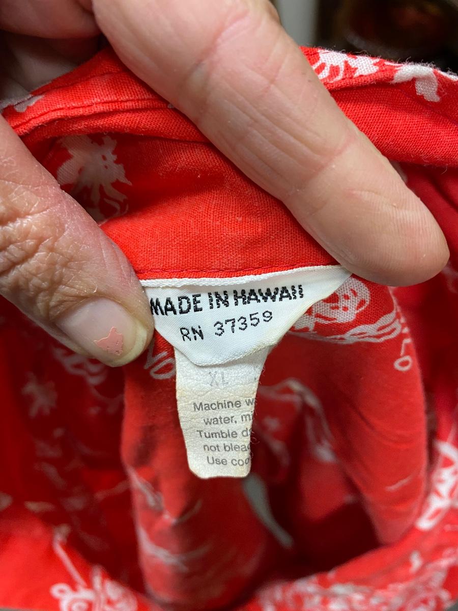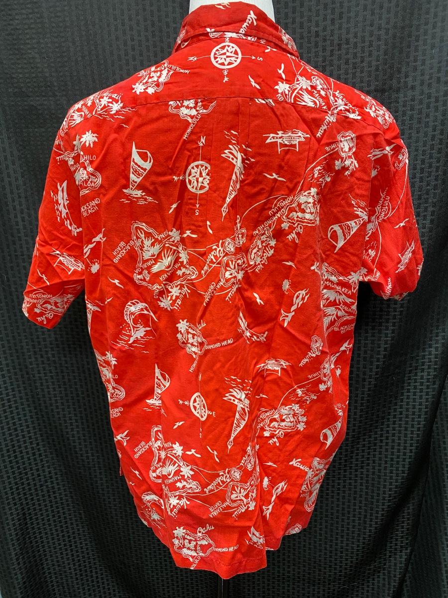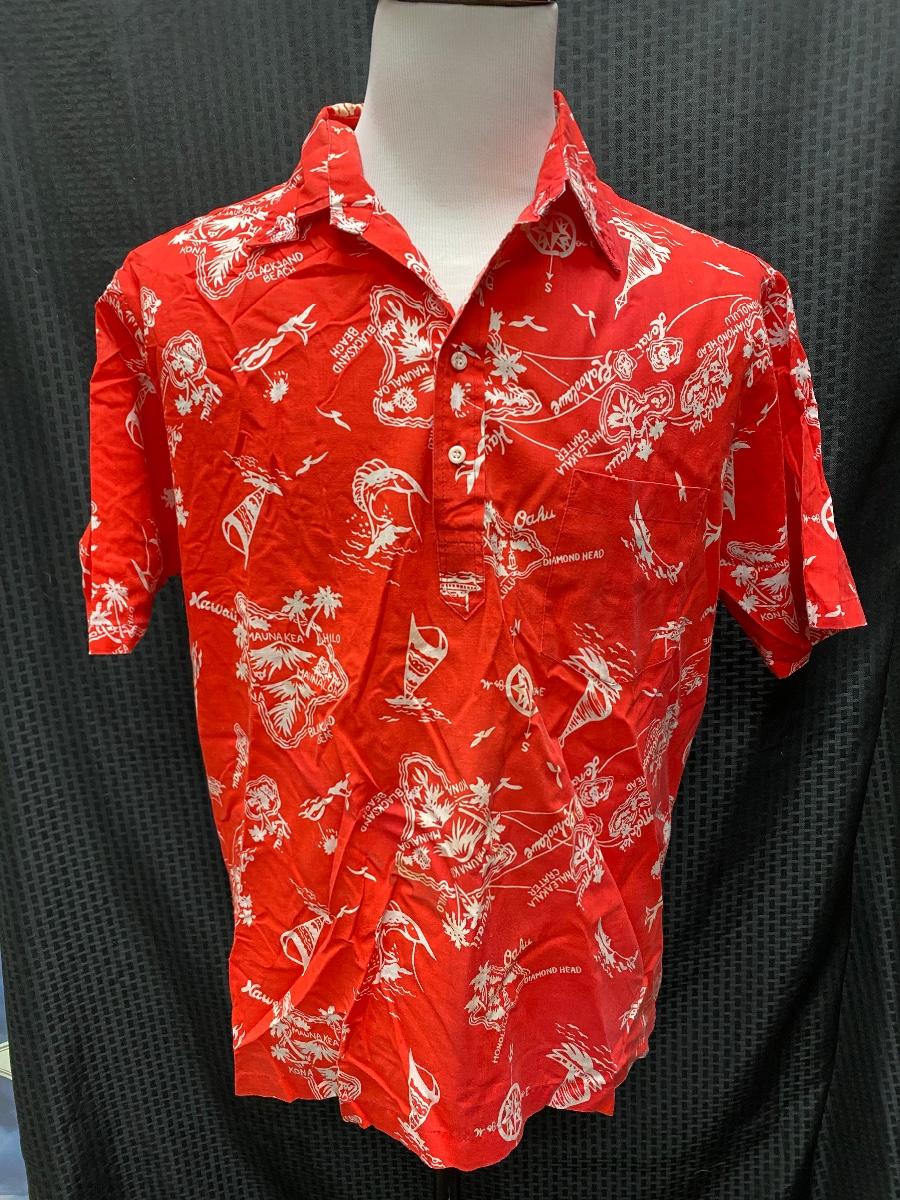 Vintage red & white men's shirt from Hawaii. Size XL. Red with white island and ocean themed print, button down to chest level. Good condition, no spots, stains, or holes noticed.