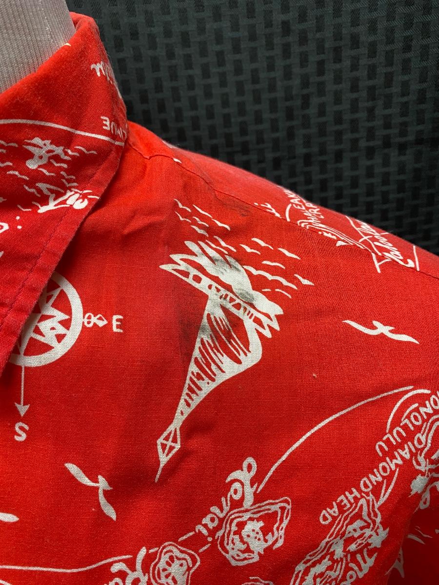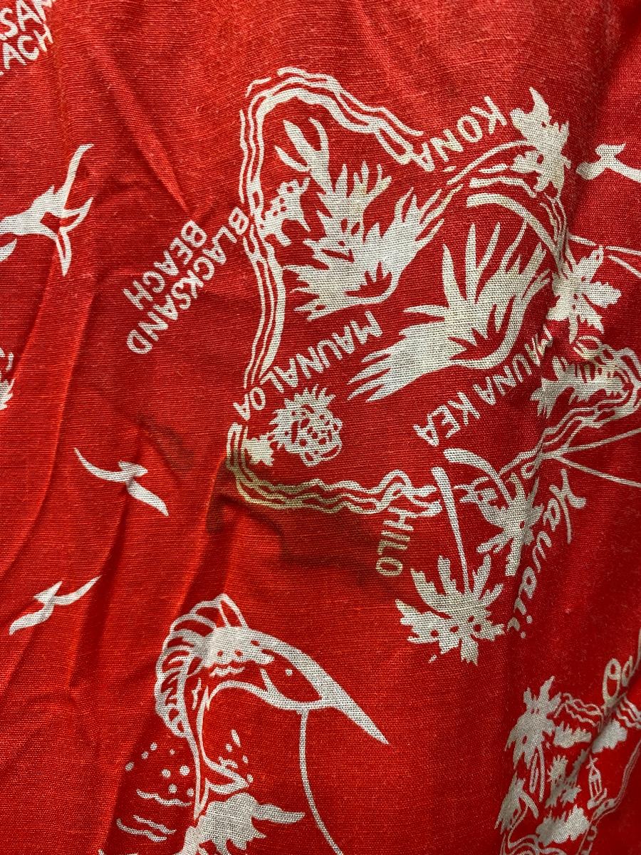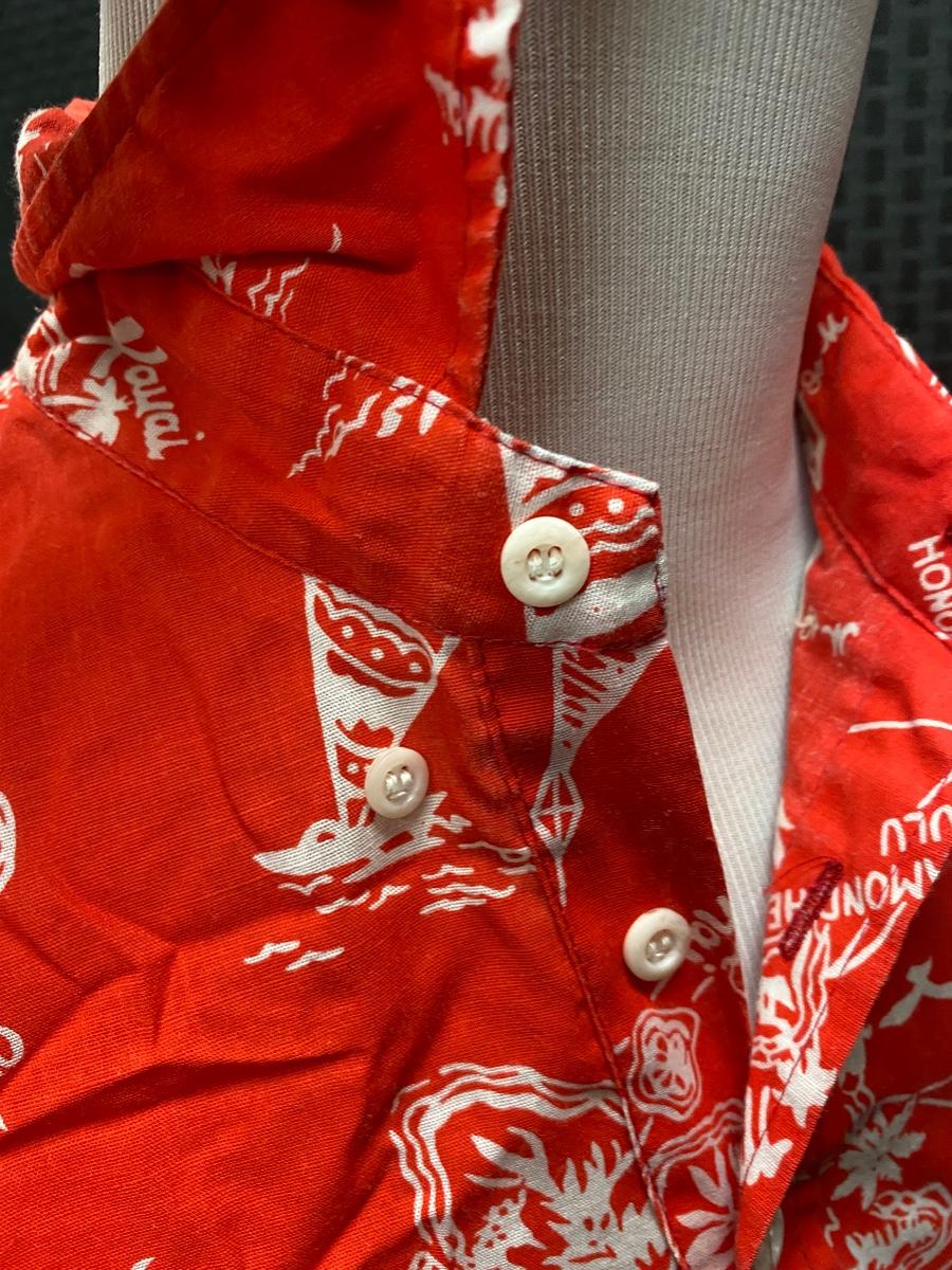 Vintage red & white men's shirt from Hawaii. Size XL. Red with white island and ocean themed print, button down to chest level. Good condition, no spots, stains, or holes noticed.