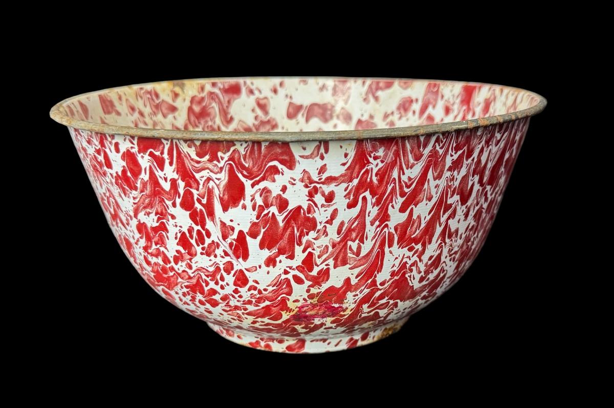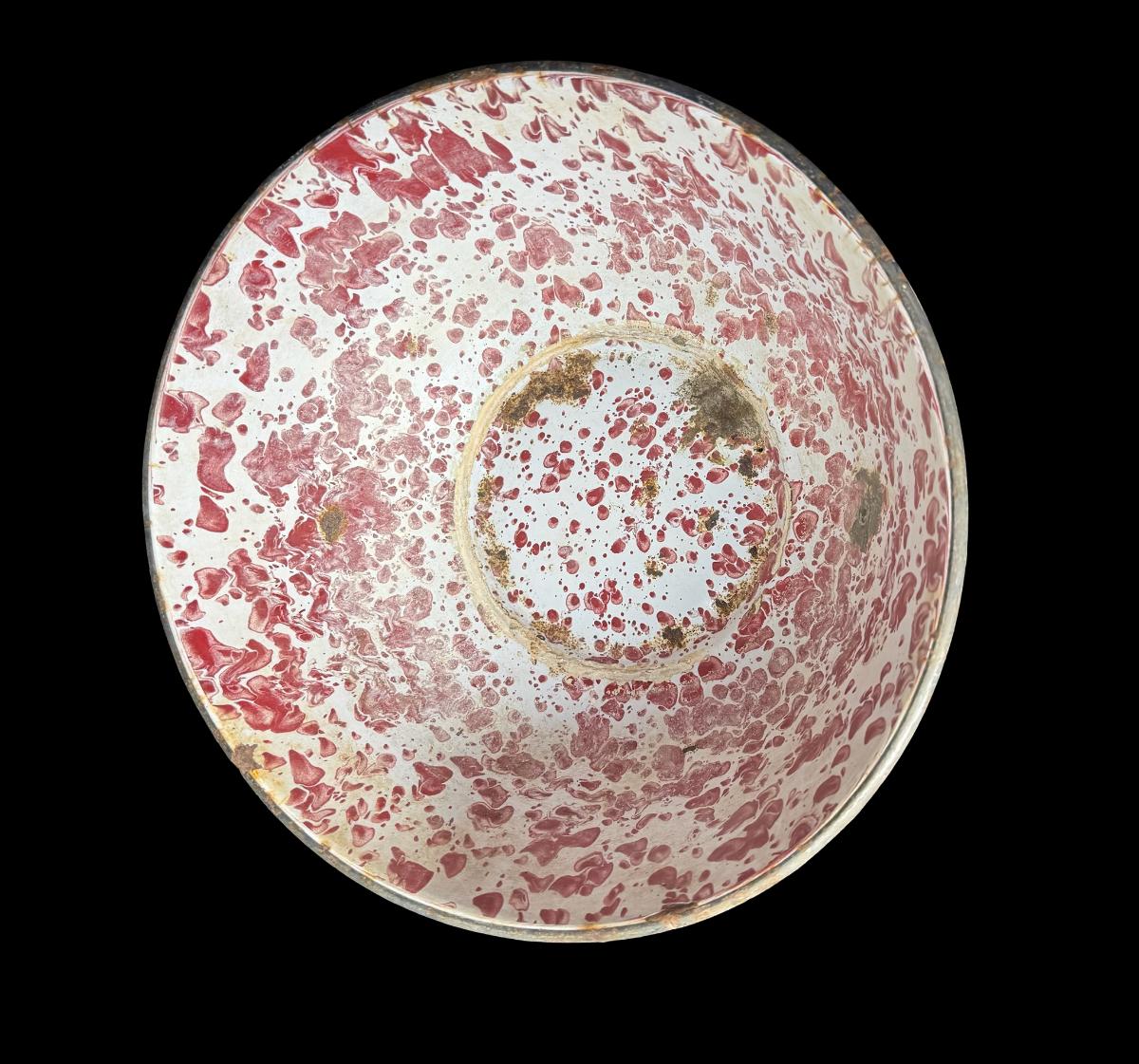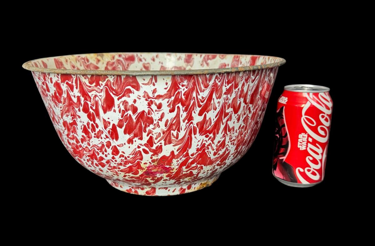 This piece appears to be completely round and free of dents. There is some enamel loss inside and on the base. Measurement: 6”H x 12” Diameter. [KD]