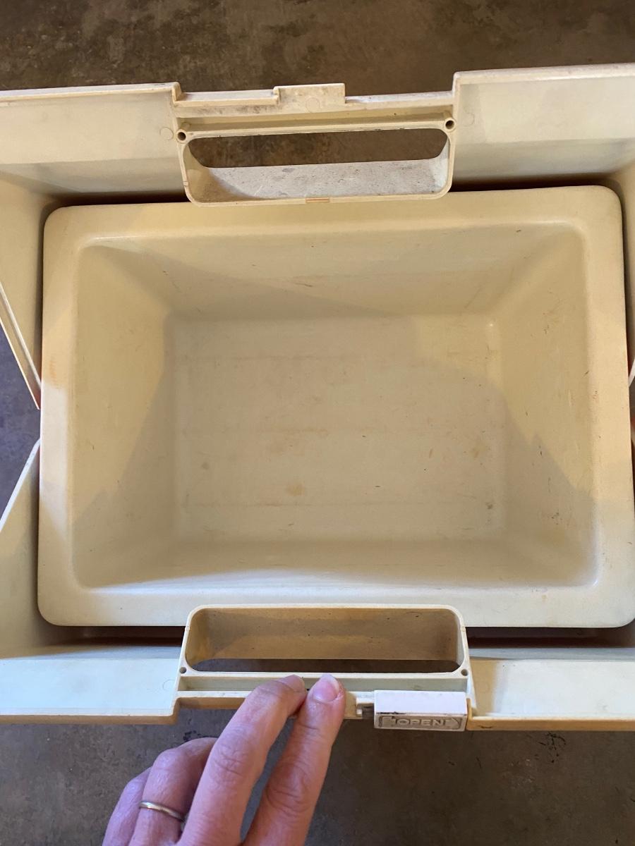 Vintage Red and White Thermos Brand Ice Chest Cooler The Six Packer. Some discoloration from age but looks to be in useable condition.