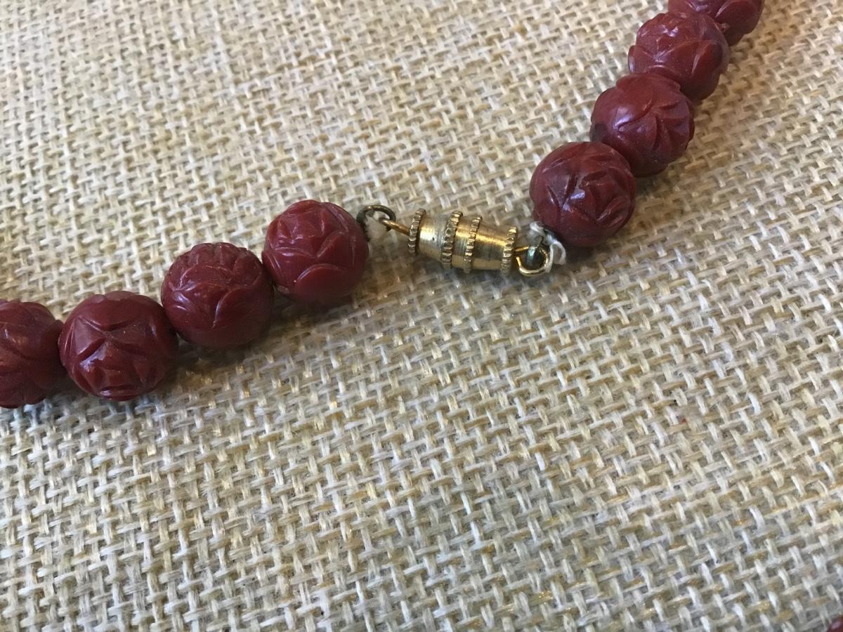 Vintage Red Carved Faux Coral Round Beaded Necklace