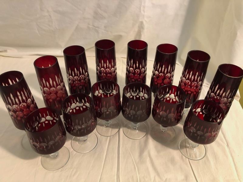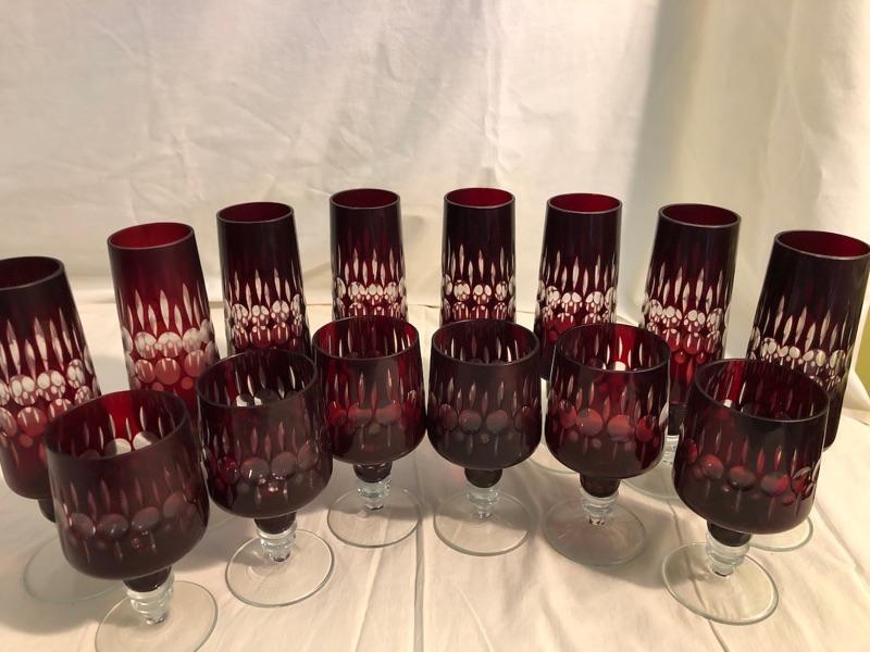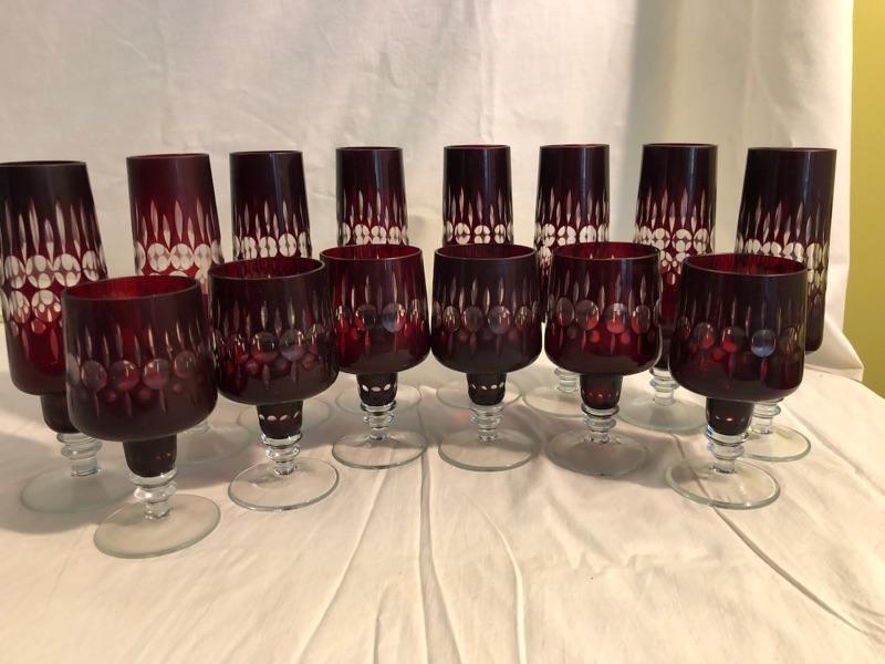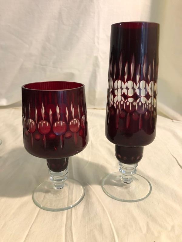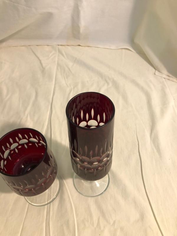 set of 6 wine glasses and 8 champagne vintage red with etches decorations champagne are 7.5 by 1.75 wide and the wine are 5 in tall x 2.5 diameter