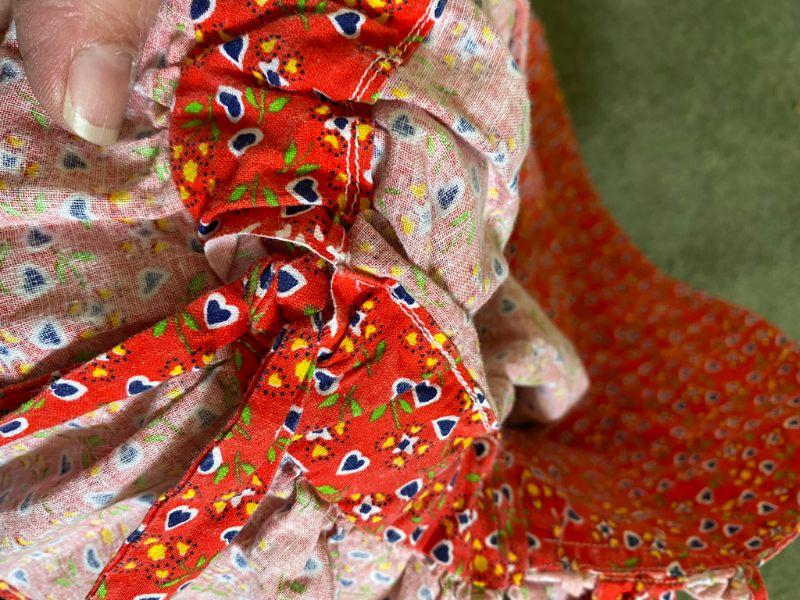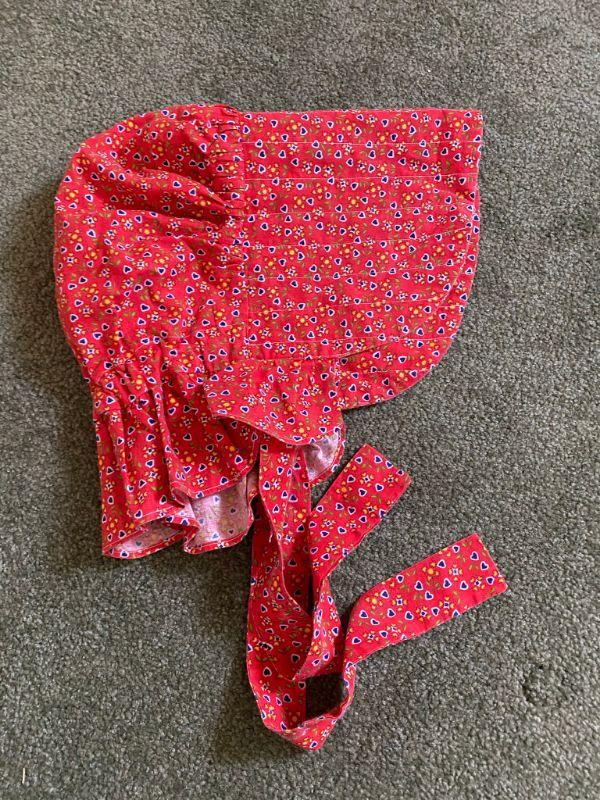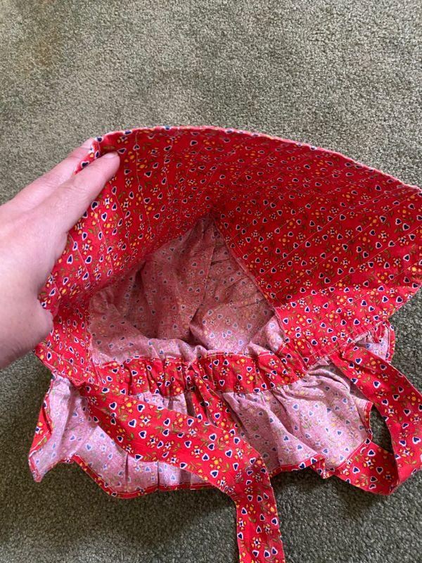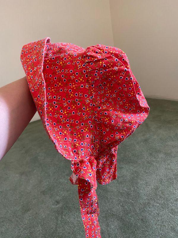 Red vintage sun bonnet. Small heart flower pattern, reminds me of the Sun Maid Raisin girl. Has an adjustable tie inside and ties for under the chin. Good condition.