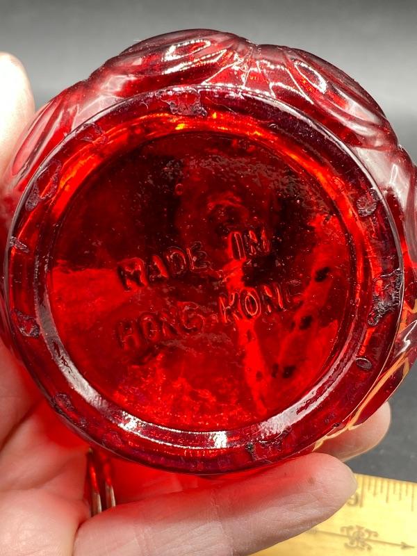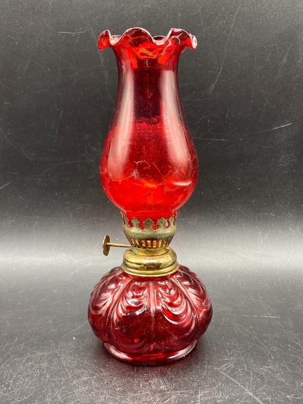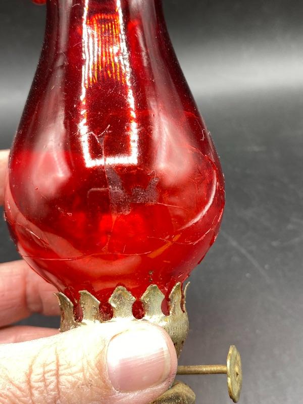 Vintage red glass oil lamp. About 8" size. The hurricane globe on top is red painted clear glass, it is cracking and flaking in spots. The bottom is probably the same but in better condition. Displays nicely. Made in Hong Kong.