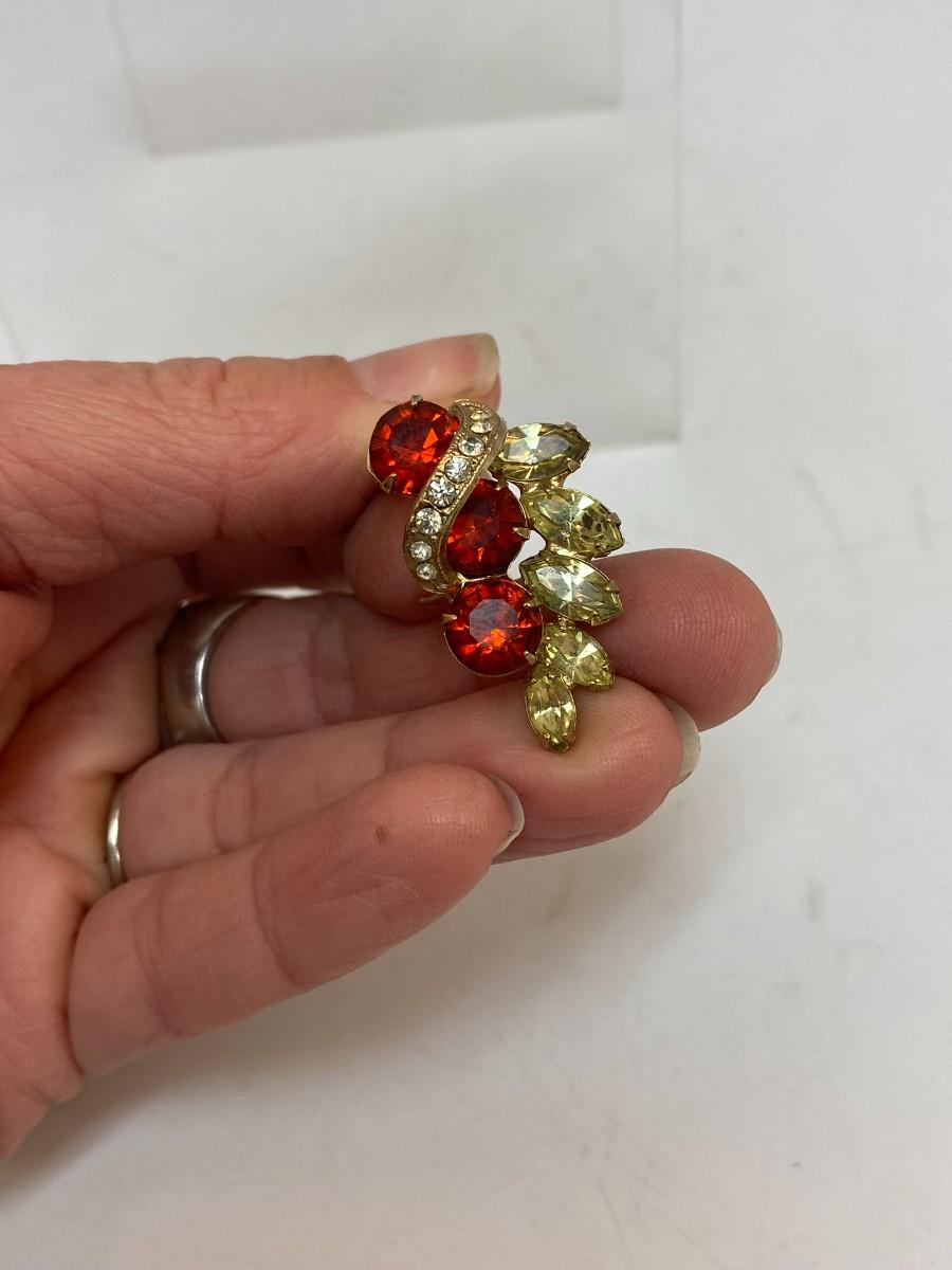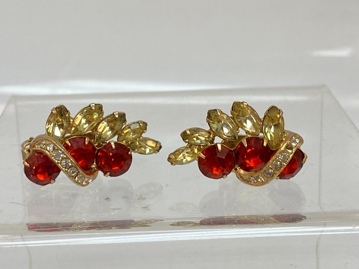 Vintage Red & Gold Eisenberg Rhinestone Clip Style Earrings. Beautiful sparkle. In good condition.