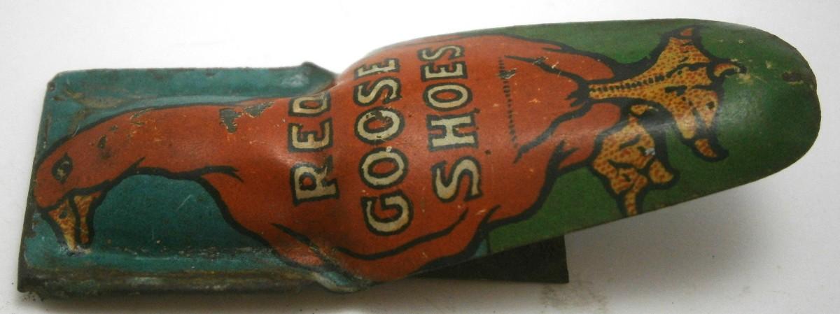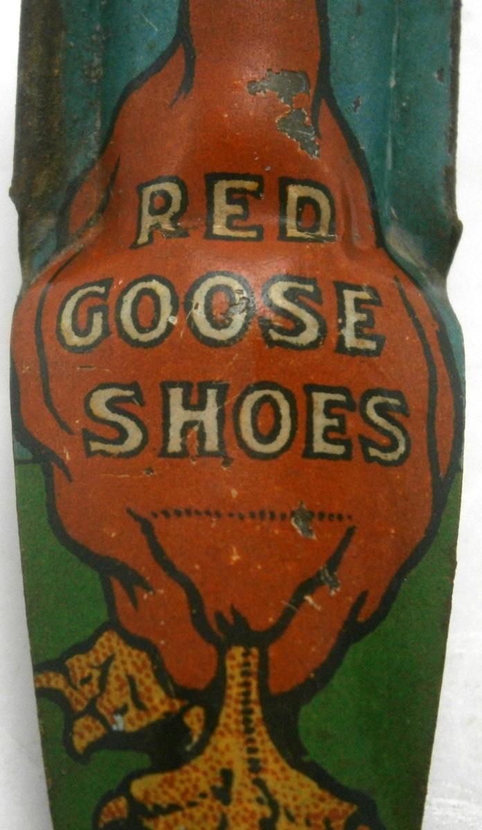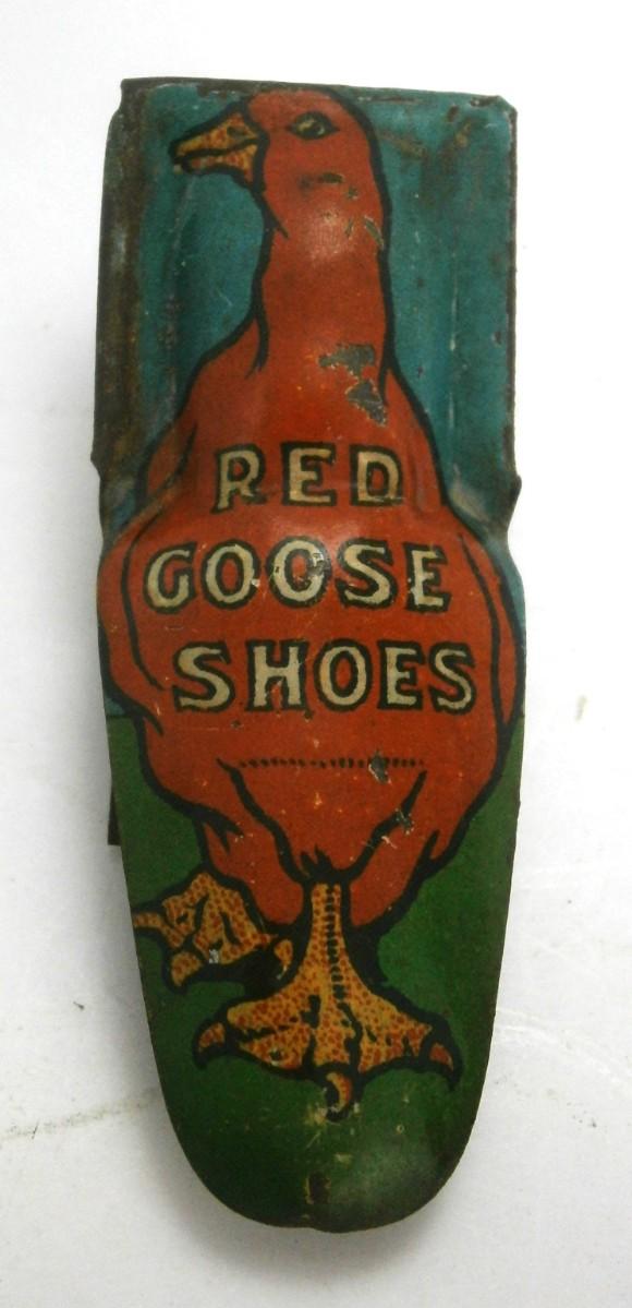 Vintage "RED GOOSE SHOES" Advertising Toy Clicker from the early 1900's, 1 3/4 in. long, lithographed tin, back has rust.