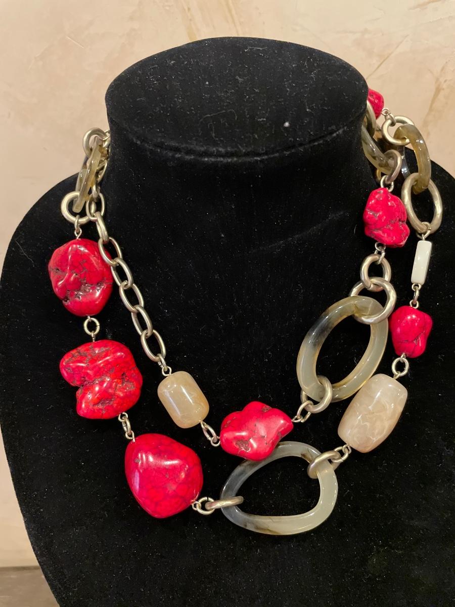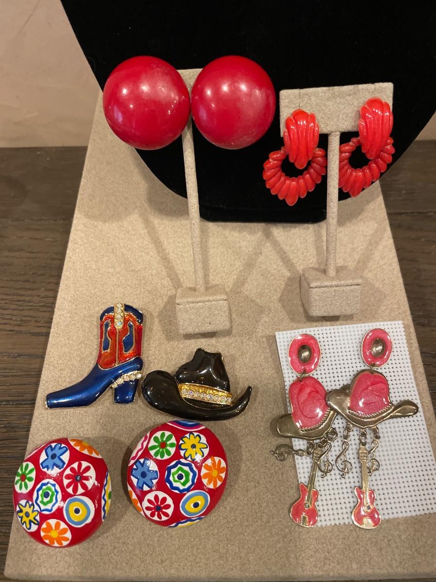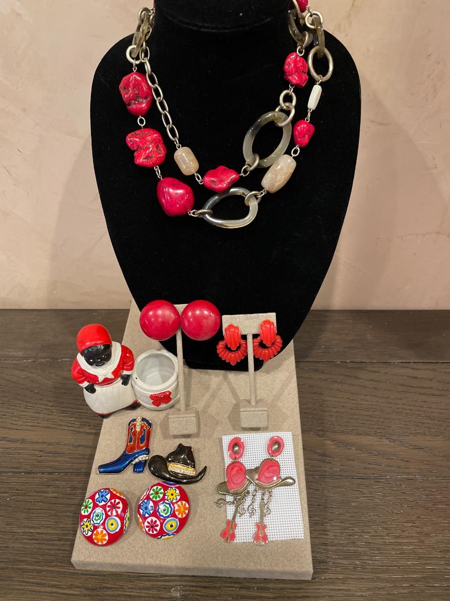 Cowboy jewelry, possible quarts necklace from Chicos, Napier clip ons, small ceramic figure
