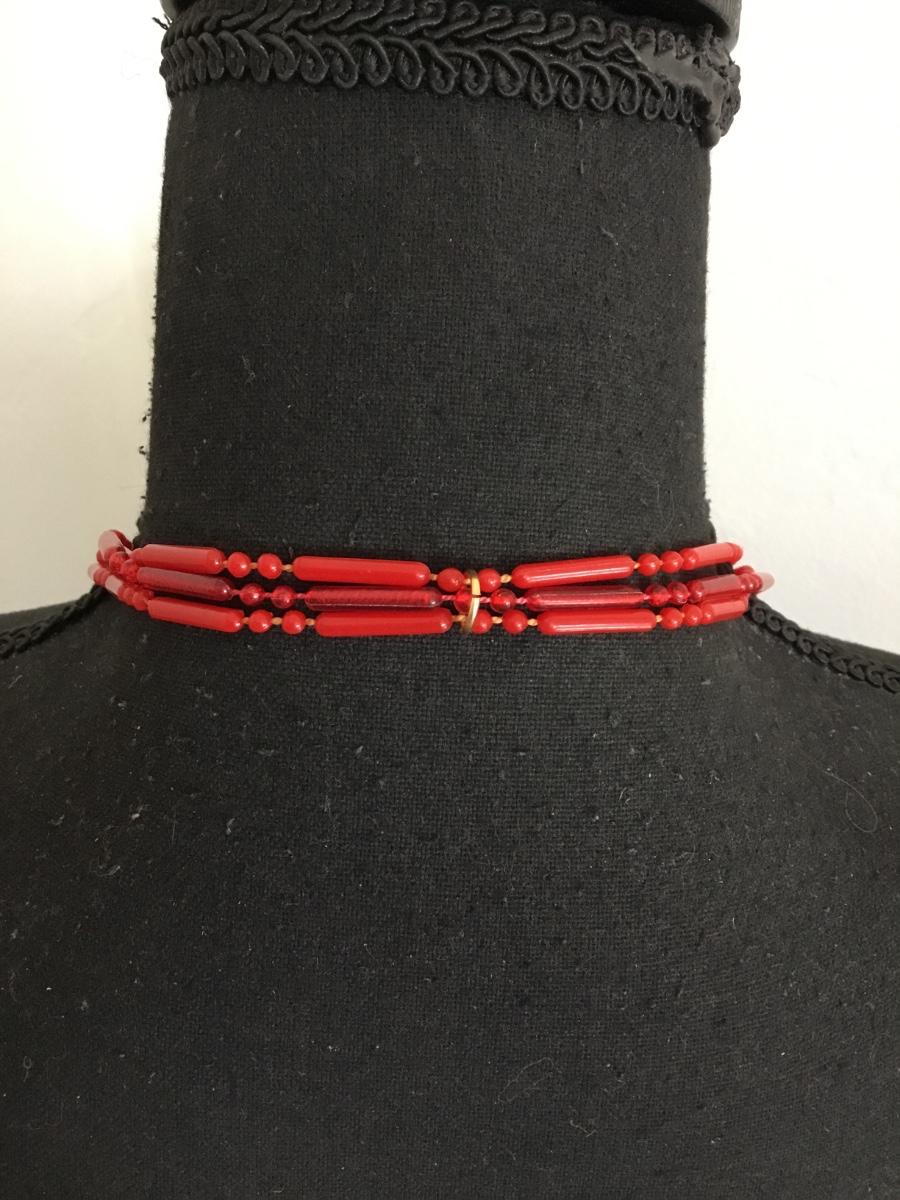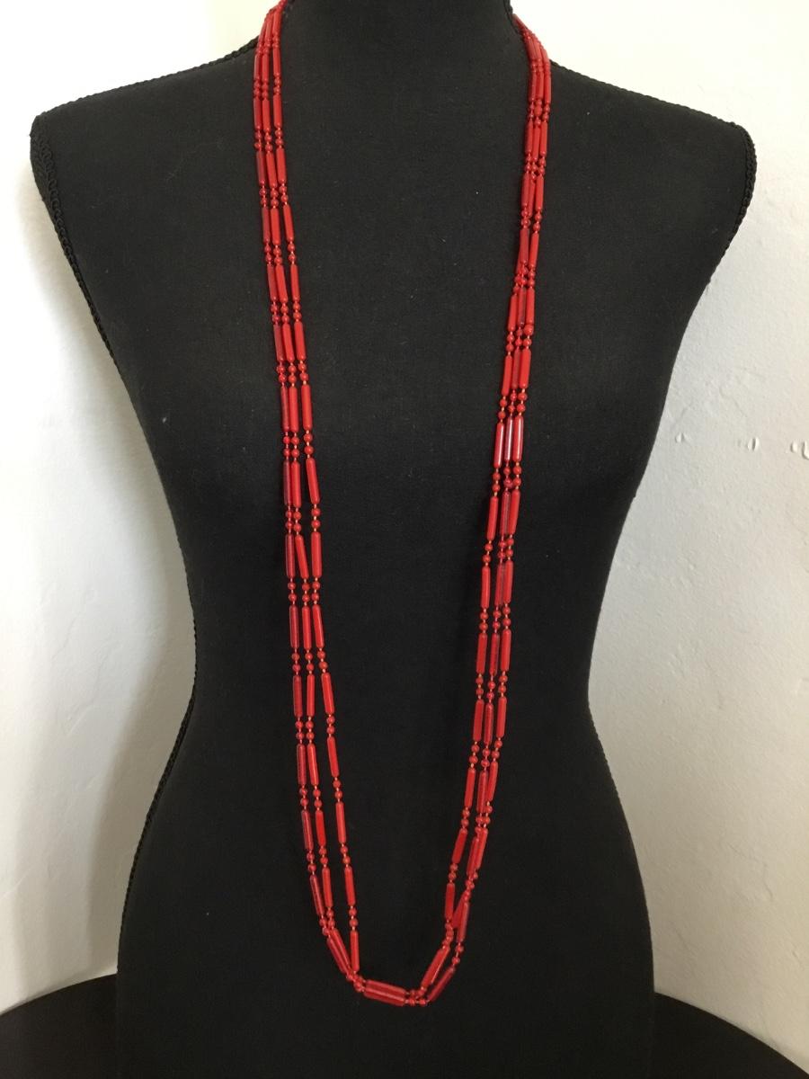Vintage red Lucite, , plastic long tube, bead, multi strand necklace