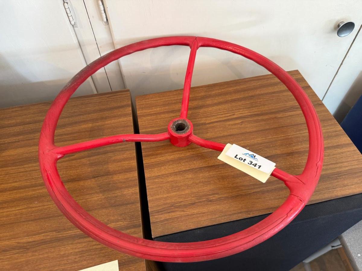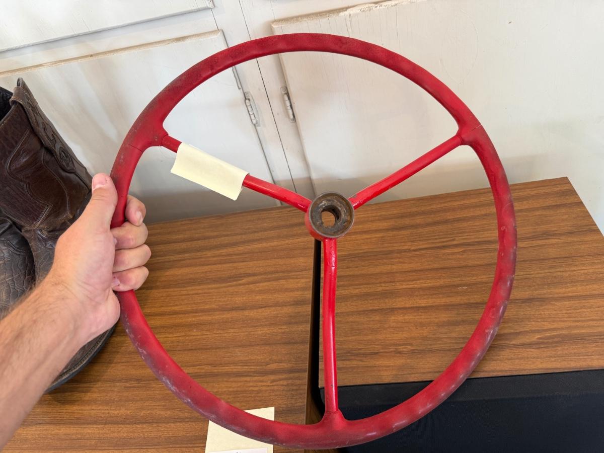 Red Vintage Metal Steering Wheel that was for possibly a Tractor
