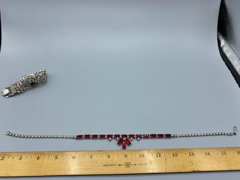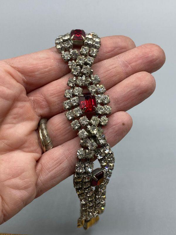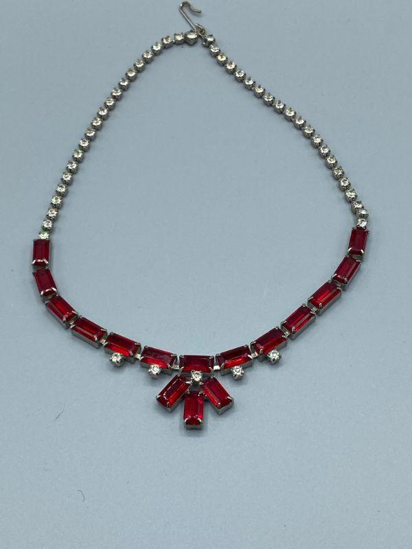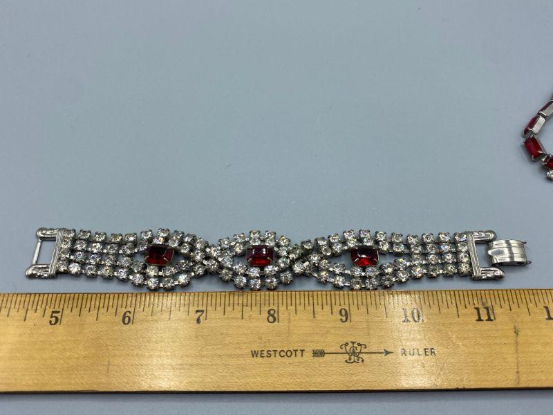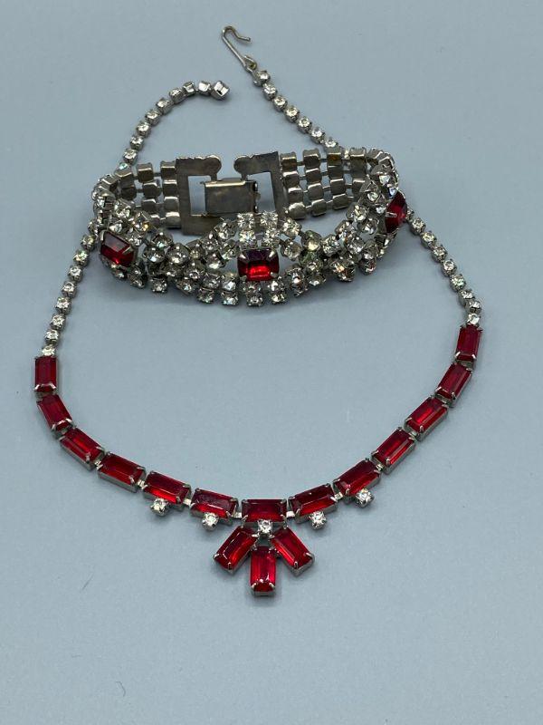 Vintage rhinestone statement pieces. Ruby red and clear rhinestones. Choker style necklace with hook closure. Chunky rhinestone bracelet with latch. No missing stones noticed.
