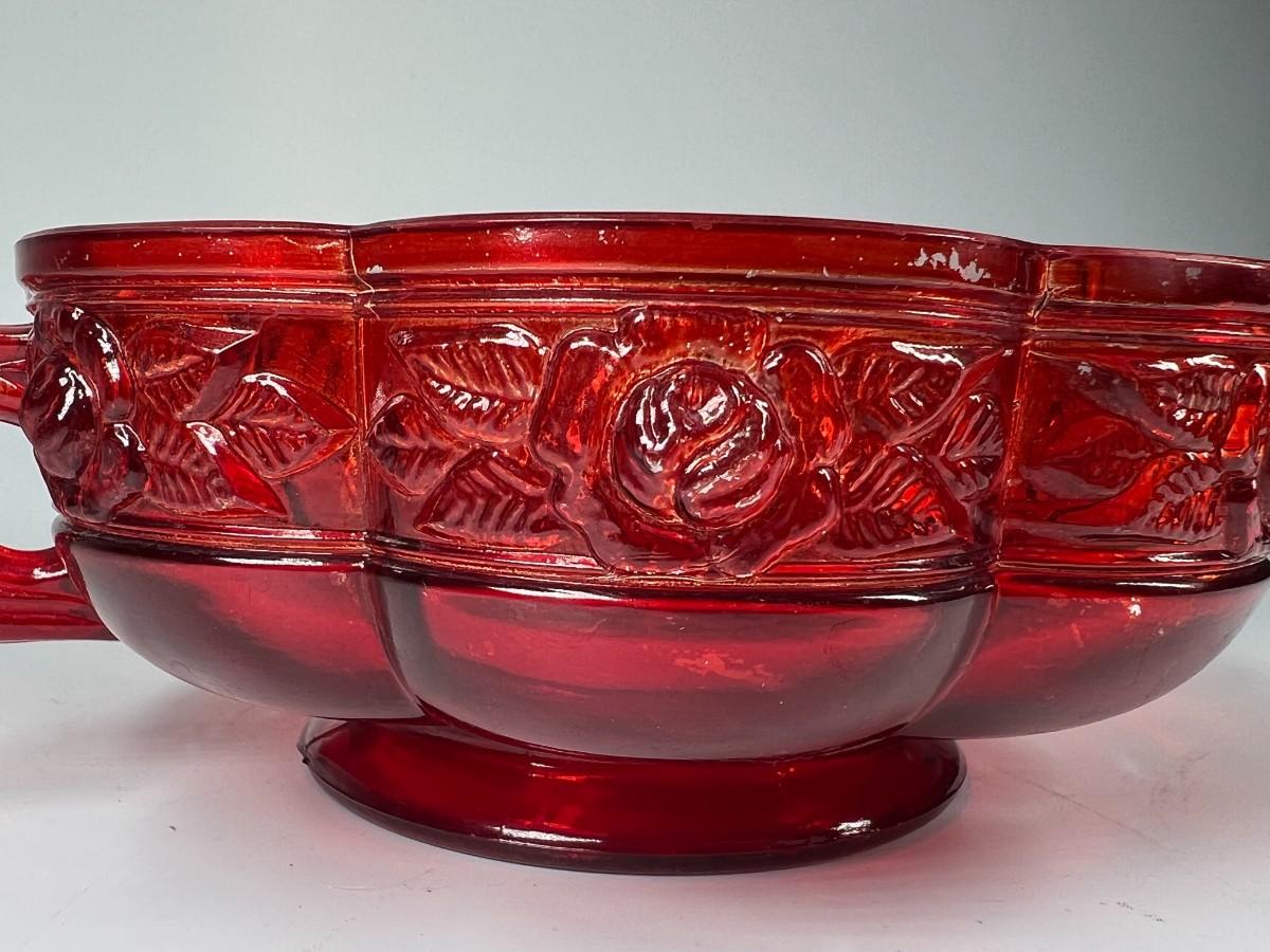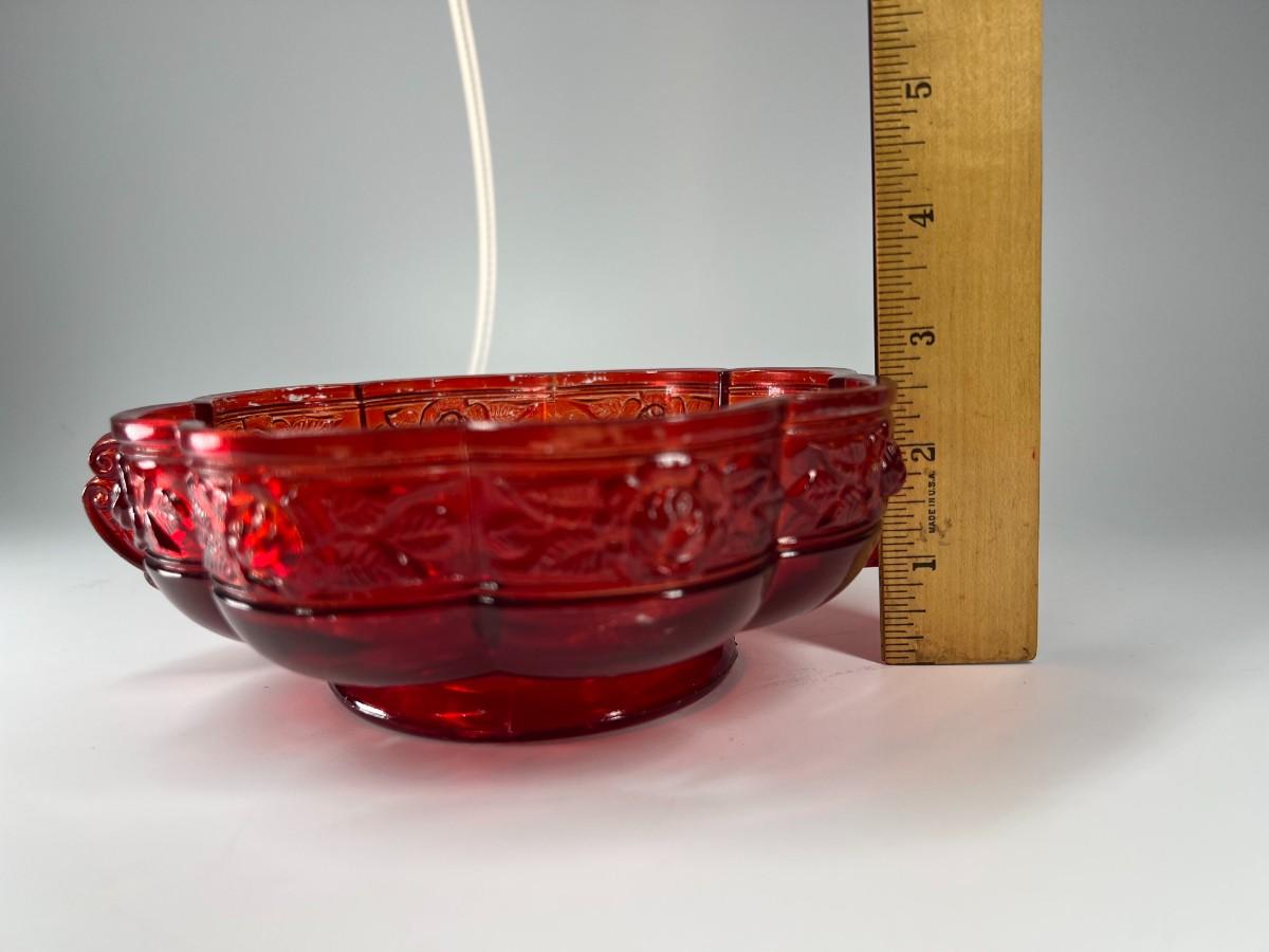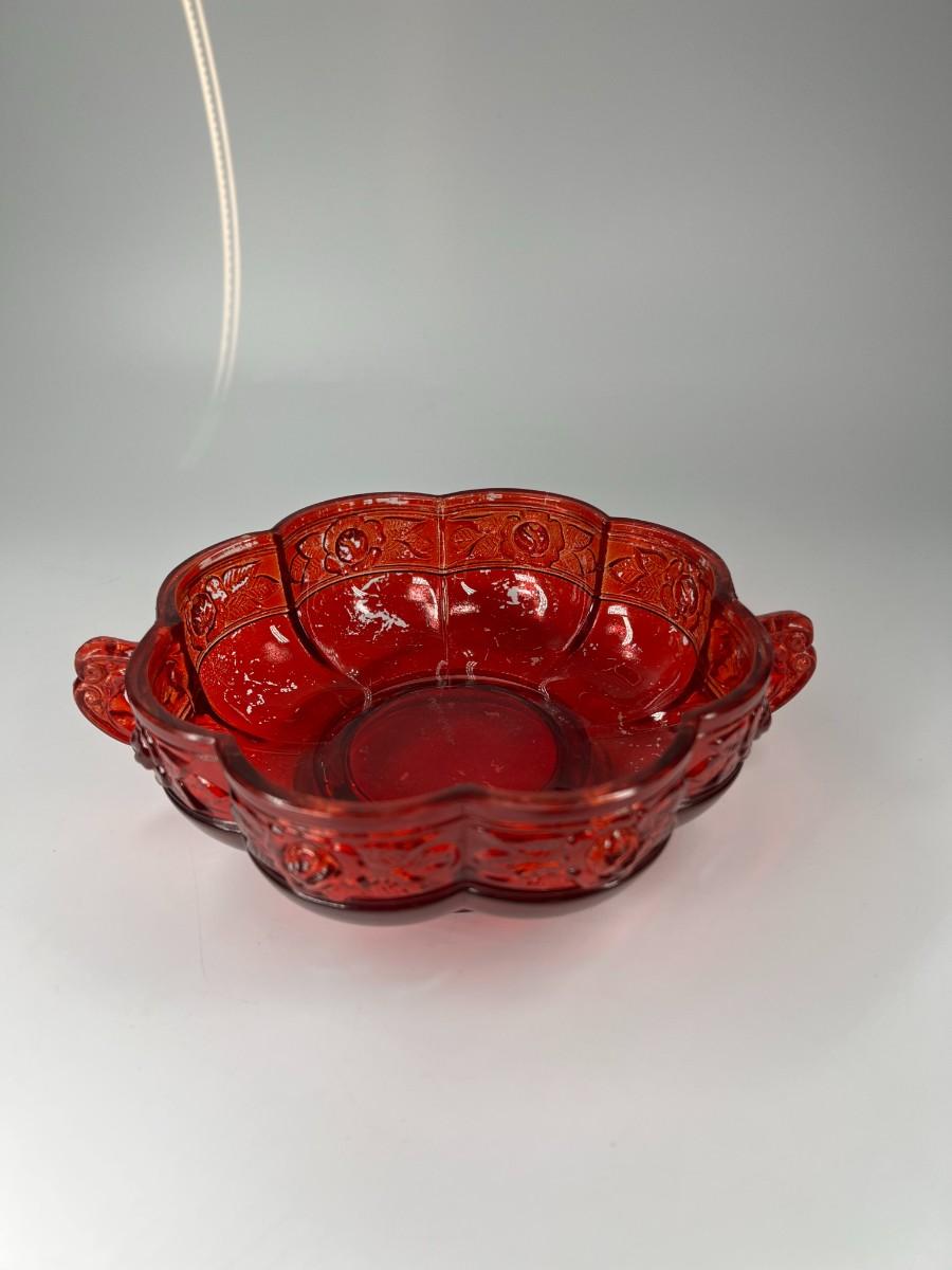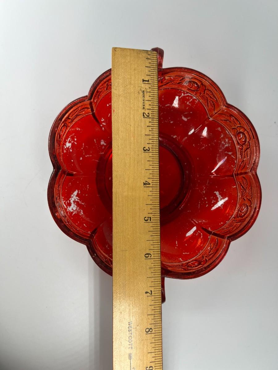 Vintage Red Rosebud Flower Glass Decorative Bowl, there is some light vintage wear, but there is no significant damage and is in good displayable condition. Check pictures for more details and for sizing.
