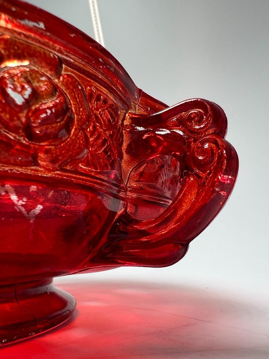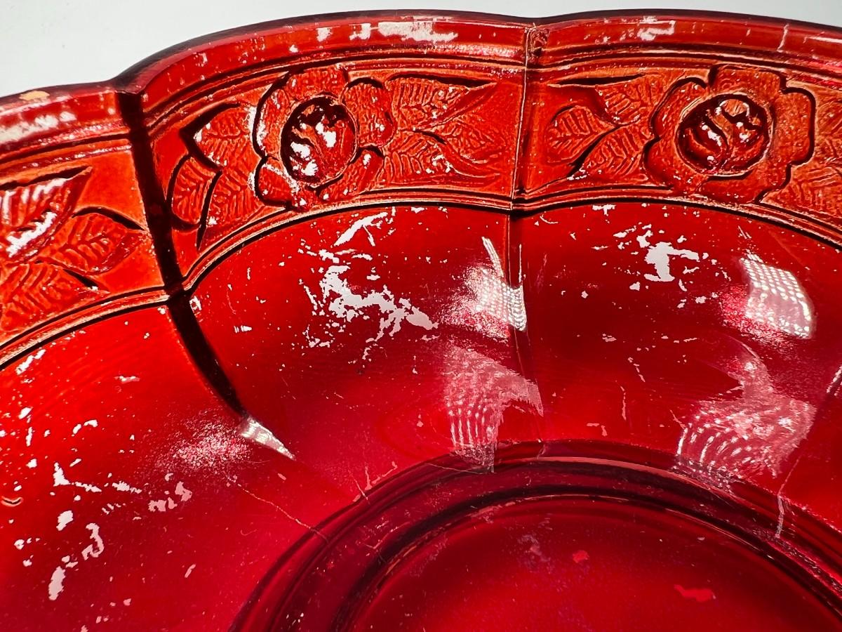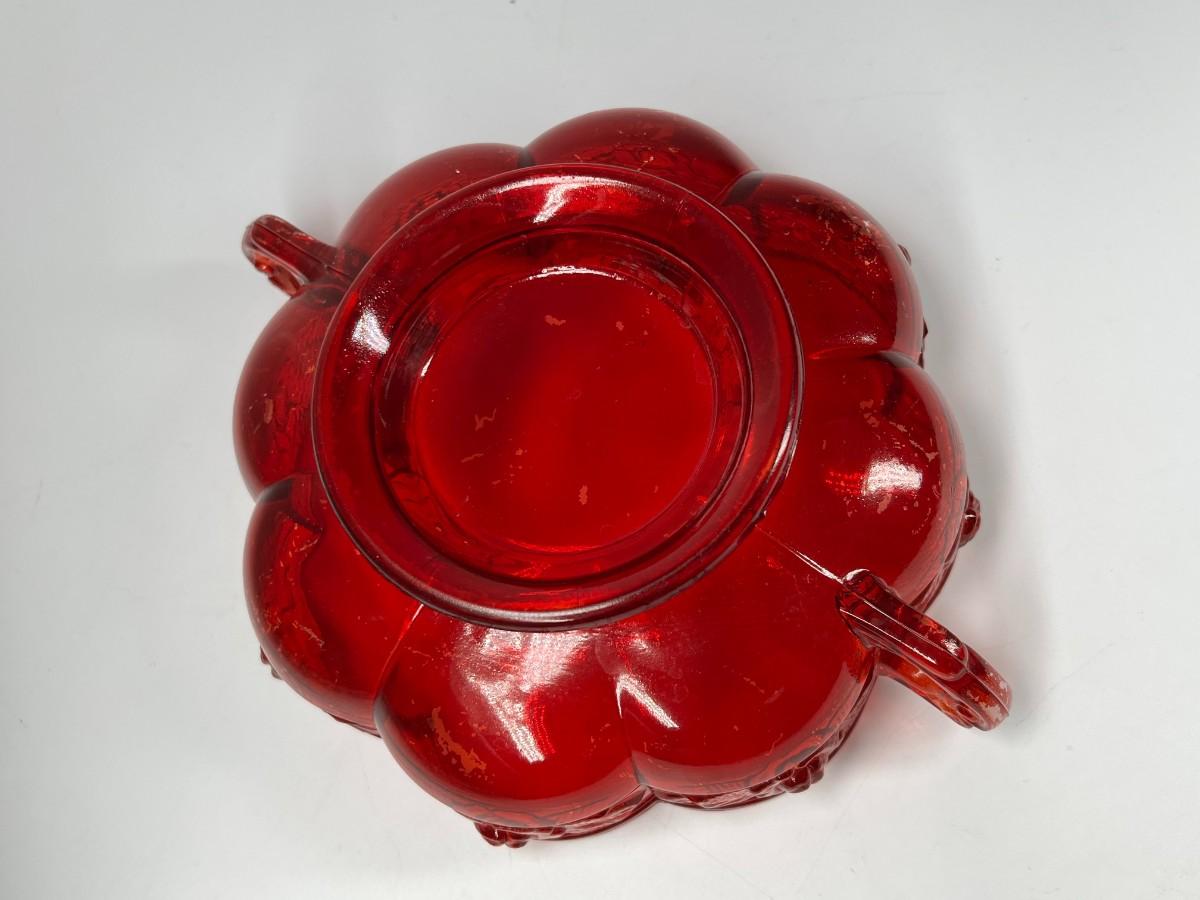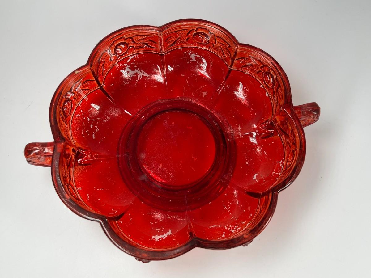 Vintage Red Rosebud Flower Glass Decorative Bowl, there is some light vintage wear, but there is no significant damage and is in good displayable condition. Check pictures for more details and for sizing.