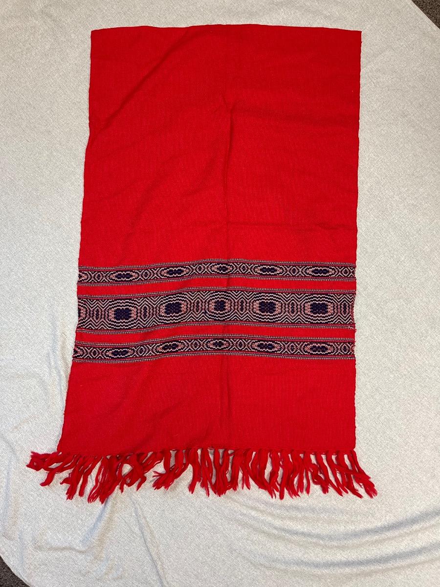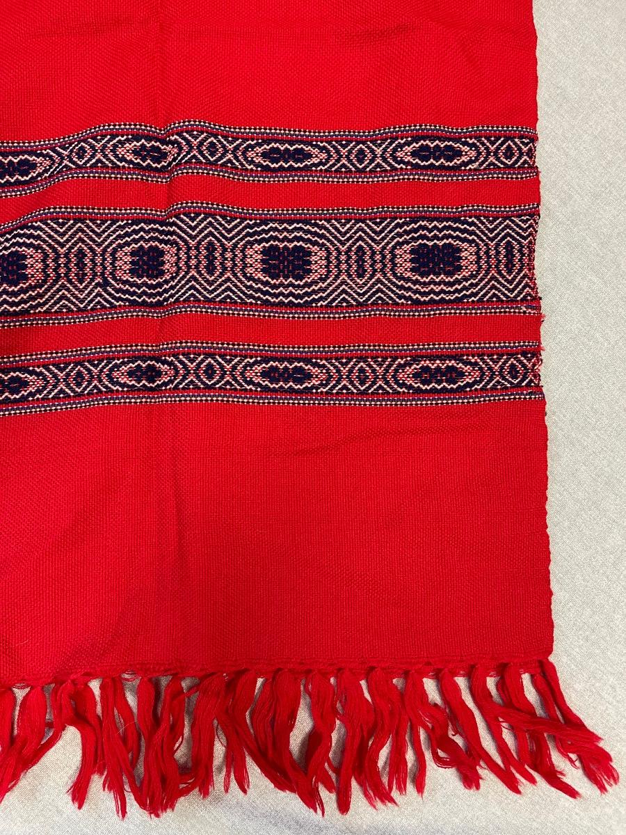 Vintage Red Fringed Scarf w Navy Blue & White Geometric Design
