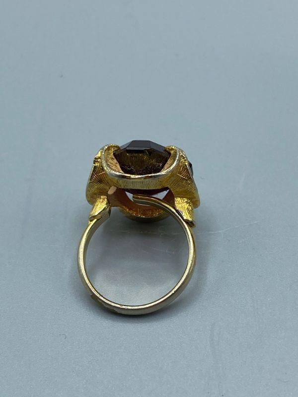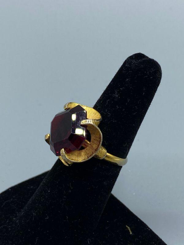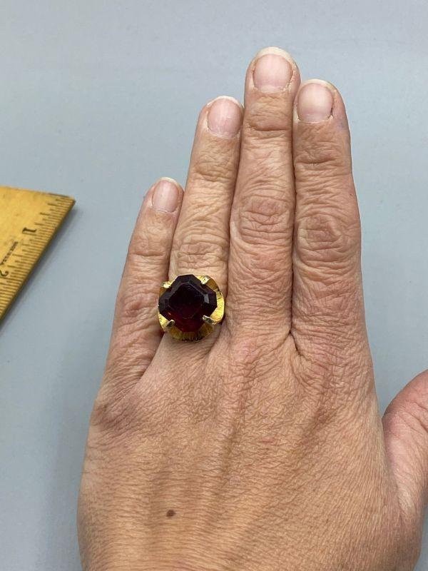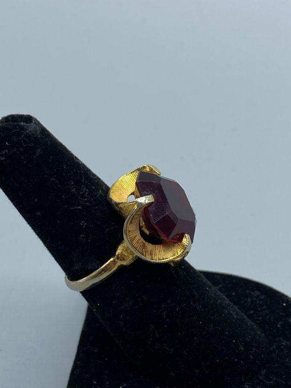 Vintage gold tone adjustable cocktail ring. Large dark red stone.