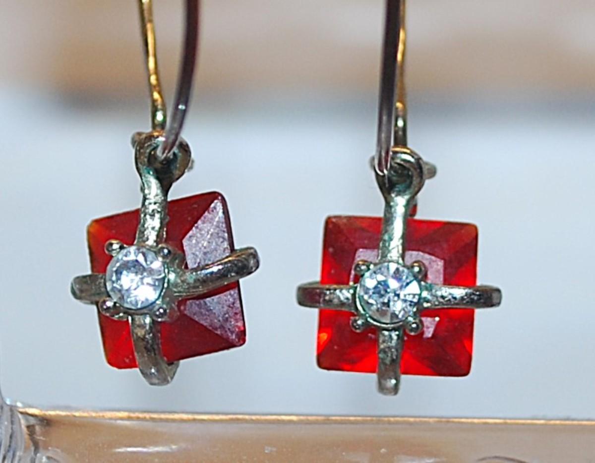 Vintage RED Wrapped Holiday Presents EARRINGS Pair (1¾" Diam.) with a Single Stone and Silver Colored Ribbon on a Hoop Style Clasp