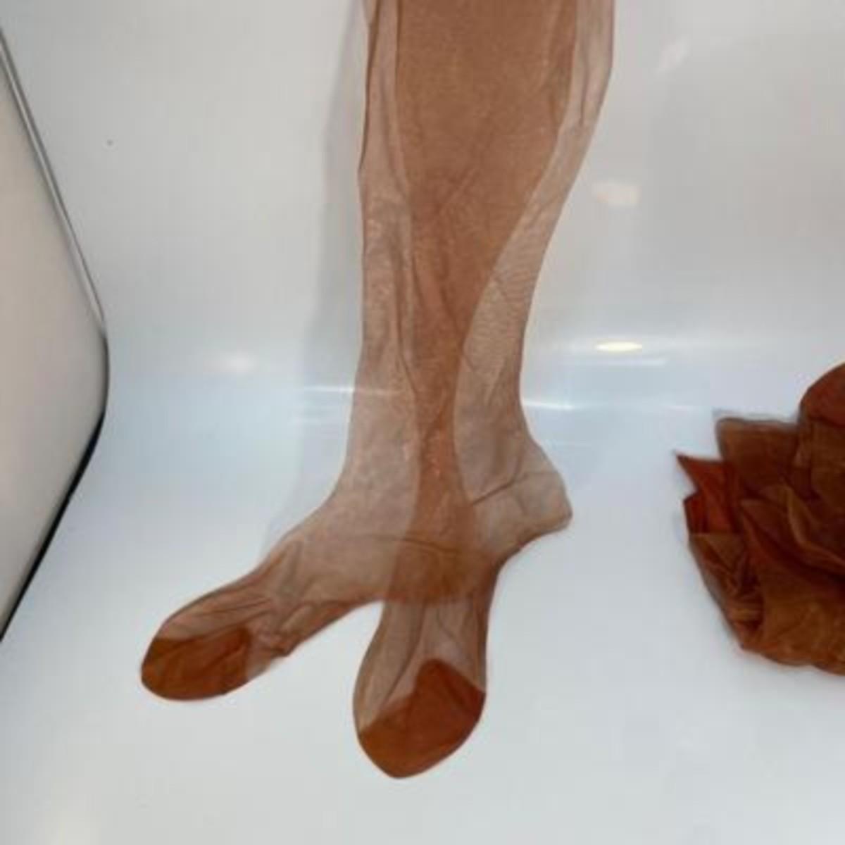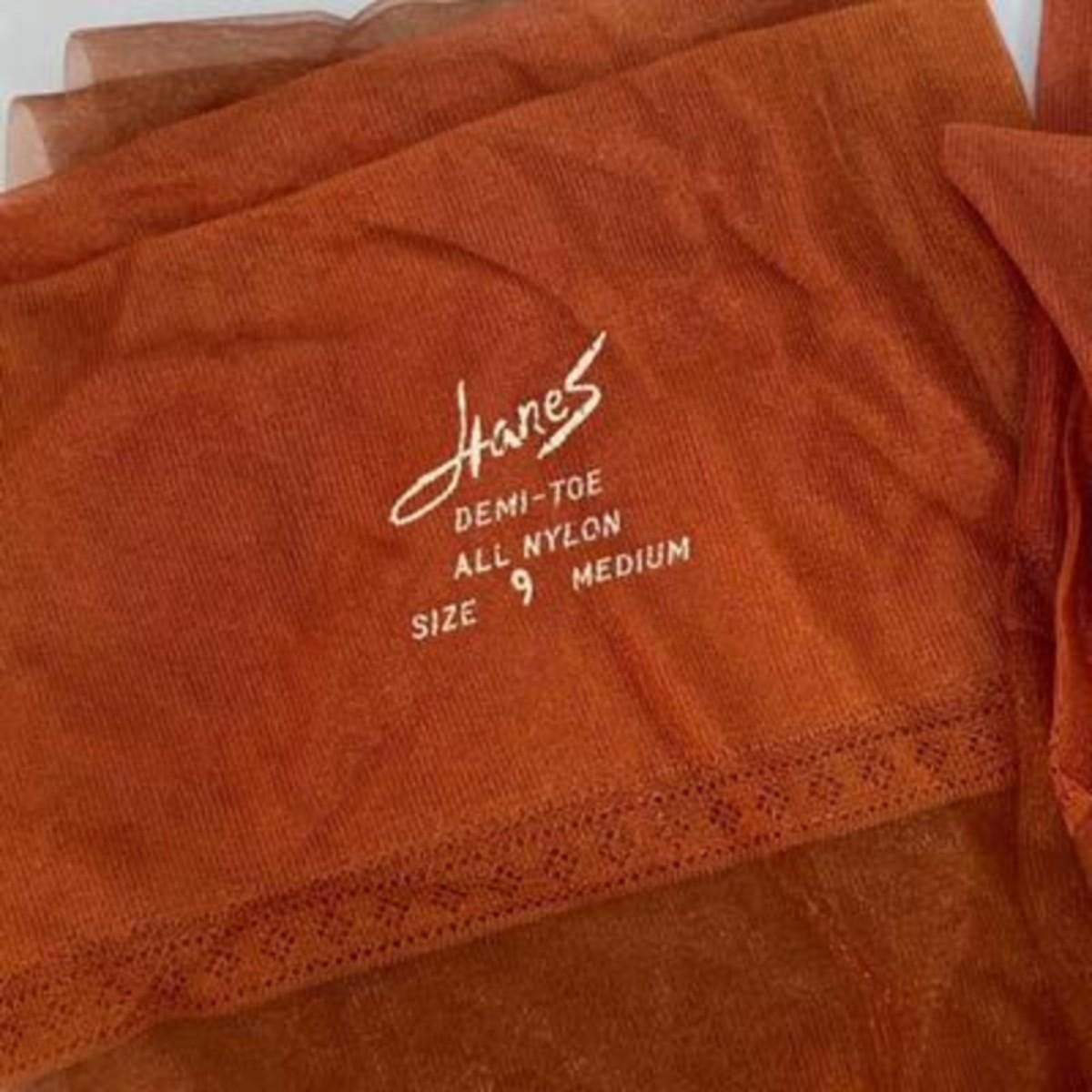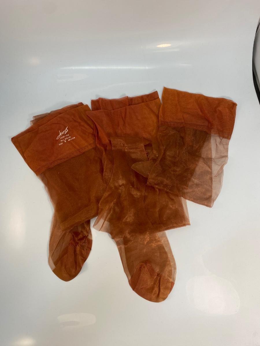 Vintage Reddish Tan Thigh High Nylon Stockings 2.5 Pairs Hanes Medium. There are 2 pairs and one extra stocking. In overall good vintage condition, wearable.
