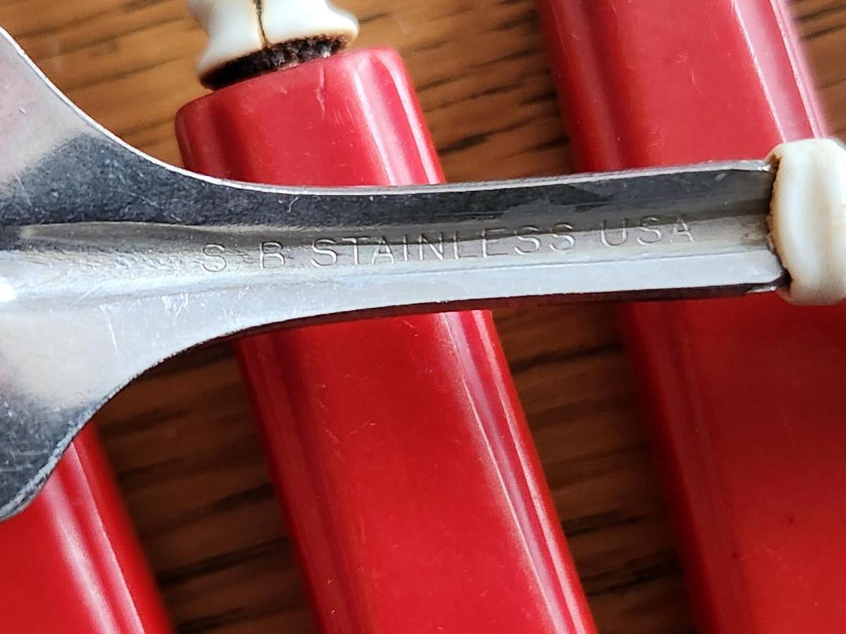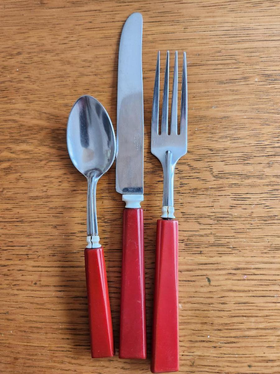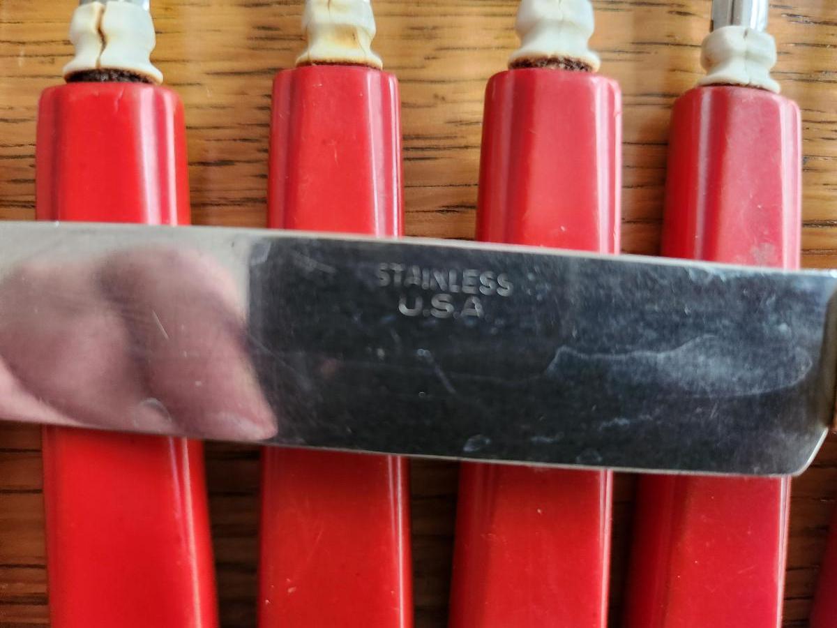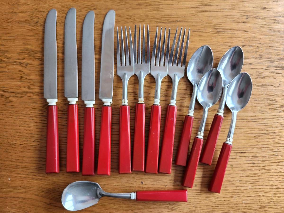 This auction lot is for a gathering of Vintage Red-Handled Tableware. This offering inclues service for four with knife, fork and spoon. Additionally there is a sugar spoon, one more knife and two forks. In nice condition for there age. Marked stainless steel. Ready for your vintage table setting.