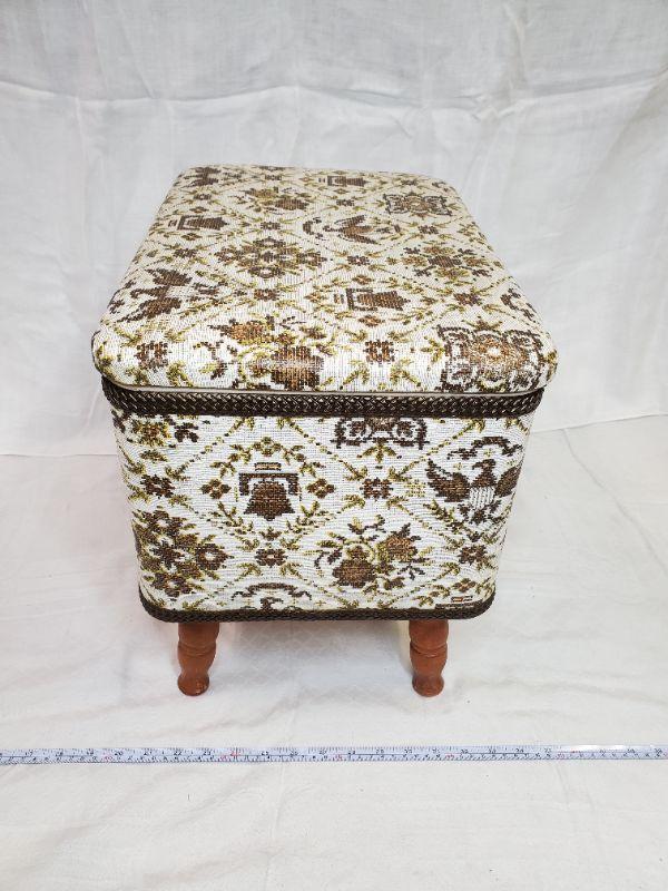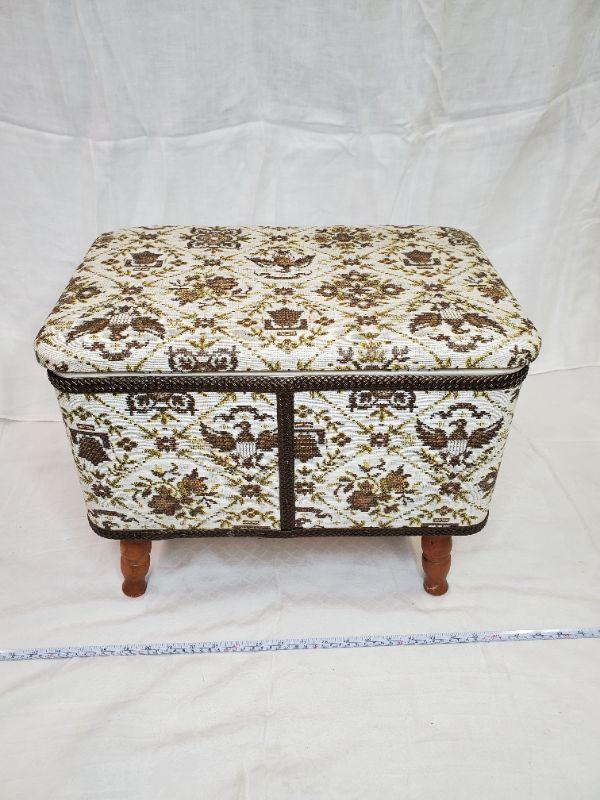 This vintage sewing box also serves as a stool. Solid and clean, overall good condition!