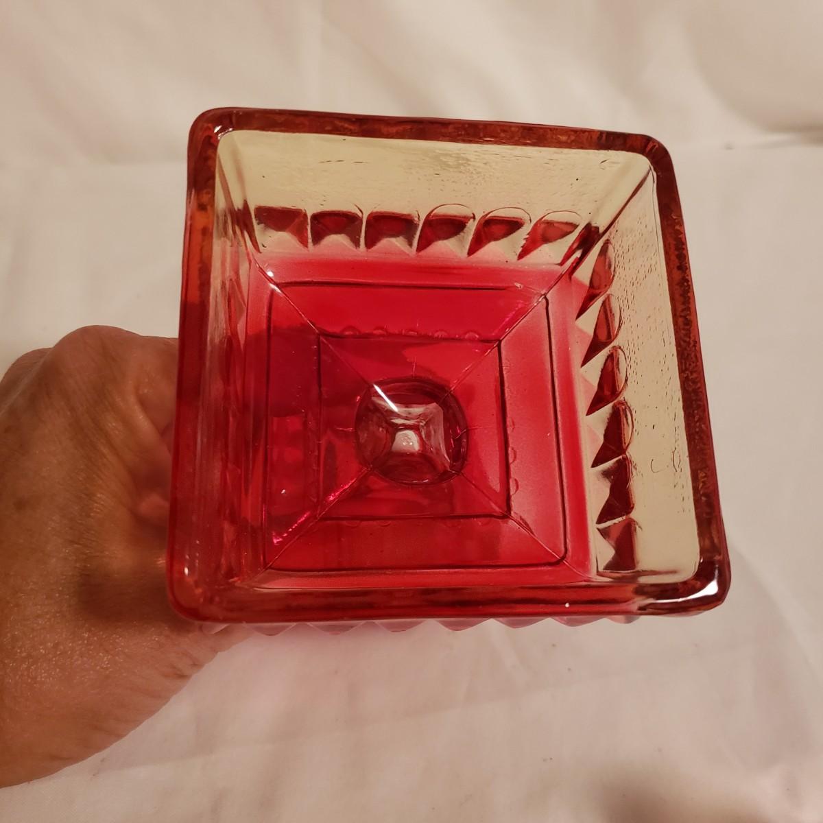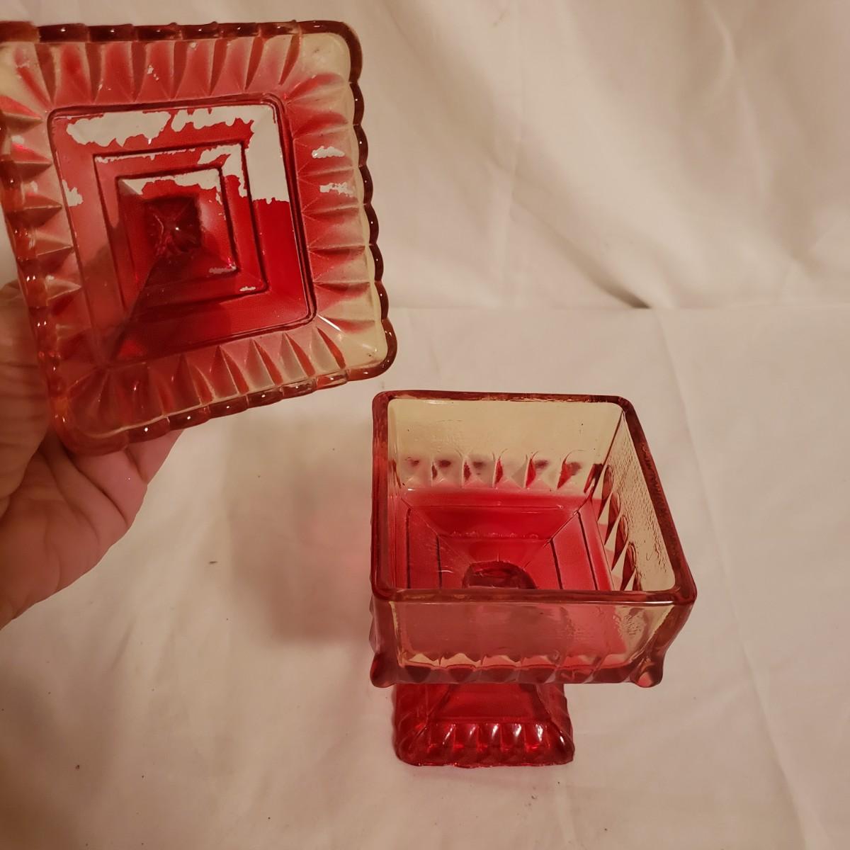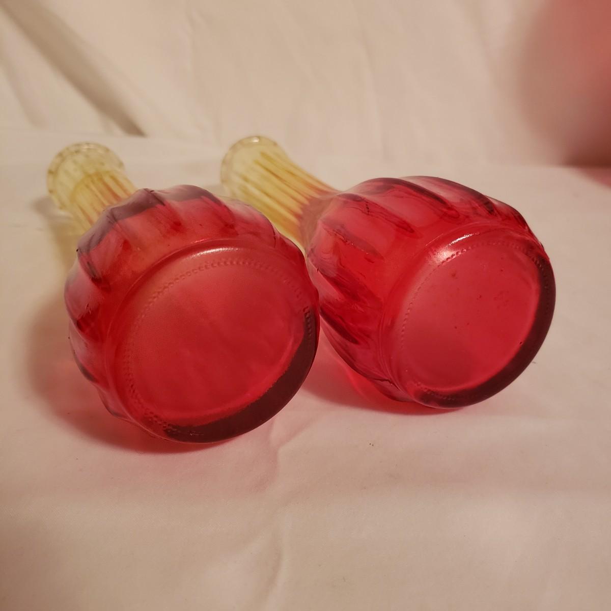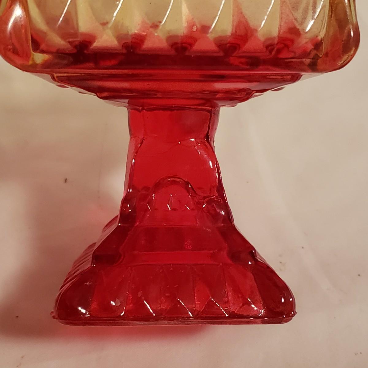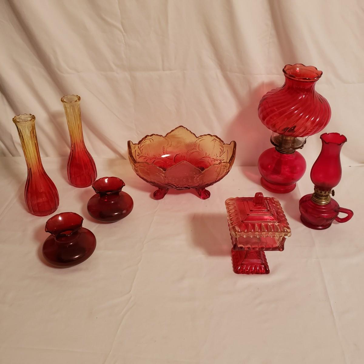 This eight piece lot features red and yellow umbra glassware. The pair of red/yellow umbra bud vases are perfect for your yard flowers! The pair of small red, scallop top vases measure 4" x 3.5"H. The largest oil lamp appears to never had been used. The hurricane glass has a spiral texture to it. The smaller lamp made in Hong Kong also appears to never had been used. The last two pieces are a possible Jeannette Glass bowl and lidded candy dish. The bowl measures approximately 10" x 6" x 5"H. There is a part on the bottom where the red finish chipped off. The same happened on the candy dish. See pictures for details.