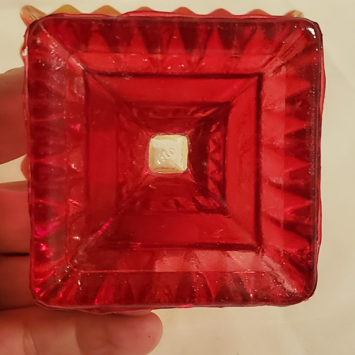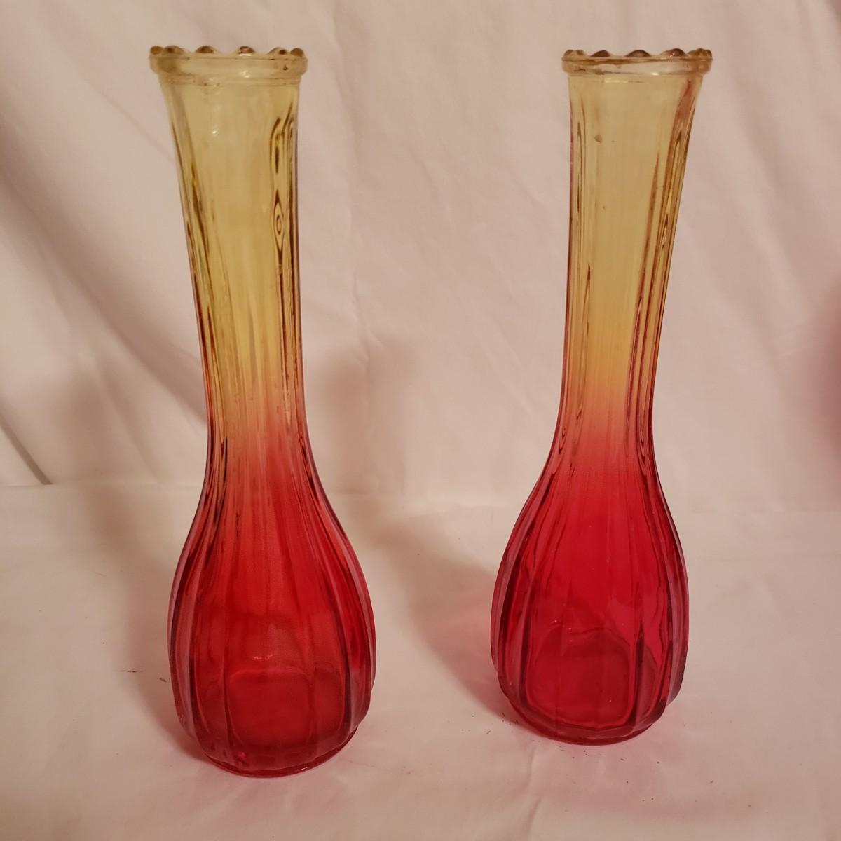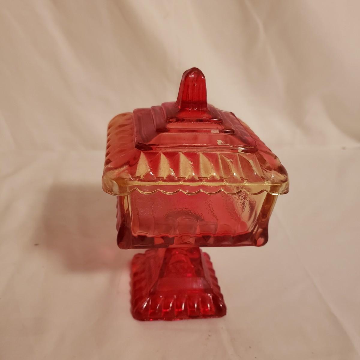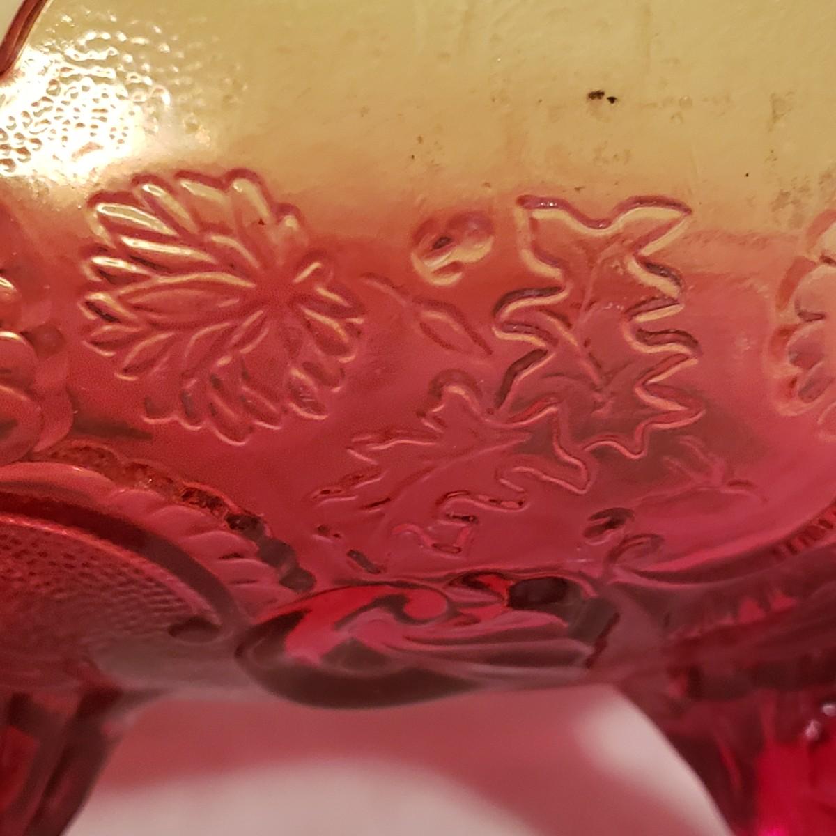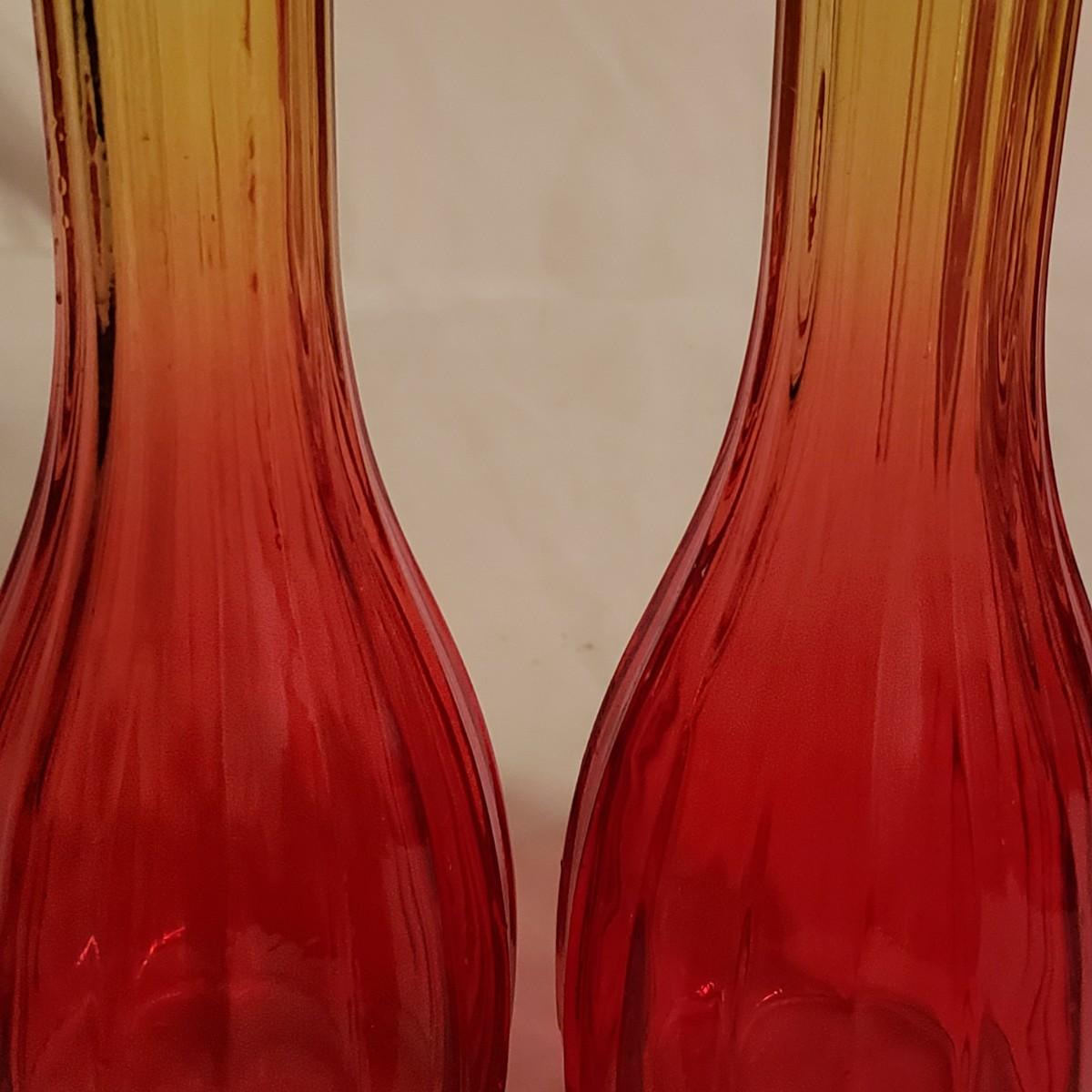 This eight piece lot features red and yellow umbra glassware. The pair of red/yellow umbra bud vases are perfect for your yard flowers! The pair of small red, scallop top vases measure 4" x 3.5"H. The largest oil lamp appears to never had been used. The hurricane glass has a spiral texture to it. The smaller lamp made in Hong Kong also appears to never had been used. The last two pieces are a possible Jeannette Glass bowl and lidded candy dish. The bowl measures approximately 10" x 6" x 5"H. There is a part on the bottom where the red finish chipped off. The same happened on the candy dish. See pictures for details.