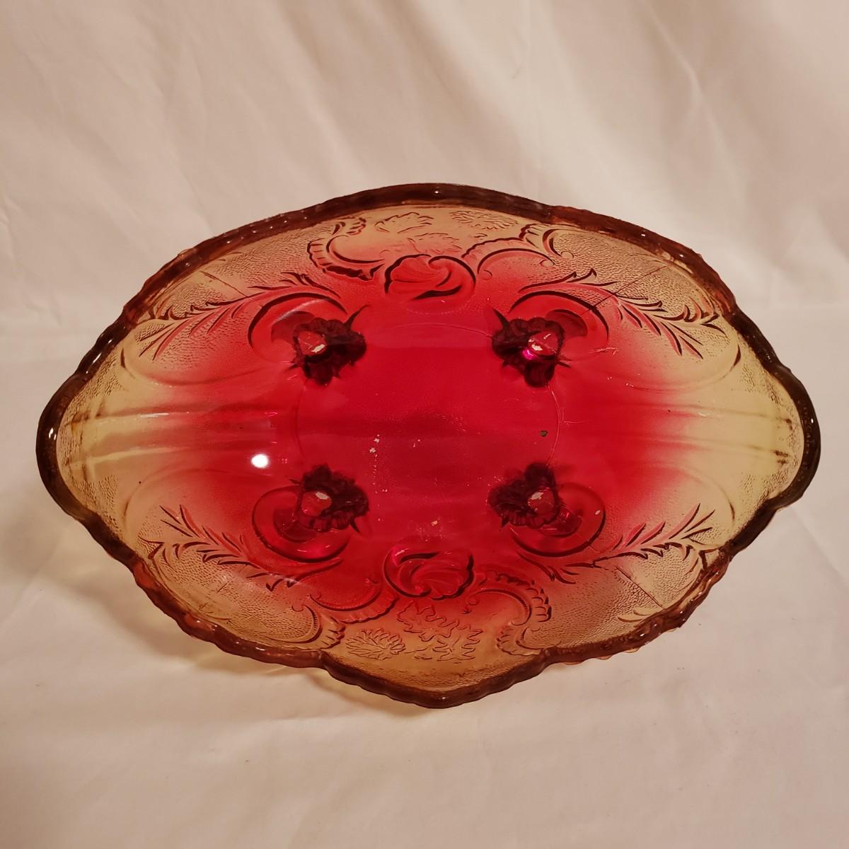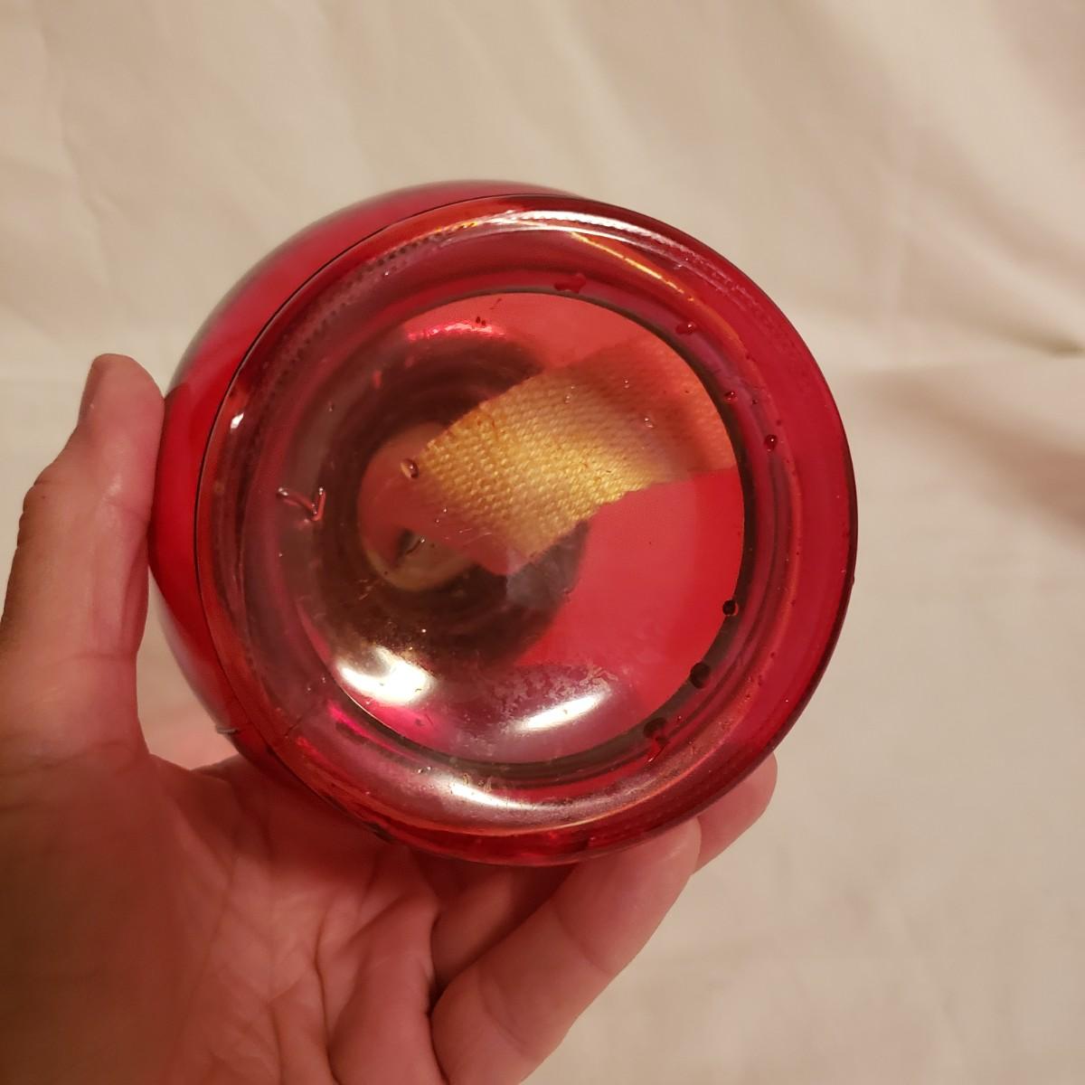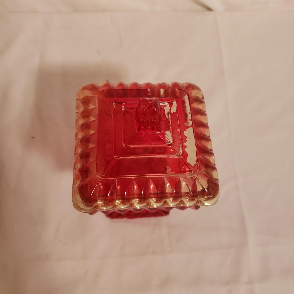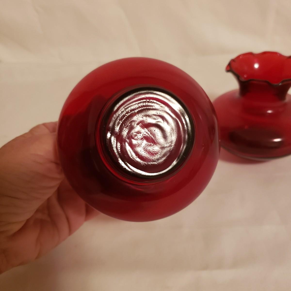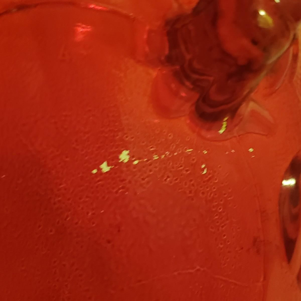 This eight piece lot features red and yellow umbra glassware. The pair of red/yellow umbra bud vases are perfect for your yard flowers! The pair of small red, scallop top vases measure 4" x 3.5"H. The largest oil lamp appears to never had been used. The hurricane glass has a spiral texture to it. The smaller lamp made in Hong Kong also appears to never had been used. The last two pieces are a possible Jeannette Glass bowl and lidded candy dish. The bowl measures approximately 10" x 6" x 5"H. There is a part on the bottom where the red finish chipped off. The same happened on the candy dish. See pictures for details.