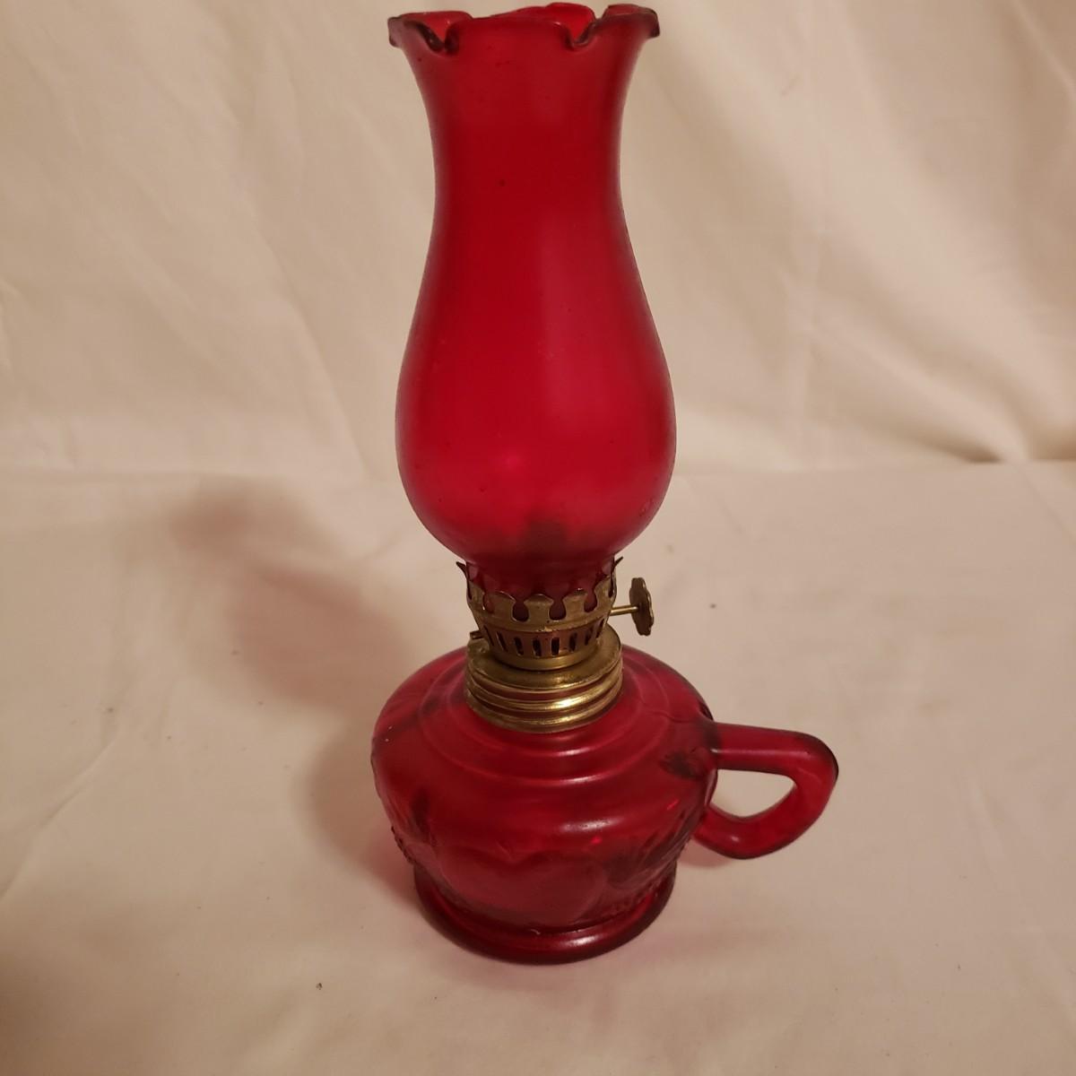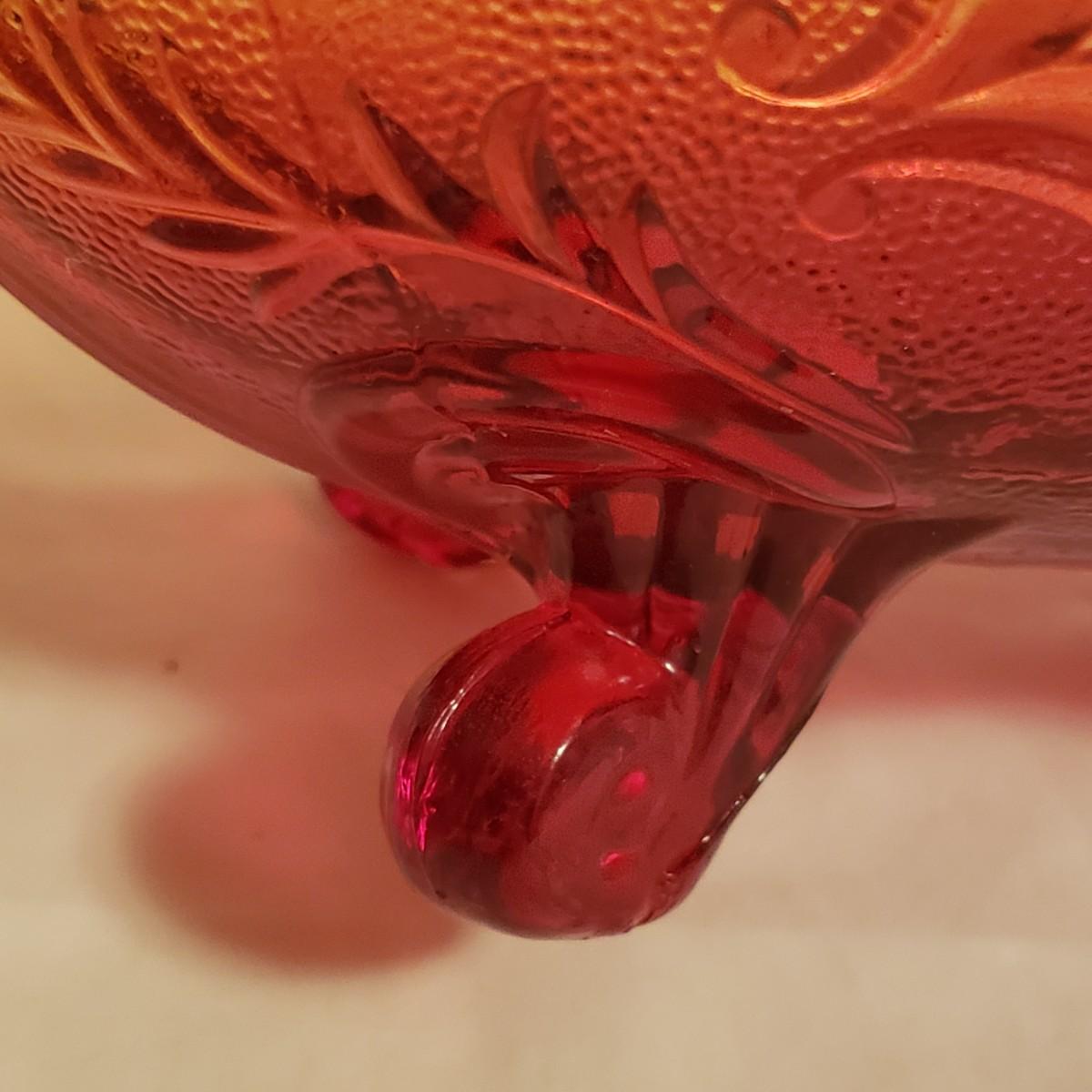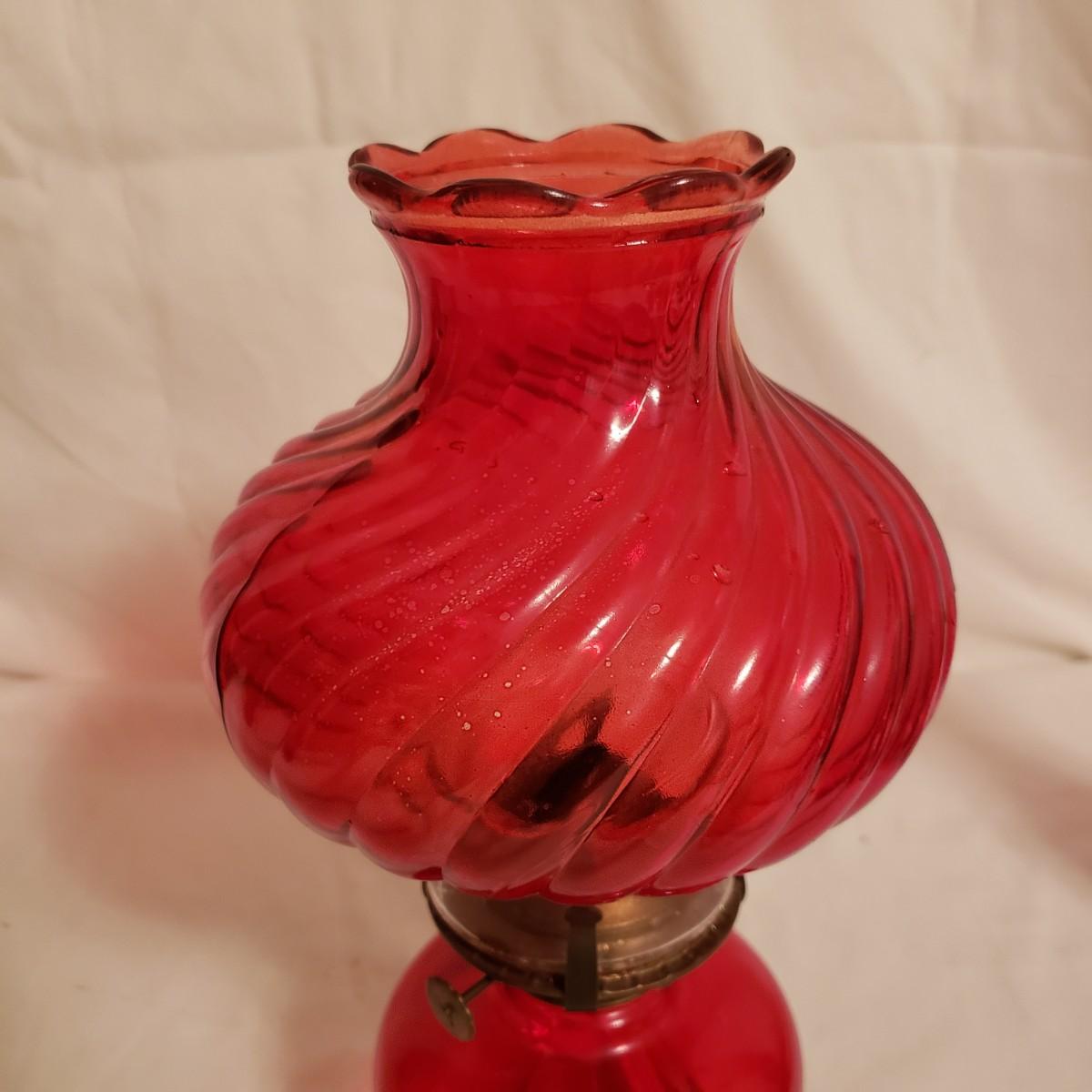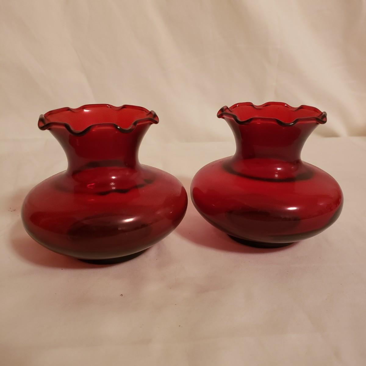 This eight piece lot features red and yellow umbra glassware. The pair of red/yellow umbra bud vases are perfect for your yard flowers! The pair of small red, scallop top vases measure 4" x 3.5"H. The largest oil lamp appears to never had been used. The hurricane glass has a spiral texture to it. The smaller lamp made in Hong Kong also appears to never had been used. The last two pieces are a possible Jeannette Glass bowl and lidded candy dish. The bowl measures approximately 10" x 6" x 5"H. There is a part on the bottom where the red finish chipped off. The same happened on the candy dish. See pictures for details.