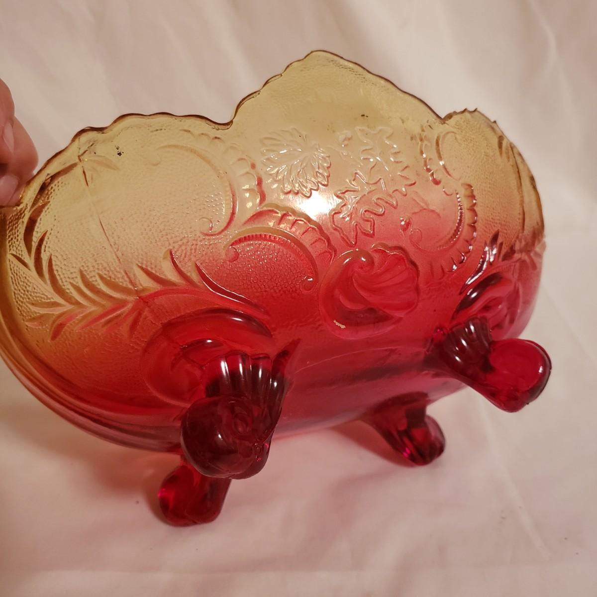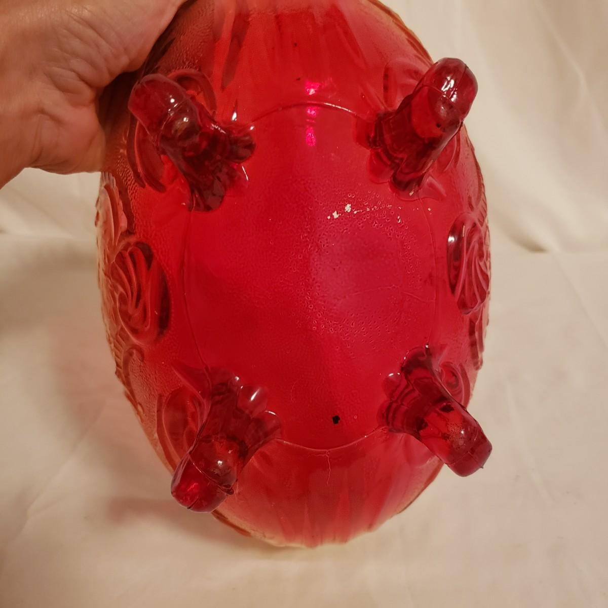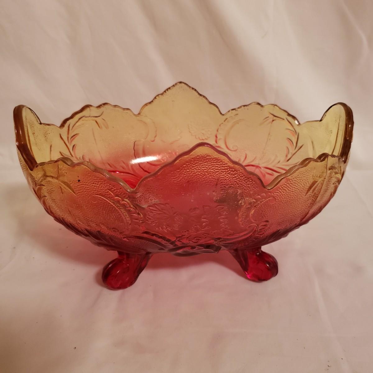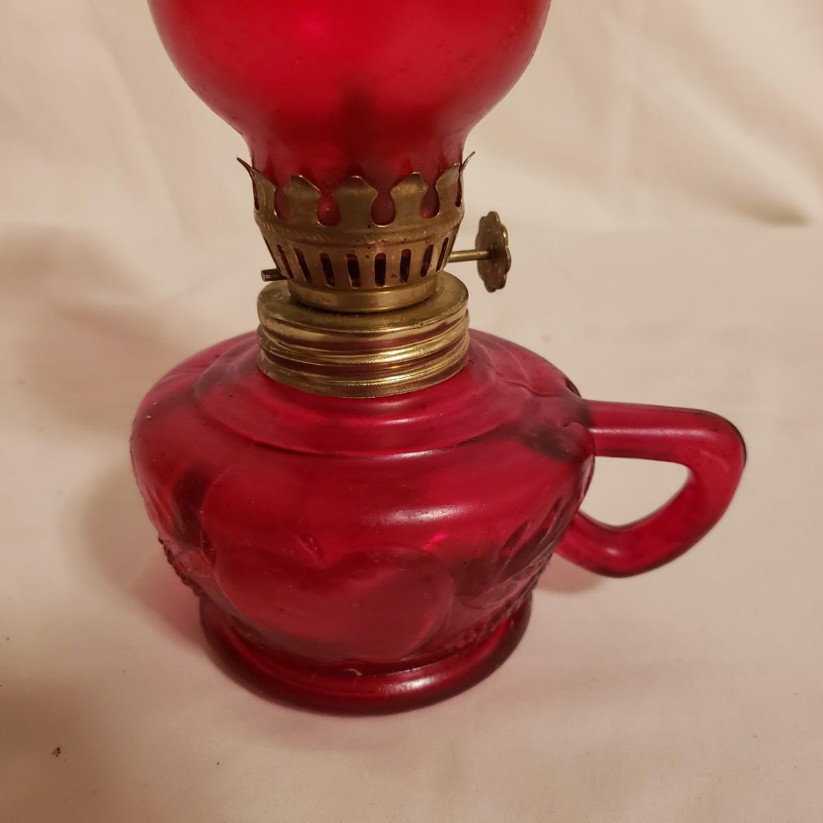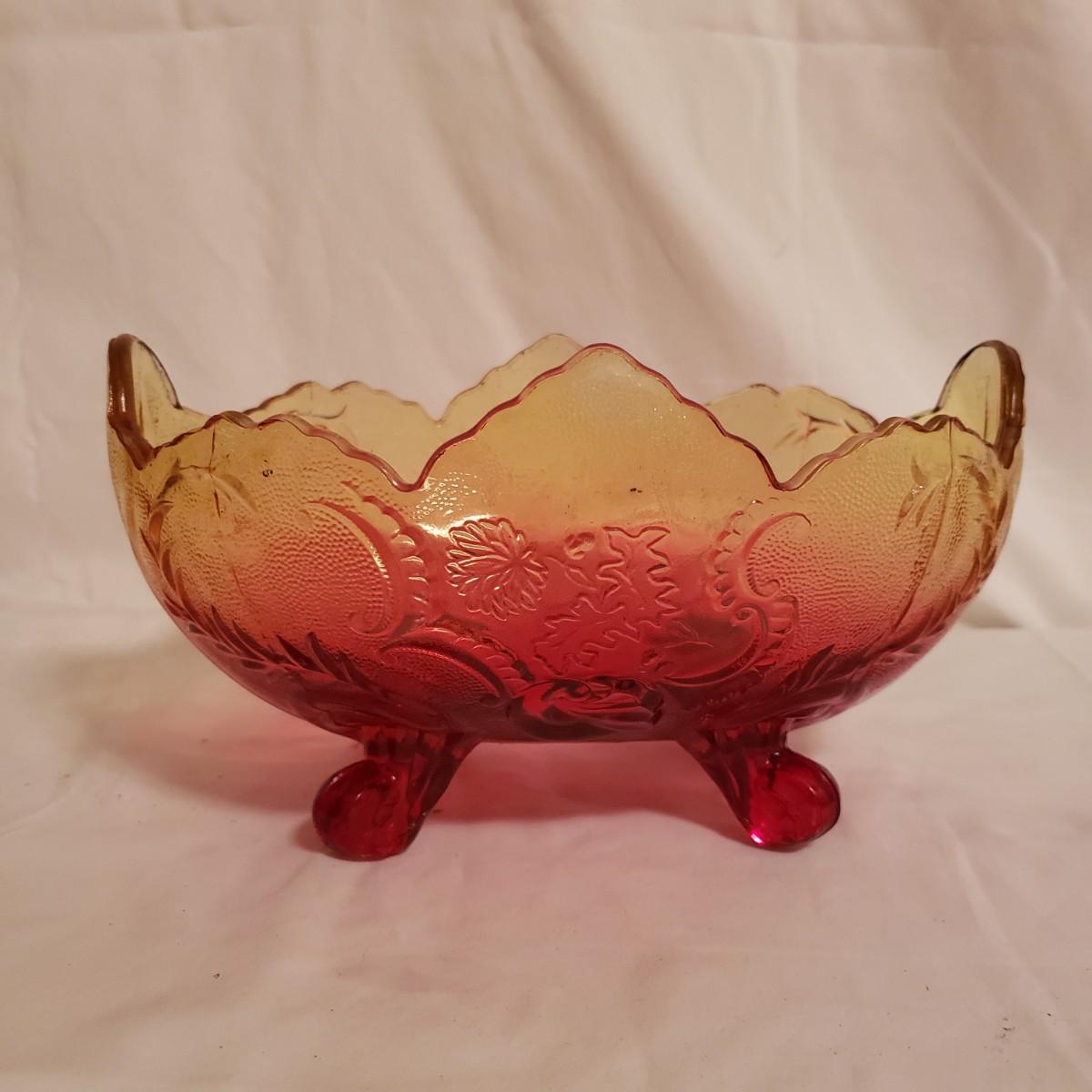 This eight piece lot features red and yellow umbra glassware. The pair of red/yellow umbra bud vases are perfect for your yard flowers! The pair of small red, scallop top vases measure 4" x 3.5"H. The largest oil lamp appears to never had been used. The hurricane glass has a spiral texture to it. The smaller lamp made in Hong Kong also appears to never had been used. The last two pieces are a possible Jeannette Glass bowl and lidded candy dish. The bowl measures approximately 10" x 6" x 5"H. There is a part on the bottom where the red finish chipped off. The same happened on the candy dish. See pictures for details.
