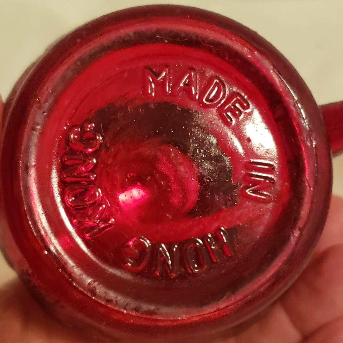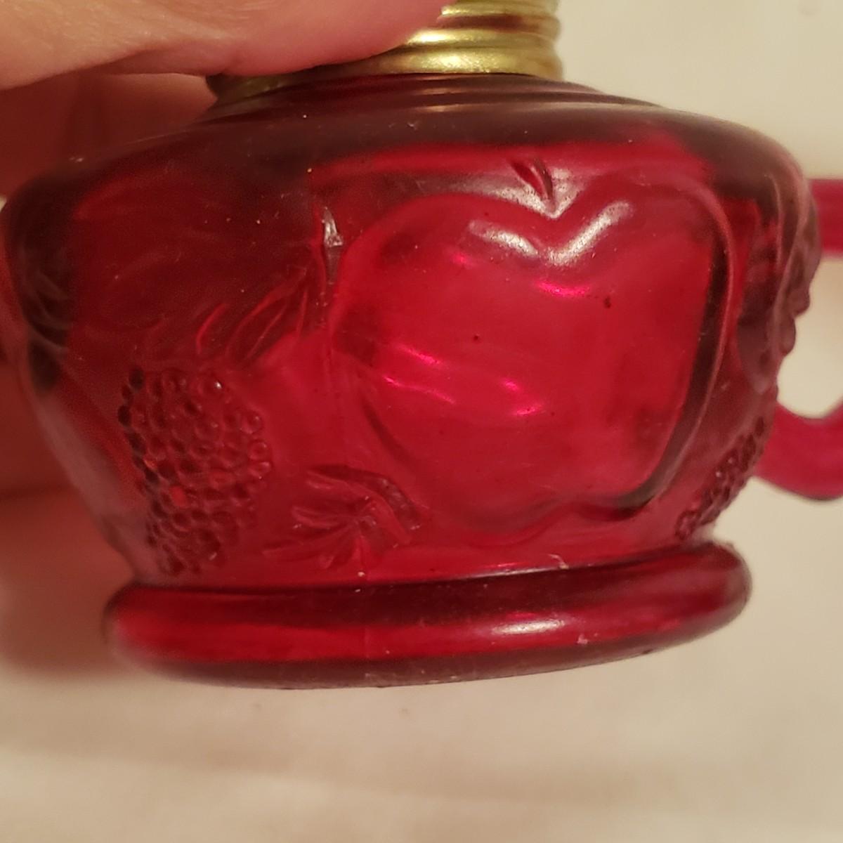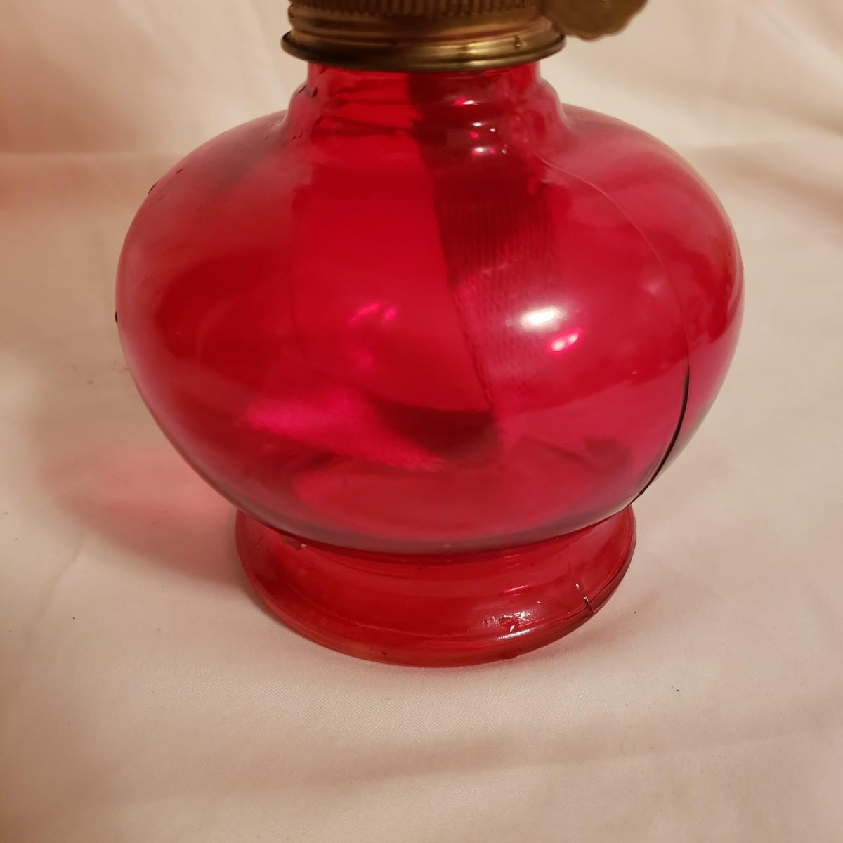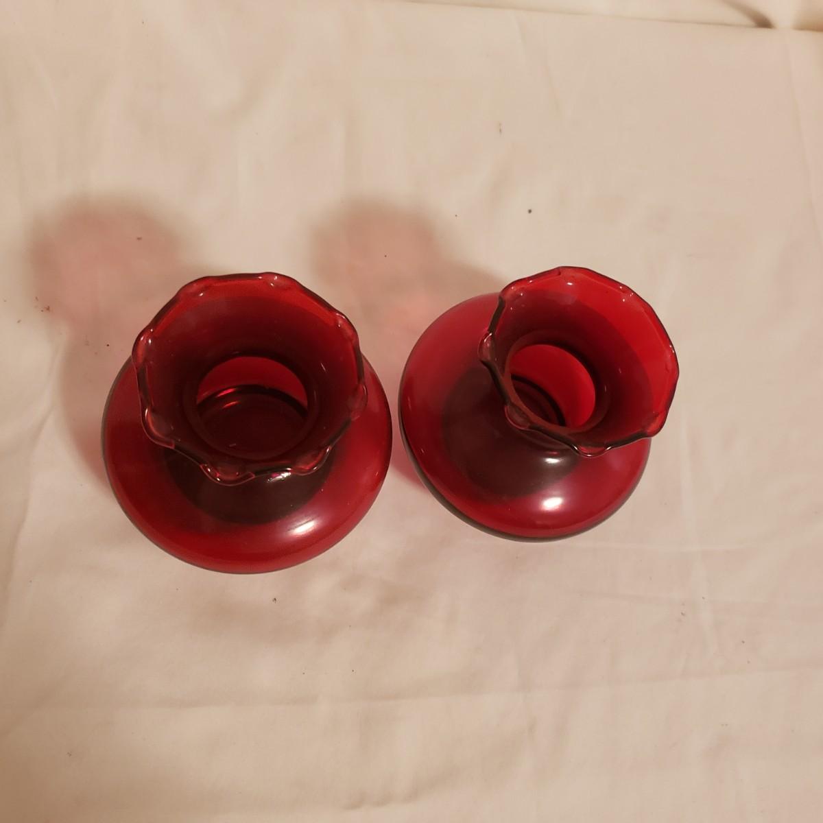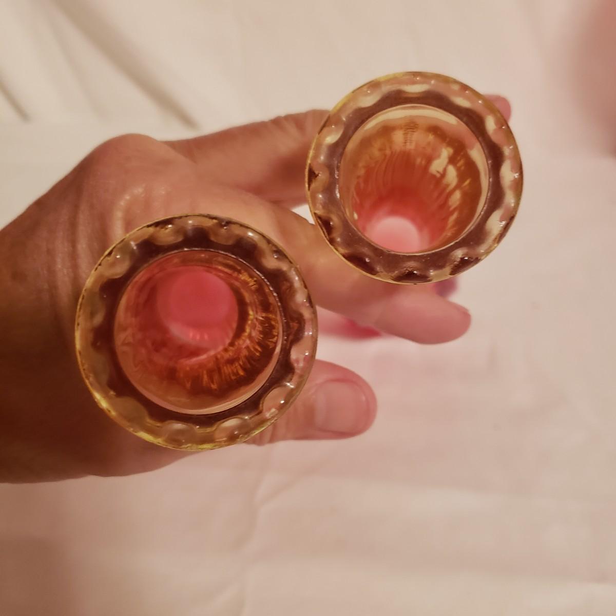 This eight piece lot features red and yellow umbra glassware. The pair of red/yellow umbra bud vases are perfect for your yard flowers! The pair of small red, scallop top vases measure 4" x 3.5"H. The largest oil lamp appears to never had been used. The hurricane glass has a spiral texture to it. The smaller lamp made in Hong Kong also appears to never had been used. The last two pieces are a possible Jeannette Glass bowl and lidded candy dish. The bowl measures approximately 10" x 6" x 5"H. There is a part on the bottom where the red finish chipped off. The same happened on the candy dish. See pictures for details.