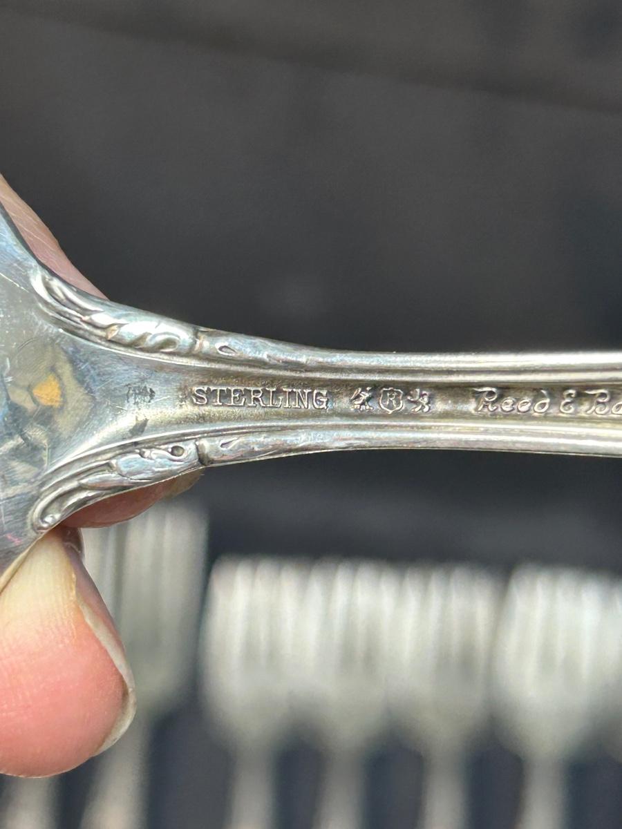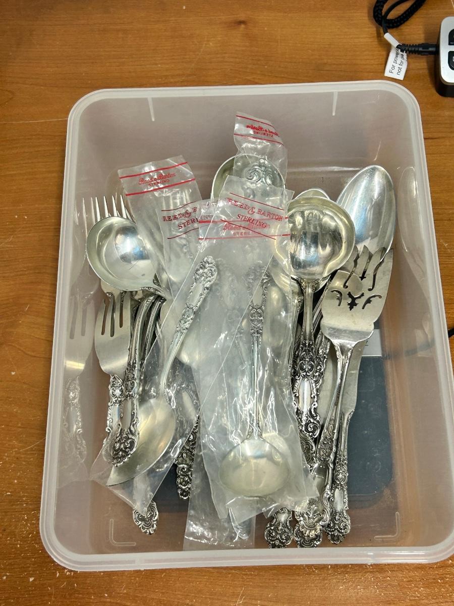 Vintage Reed & Barton Sterling Silver Flatware Set Service for 6 with Serving Pieces and Wood Storage Box. Heavy sterling silver flatware. Service for 6 with a couple extras. Setting includes dinner knife, dinner fork, salad fork, soup spoon, teaspoon, and butter knife. Hostess serving set, includes meat fork, two serving spoons, slotted spoon, slicing fork, lemon fork, small ladle, ladle, and jelly spoon. French Renaissance pattern. Comes with cloth covers and display storage box. Flatware weighs approx. 2556g; hollow handle pieces weigh 872g.