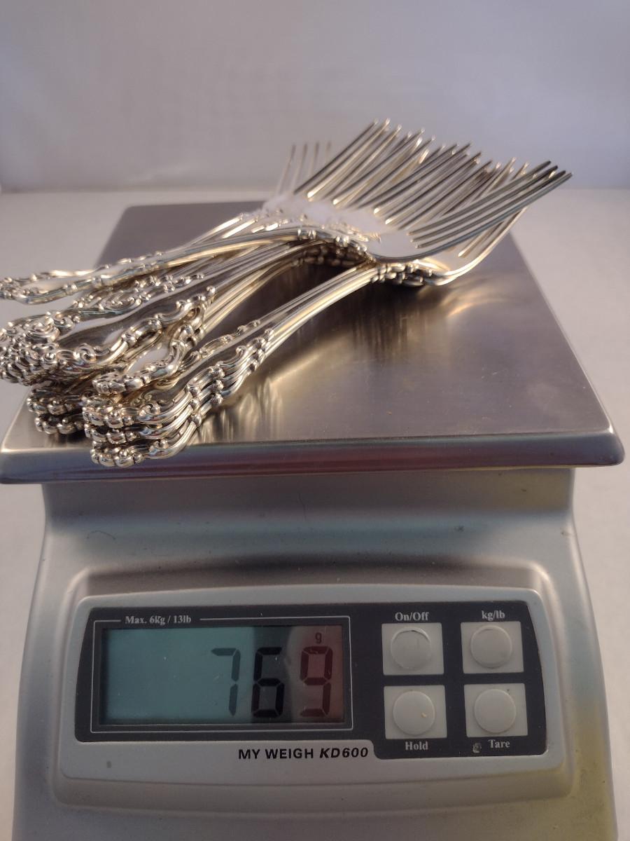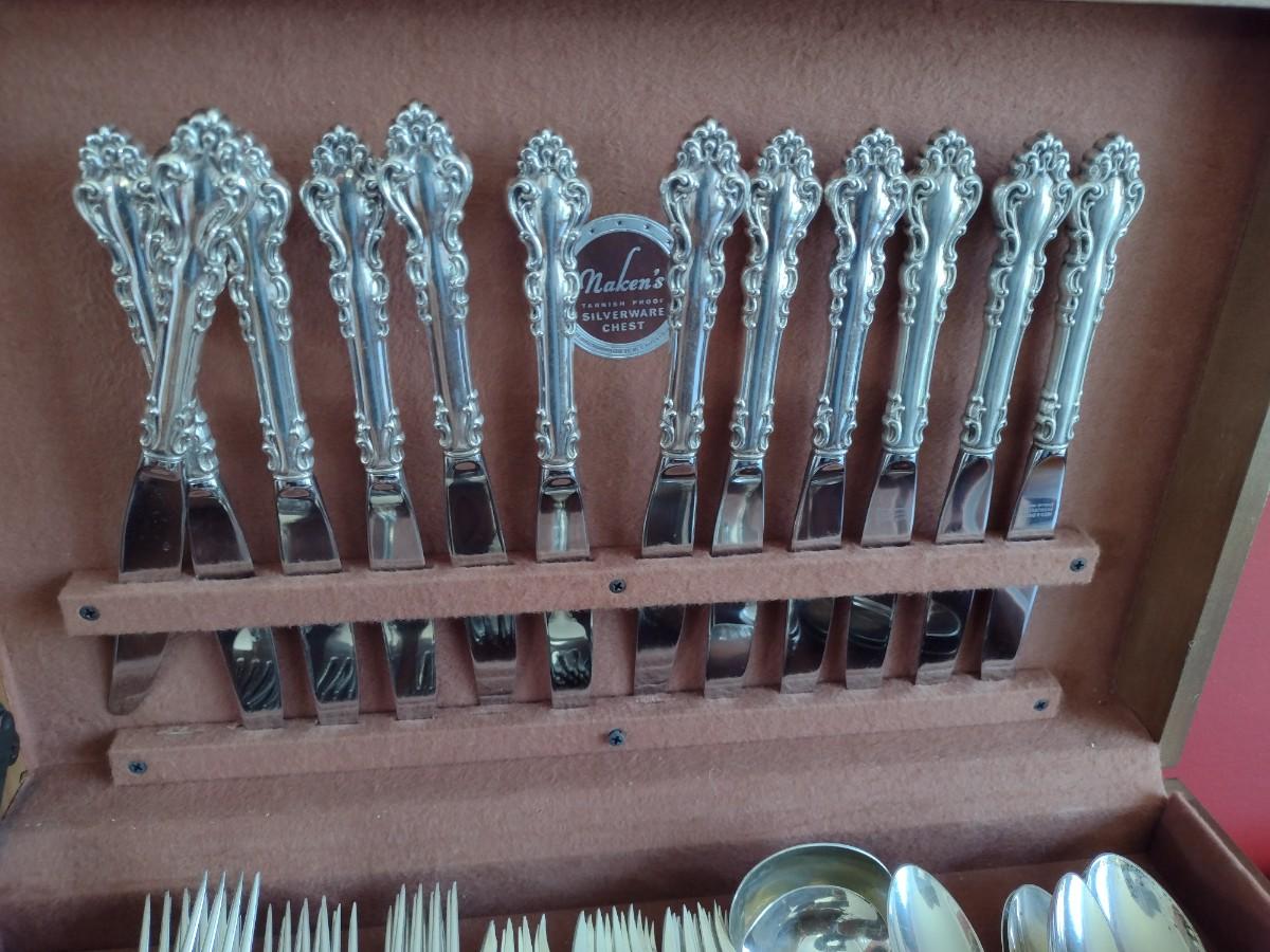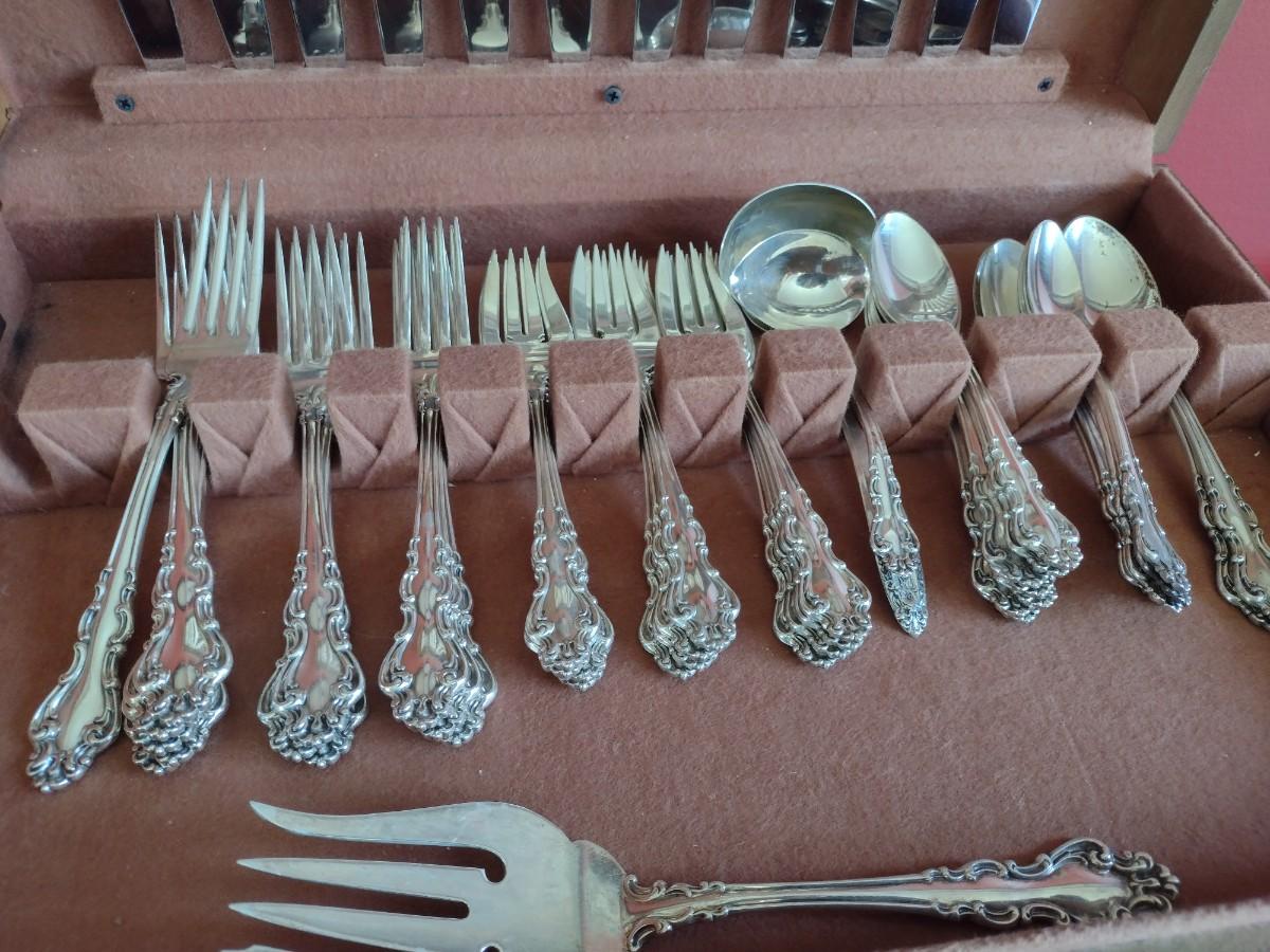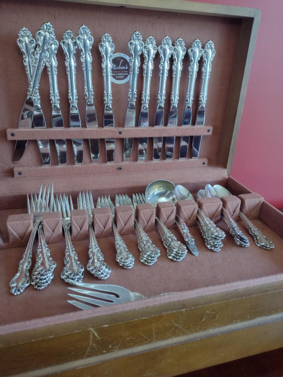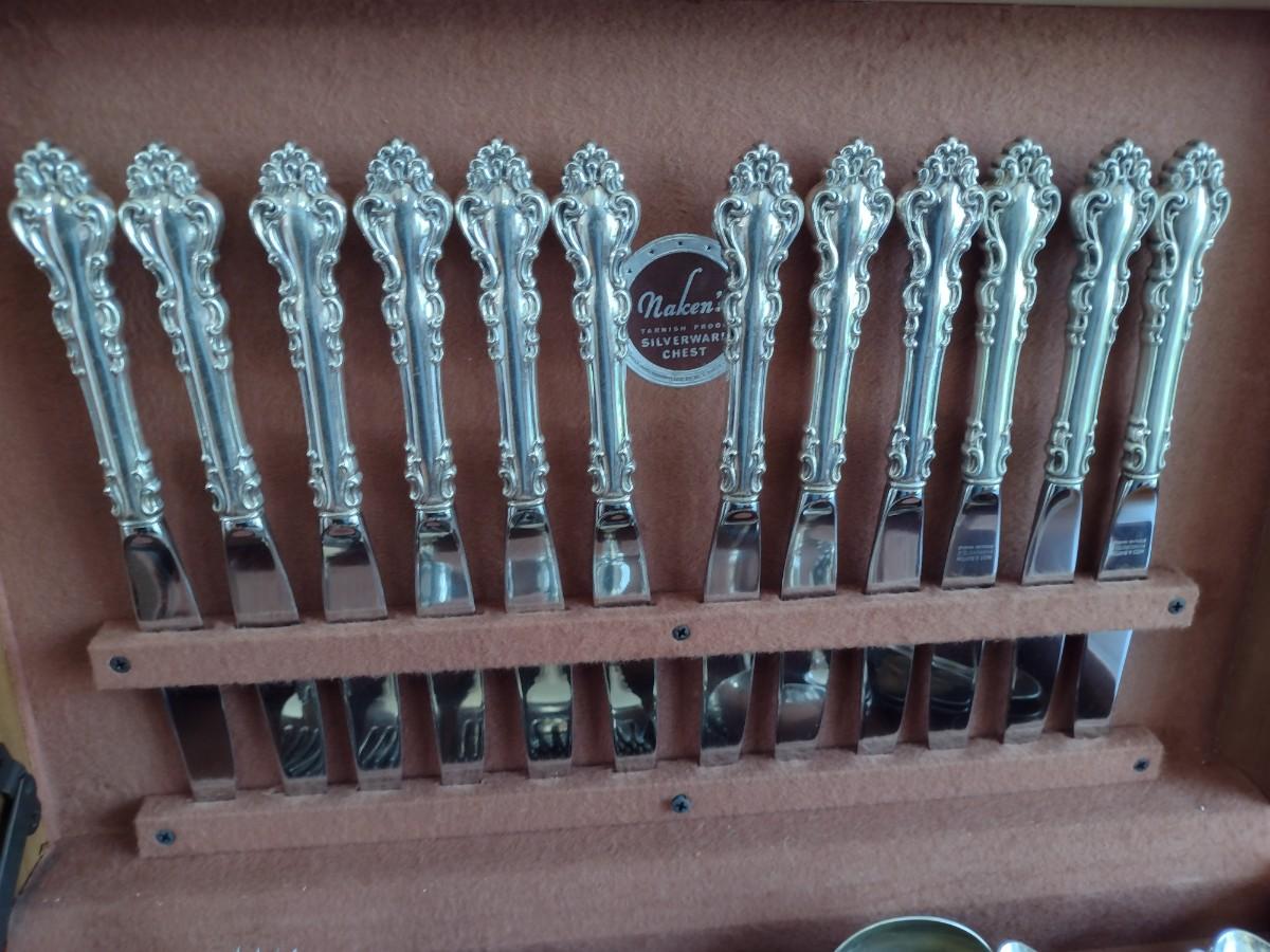Vintage Reed & Barton Sterling Silver Flatware Set in Naken's Tarnish Proof Storage Chest. Approx 72 pieces: Dinner fork- 12, Salad fork- 12, Regular spoon- 12, Large spoon- 2, Dinner knife- 12, Short butter knife- 12, Ladle- 3 (one is not part of the set, but still sterling silver), Serving spoon- 3, Serving fork- 1, Seafood fork- 1, Sugar shell spoon- 1, Fish knife- 1. Total approx weight (not including knives)= 2,442 grams.