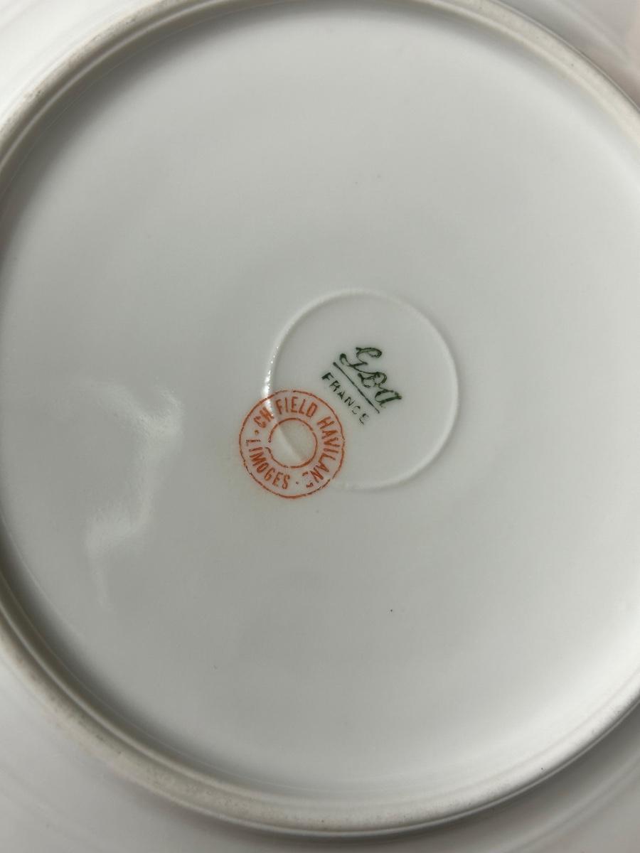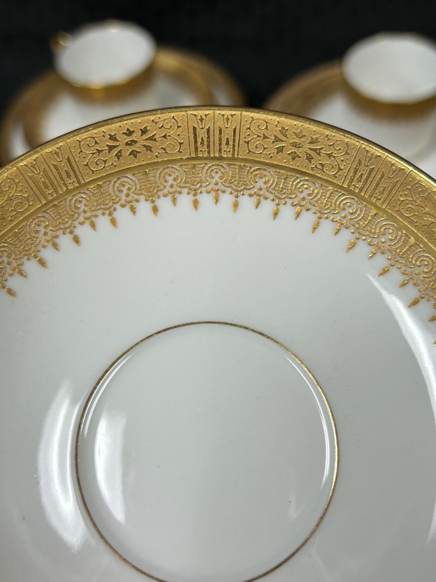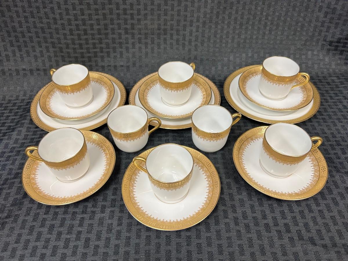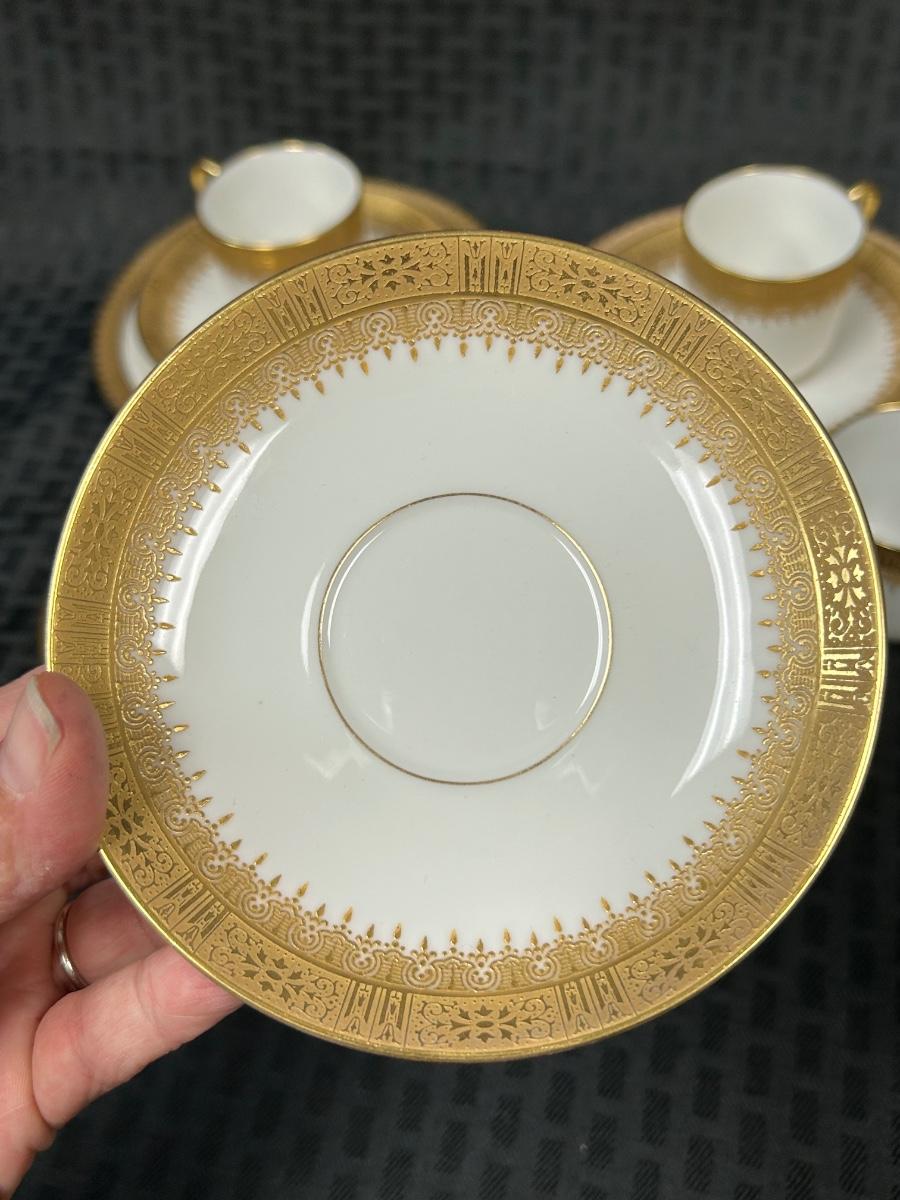 Vintage Regency Style White with Gold Gilt Limoges France Demitasse Teacup and Saucer Plate Set. Stunning gold gilt lace like design around the edges. Stamped Limoges on all pieces. Not a complete set, includes 8 demitasse cups, 6 saucers, and 3 bread/dessert plates. saucers are about 5" and dessert plates are 6". In very good condition, no chips or crazing, may have light wear on outer rim of plate here and there, nothing to noticeable.