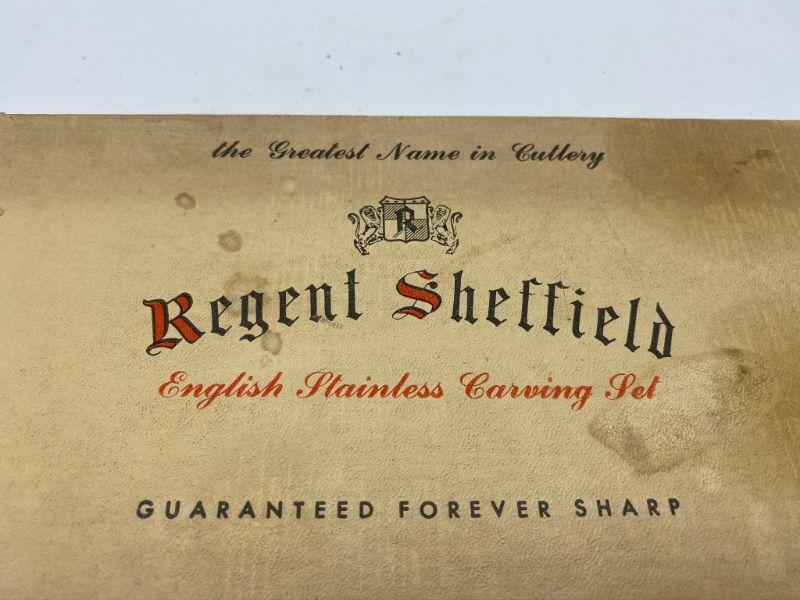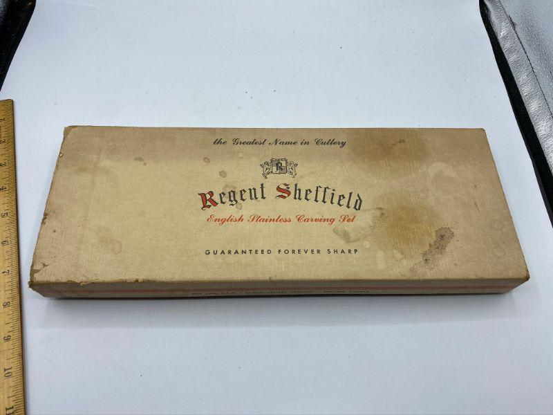 Vintage Regent Sheffield Carving Set. In original box. Lid has some damage. Looks unused.