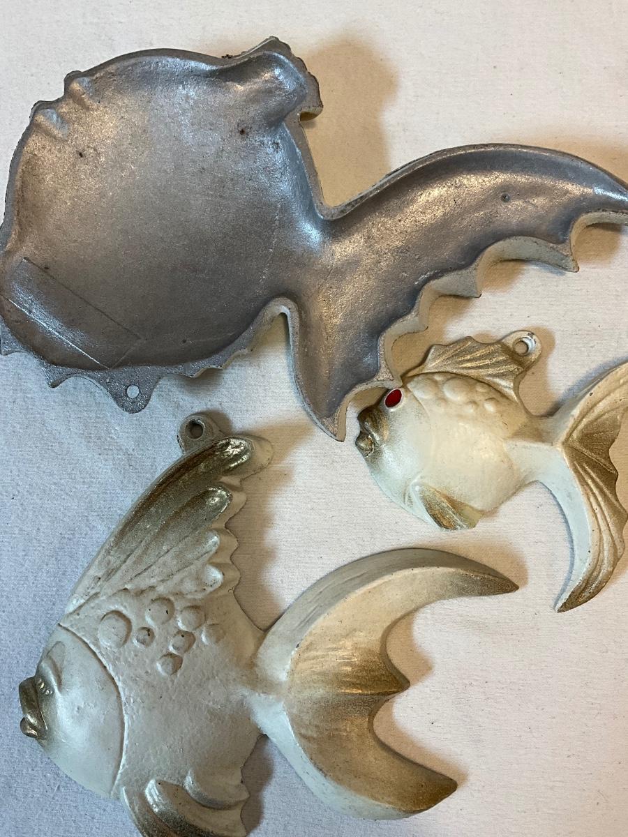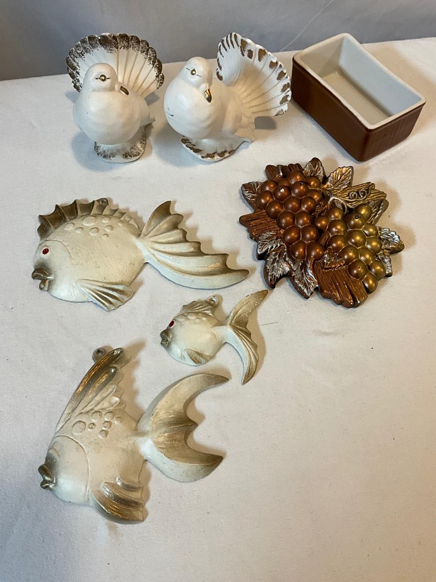 Vintage Regis.Pat.Off Norcrest pigeons, wall decor fish, mini Ceramic loaf pan