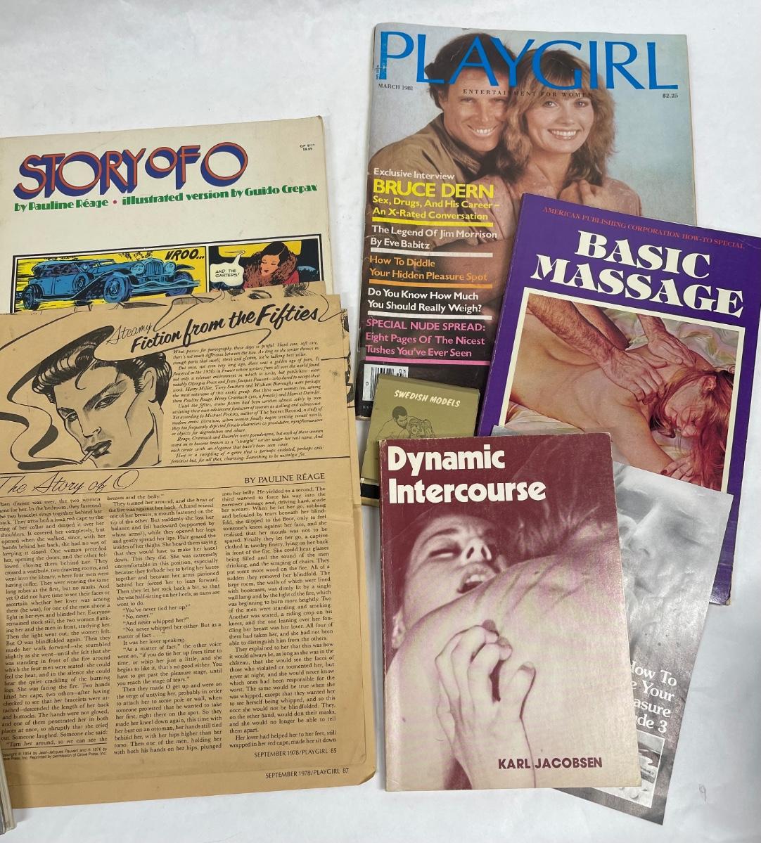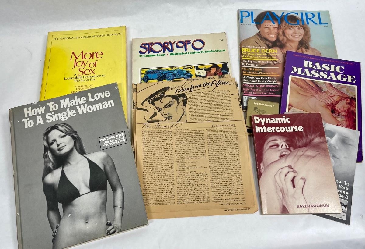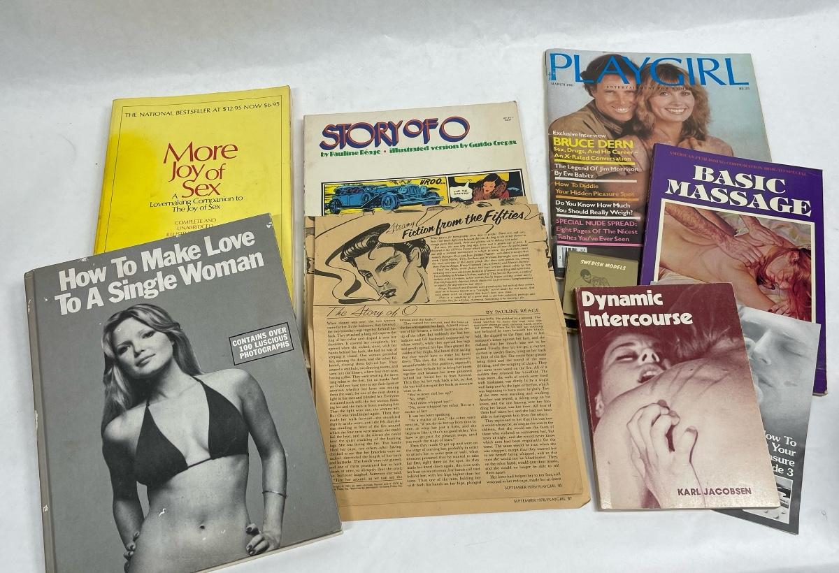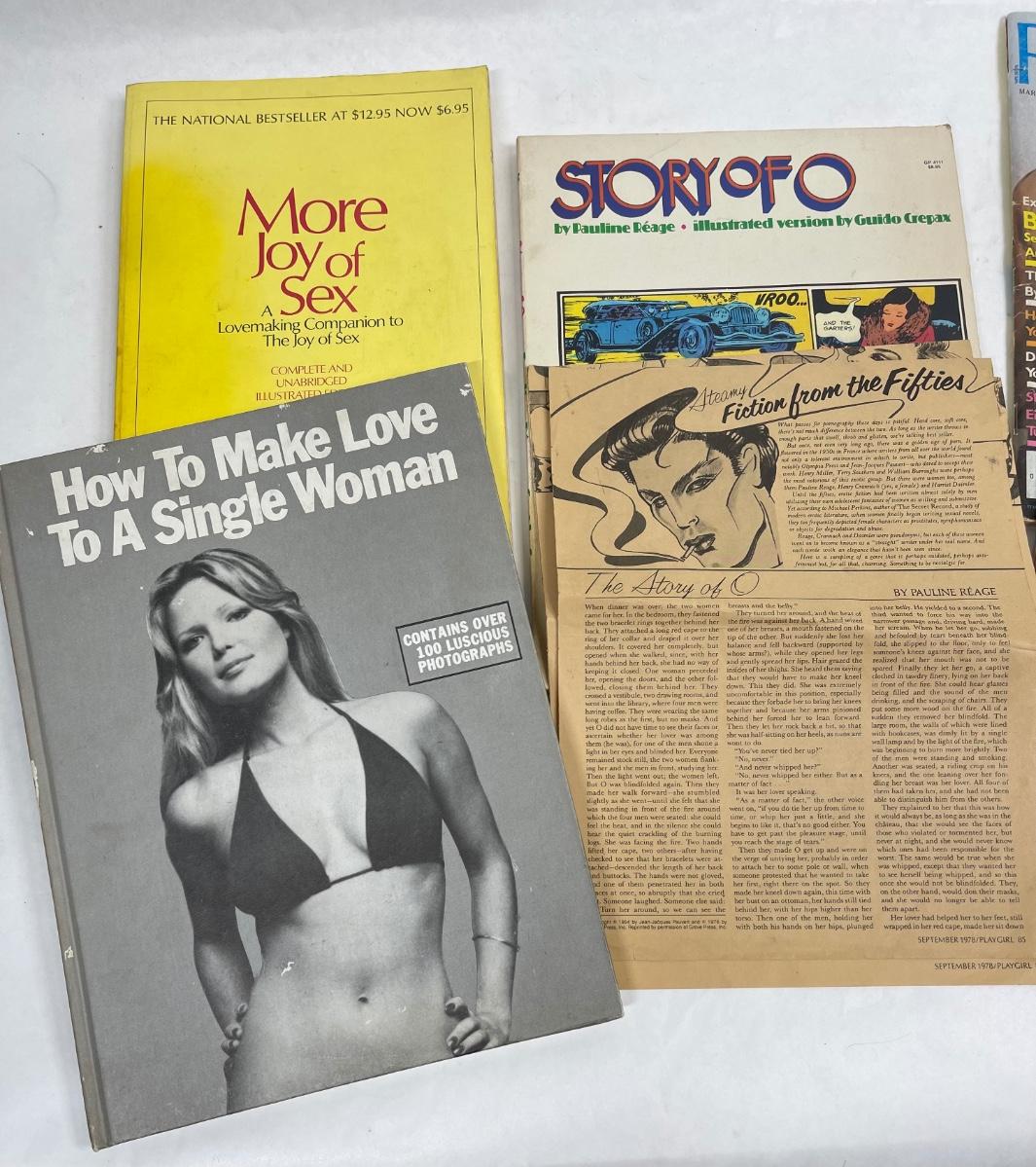 Classic vintage erotica, dating and romance items: Includes a copy of a 1977 Playgirl magazine, More Joy of Sex, Massage guide, How to Make Love to the Single Woman, and more. Most are from the 1970's.