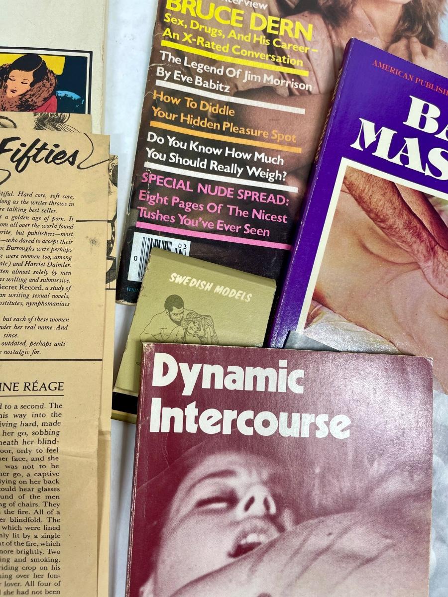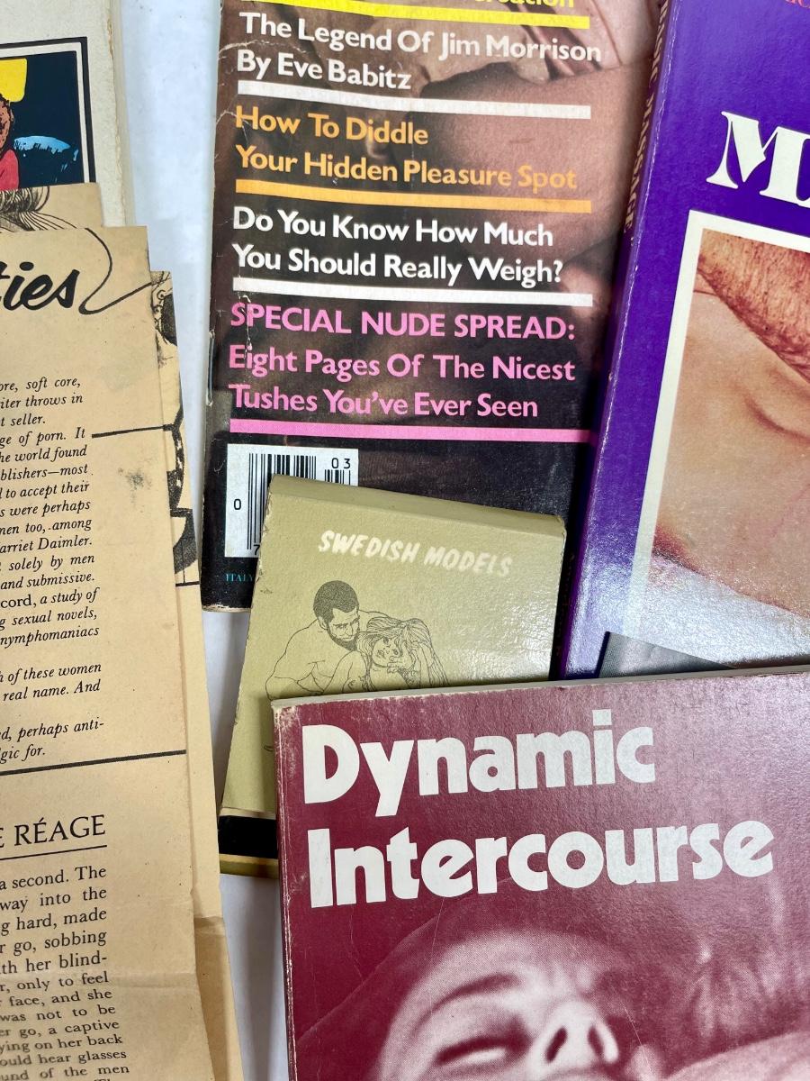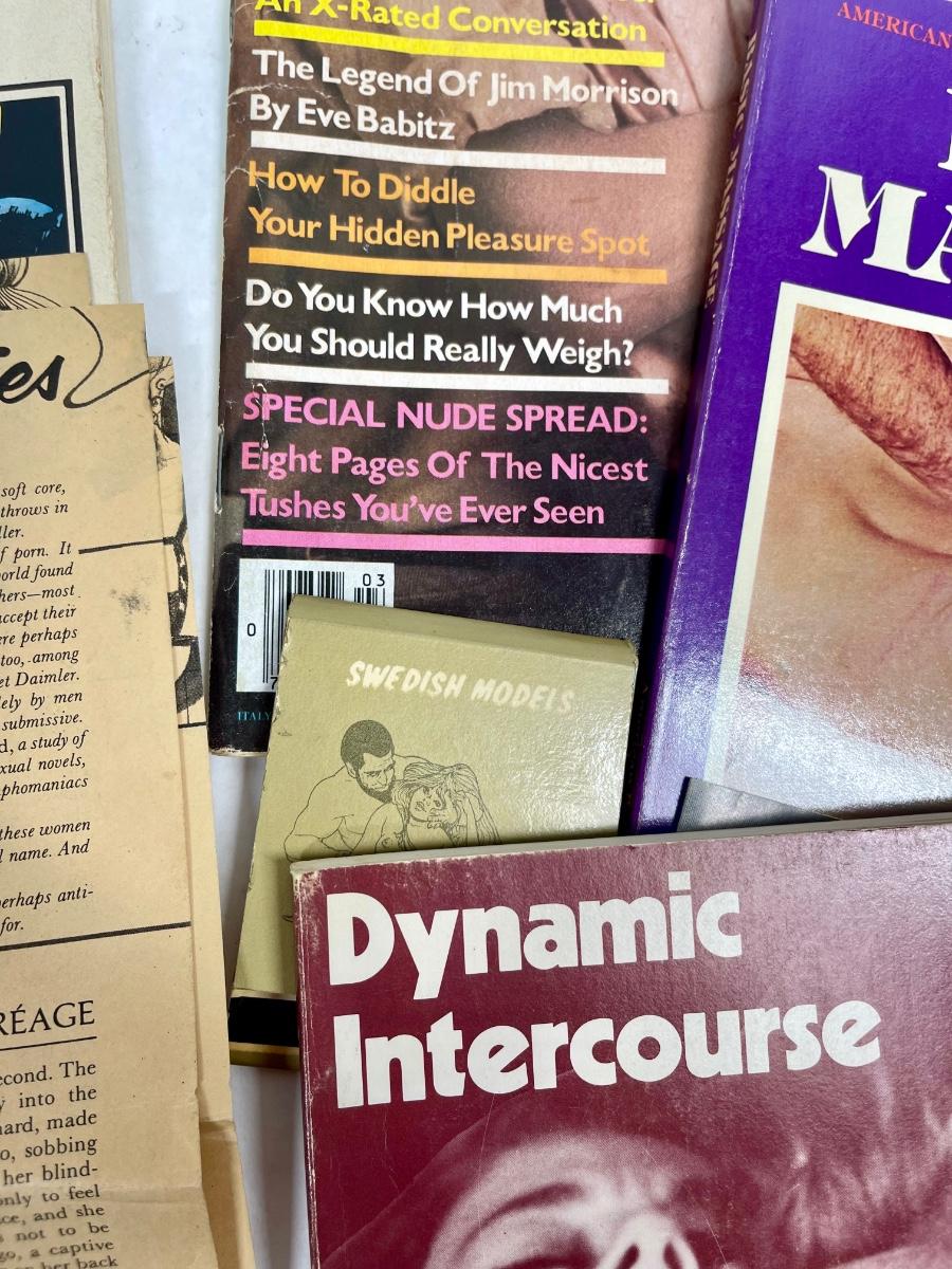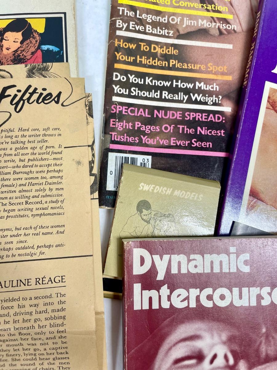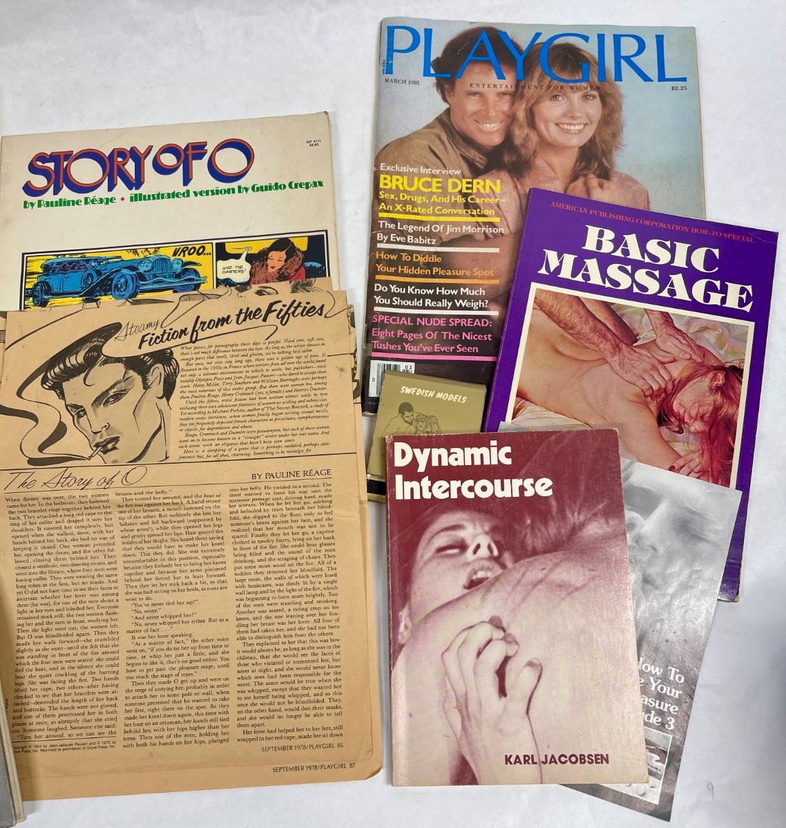 Classic vintage erotica, dating and romance items: Includes a copy of a 1977 Playgirl magazine, More Joy of Sex, Massage guide, How to Make Love to the Single Woman, and more. Most are from the 1970's.