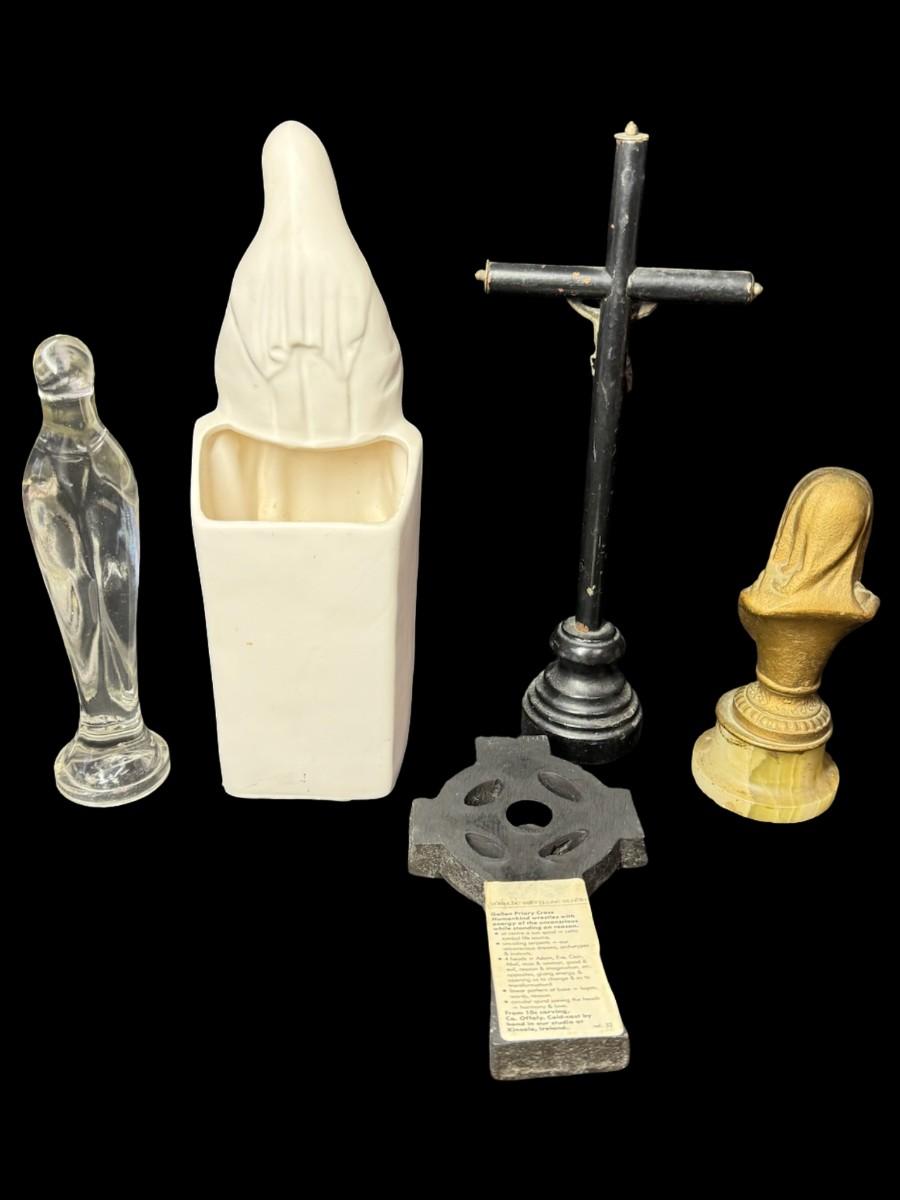 Includes a Virgin Mary bust, a cross, a crucifix, and more. Total of five pieces. Measurement of largest: 10.5”H (crucifix). [BK]