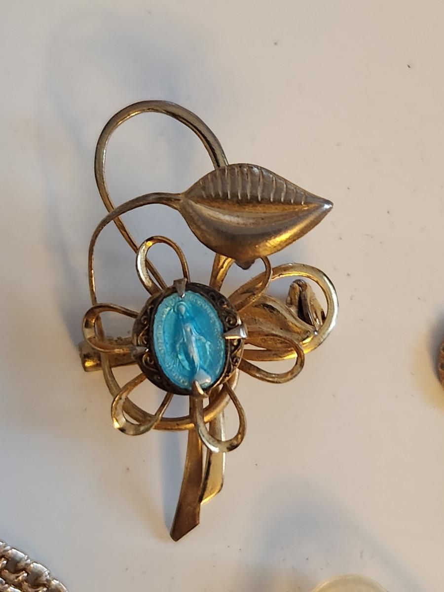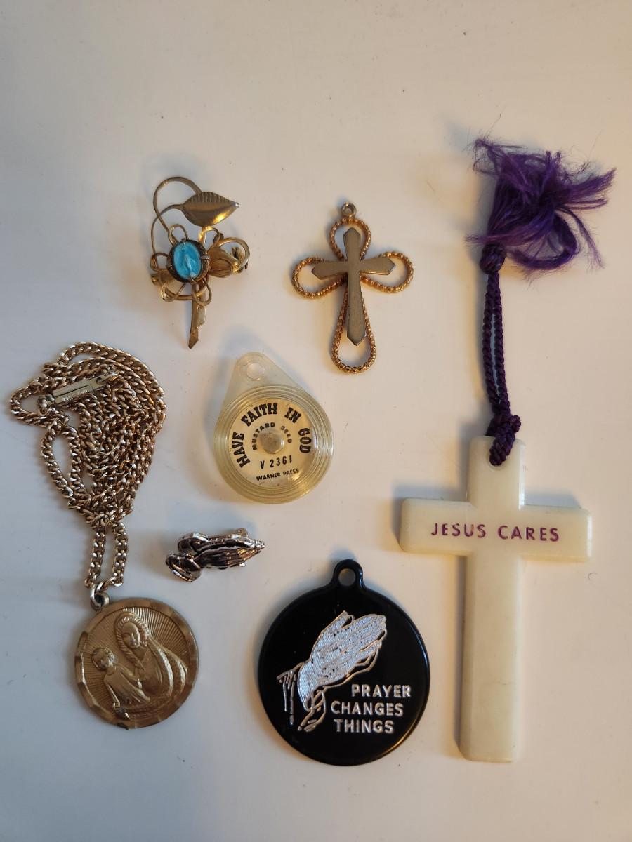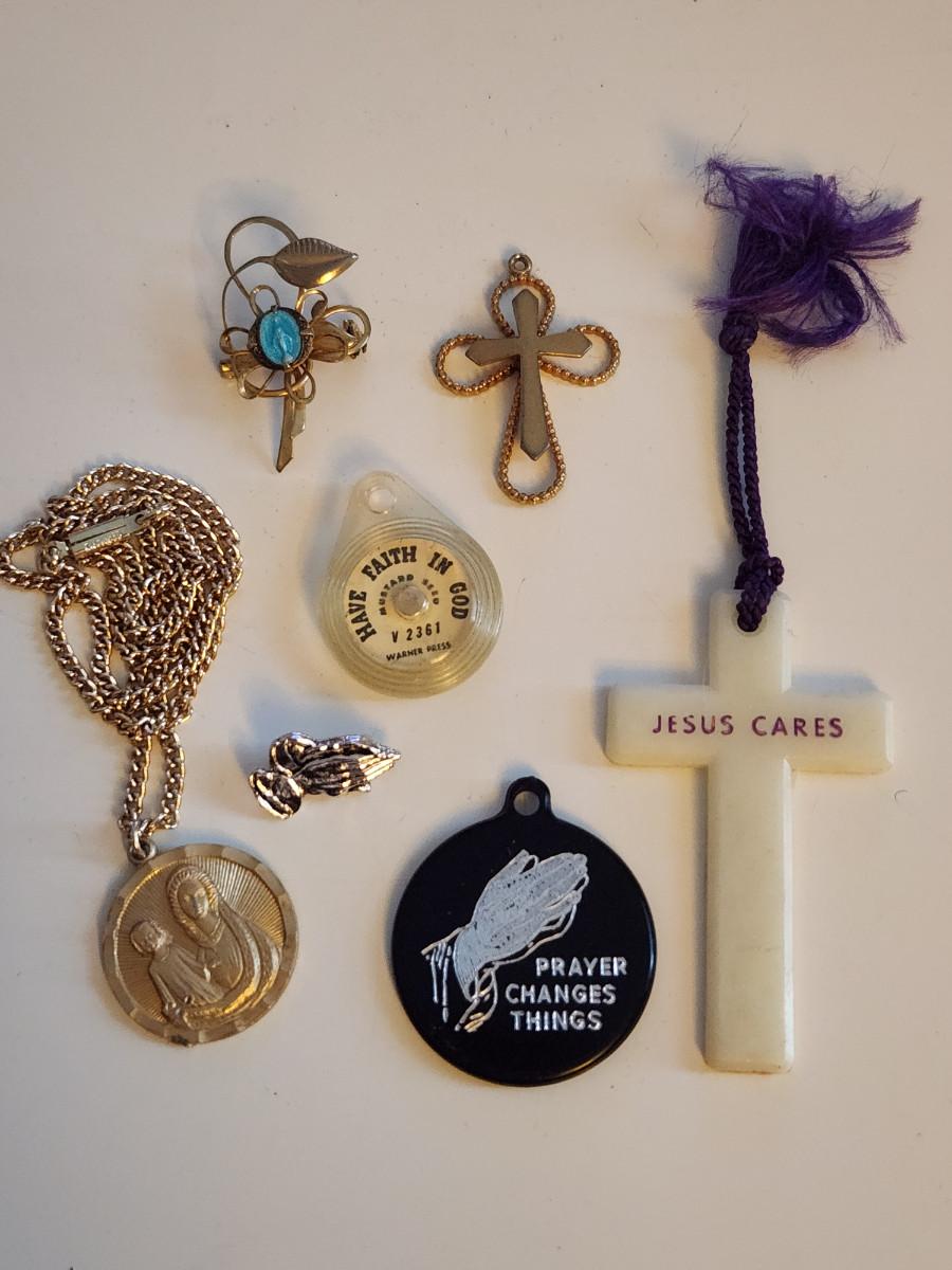 This lot is for a gathering of Vintage Religious Items. Includes crosses, praying hand and a mustard seed, plus a sweet Mary pin and a Madonna and Child necklace.